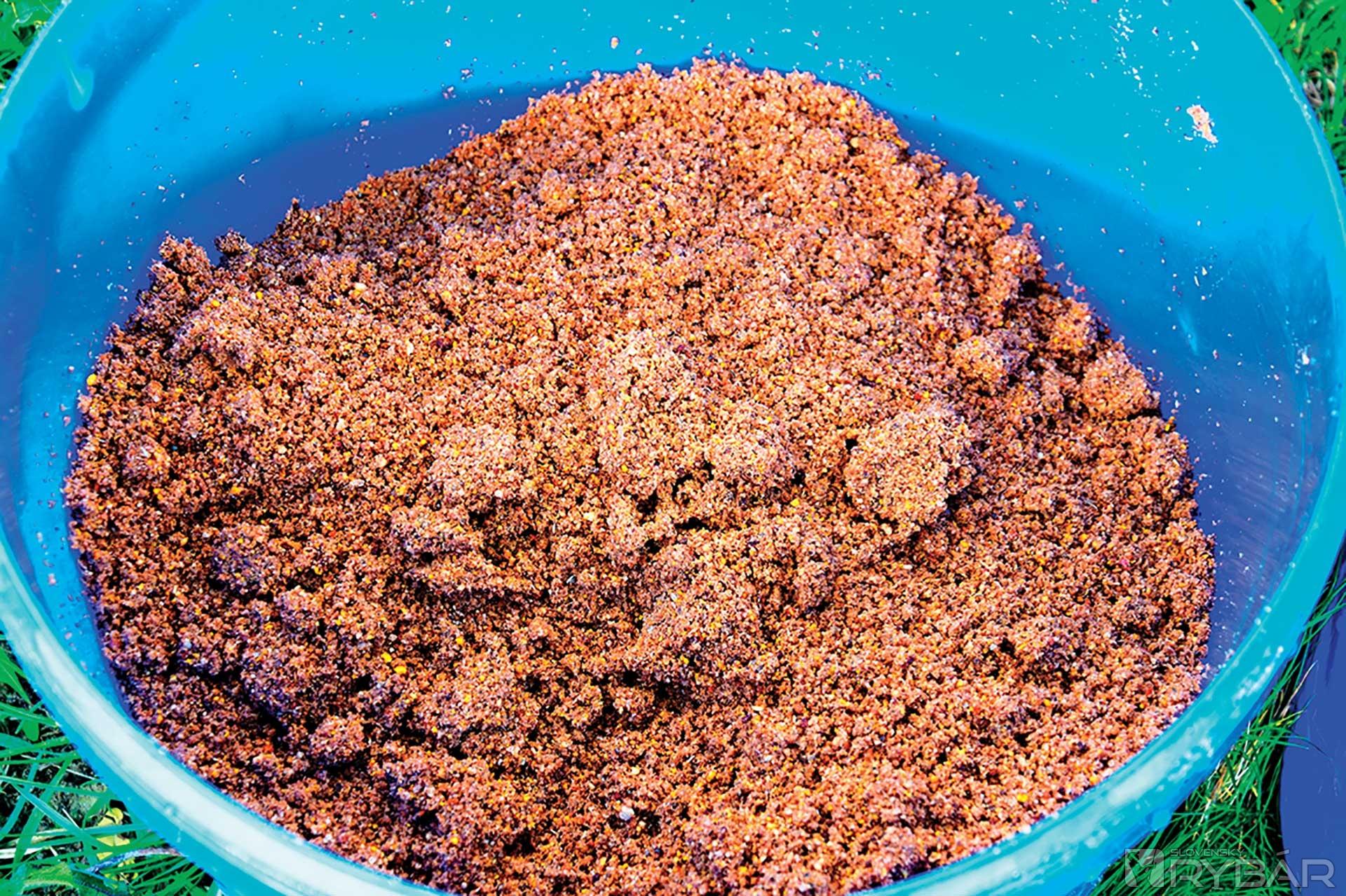 V priebehu pár minút sme si obsadili svoje miesta a rozložili si rybárske veci. Začal som sa venovať mladému rybárovi a vysvetlil mu, prečo práve tu budeme loviť. Chystáme sa loviť karasy a tie majú rady zarastené miesta vo vode; zdržiavajú sa s obľubou v blízkosti tŕstia a tráv, obľubujú aj mierne zabahnené miesta kde hľadajú prirodzenú potravu, patentky. A naše miesto nahadzovania bolo práve také, že tam boli kríky, tŕstie, stromy. Prišlo na rad miešanie krmiva. Na dnešný lov karasov som si vybral krmivo Gold Feeder Pleskáč. Áno dobre čítate, pleskáč. Toto krmivo je dostatočne sladké, ale zároveň aj korenisté a chutí pleskáčom, karasom a aj kaprom. Postup miešania krmiva, vlhčenia krmiva, pridávanie tekutej arómy som Romankovi vysvetlil a potom som ho nechal aby to sám začal robiť a ja som iba kontroloval či to robí správne a, samozrejme, fotil som celý proces miešania krmiva, ktorý bol takýto: