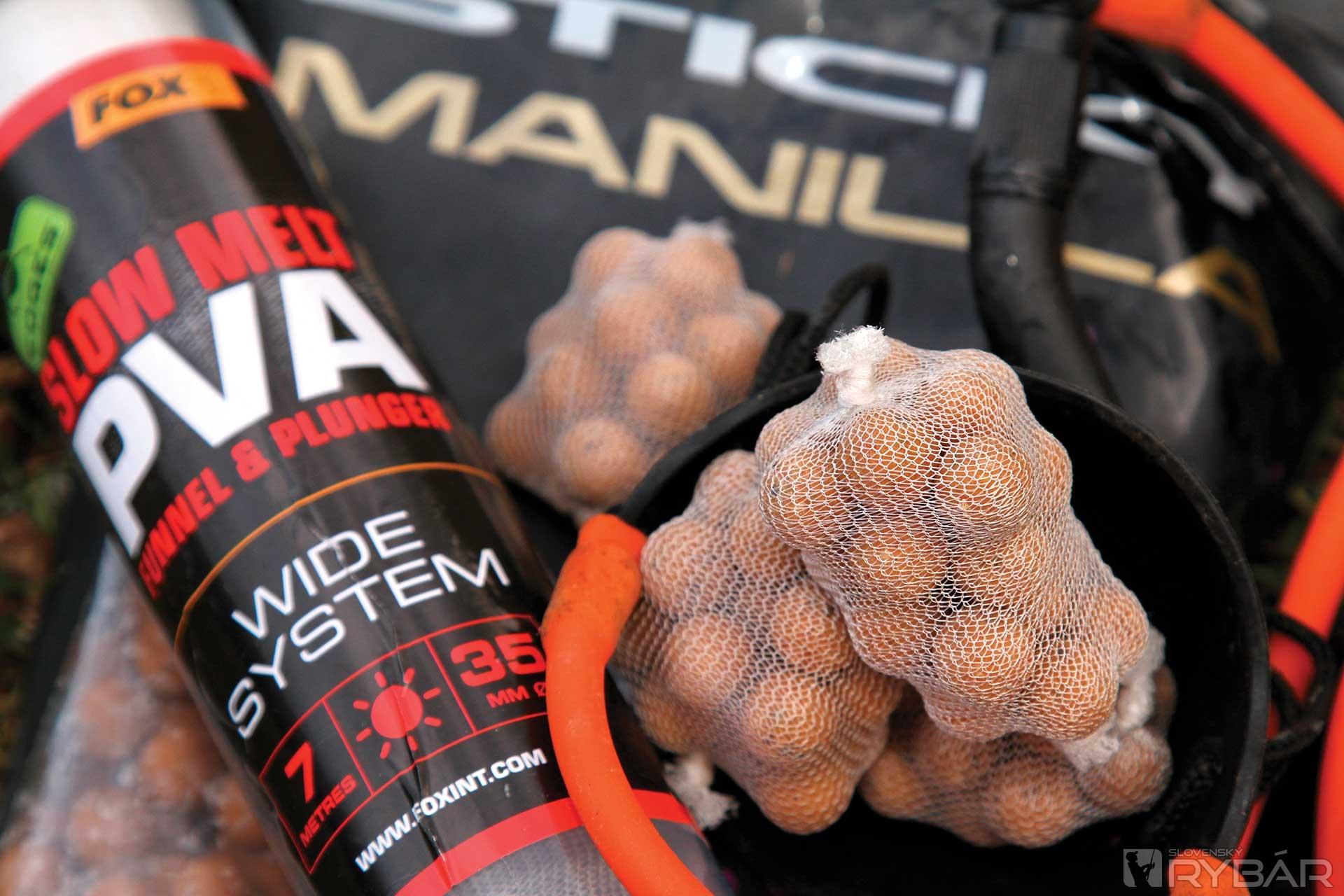 Ukrajina vyhrala podujatie World Carp Fishing Championships s PVA pančuchami, ktoré nahadzovali do extrémnych vzdialeností. Zhotovovali veľmi malé balíčky a používali malé nástrahy, aby dosiahli značnú vzdialenosť, aj keď bolo dno pokryté hustým detritom a smradľavým bahnom, avšak PVA‑čka znamenali jednoznačný rozdiel v úspešnosti. Je ľahké zabudnúť, že kapor vníma čuchom a zrakom, pričom ten druhý je slabší zo zmyslov, takže ak mu v oblasti nástrahy ponúknete niečo naozaj voňavé, máte väčšiu šancu na záber. Aj keď mám obľúbené farby nástrah, stále si myslím, že vôňa a chuť sú omnoho dôležitejšie a malý PVA valček, alebo vrecúško sú absolútne najlepšou cestou na dosiahnutie úspechu. Sú aj viac dôležité aspekty, ktoré treba mať na mysli pri PVA, najmä pri „stick‑och“ a to čo do nich a na ne dáte. Fox vyrába dva druhy PVA pančúch, podľa toho, či chytáte v studenej, alebo teplejšej vode. Produkty do studenej vody sú jemnejšie s trochu inou štruktúrou, čo má za následok rýchlejšie rozpúšťanie, oproti „hustejšej“ verzii do teplejšej vody. Takže, ak máte príliš olejovitý mix, rozpadnutie PVA môže trvať dlhšie. Stáva sa to najmä v období, keď vode trochu trvá, kým sa zohreje. Čím dlhšie sa olej vsakuje do PVA, tým dlhšie trvá jej rozpad, nehľadiac na to, aký typ PVA používate. Často vídavam ľudí, ako namáčajú PVA balíčky do rôznych olejov a dipov, čo takisto predlžuje dobu rozpadu. Je to aj prípad hustých, ťažkých tekutín, ktoré s obľubou všetci používame, pretože sú náramne super. V prípade veľmi hlbokých revírov to pokojne použite, ale v zásade potrebujeme, aby sa PVA‑čko rozpadlo čo najskôr a lákalo ryby.