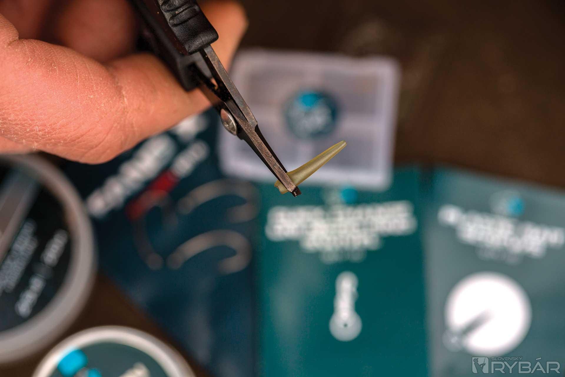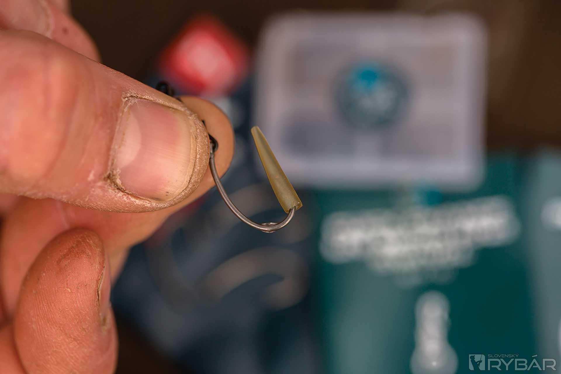 3. Hrot háčika navlečieme do prevleku, musíme dávať pozor, aby sme plast nepoškodili protihrotom.