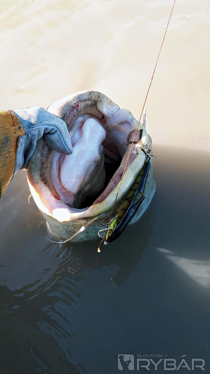 Dohodli sme sa, že už ideme preč. Ešte sa splavíme pomalým prúdom až pod pilier a pálime domov, stačilo. Ako ideme dole, približne 30 metrov pred pilierom na sonare akoby vidieť pri jednej hrane dlho hľadané „klobásky“ (echo asi sumcov). Tak nahodím hore prúdom a malým pridvihovaním splavujem nástrahu po prúde. Cítim jemnú zmenu pri dopade (asi to bude tá hrana) a hneď cítim aj jemný ťuk. Žiaden bum, nejaký divoký záber, ale ako keby zubáč. No pri záseku je hneď cítiť, že ryba je to dobrá, smeruje hore prúdom a ťahá aj cez cievku, čo je fajn.