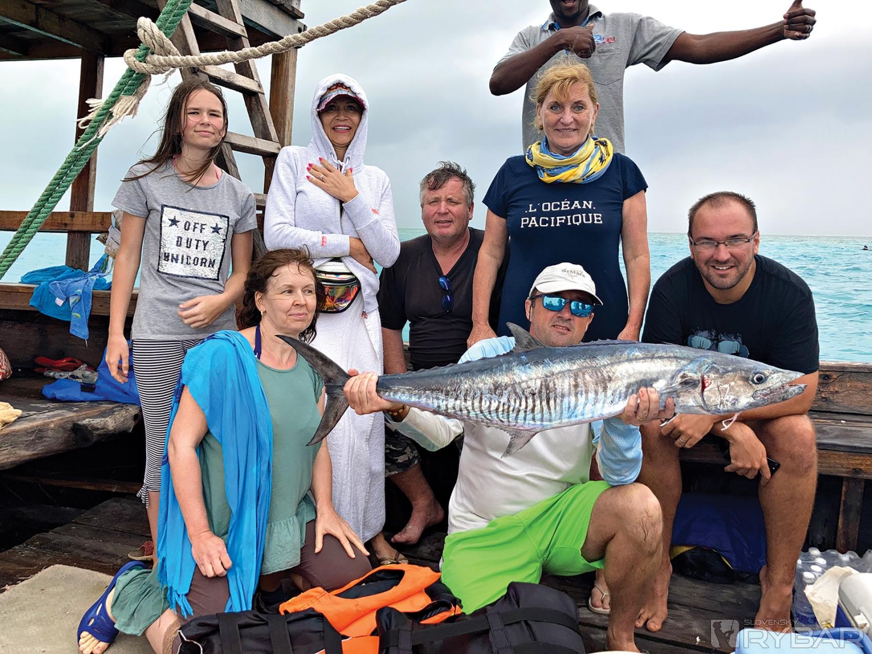 Časť našej skupiny smerujúca k ostrovu Mnemba na šnorchlovanie. Ako bonus sme cestou chytili na trolling túto King Fish. Vďaka ti, sv. Peter!