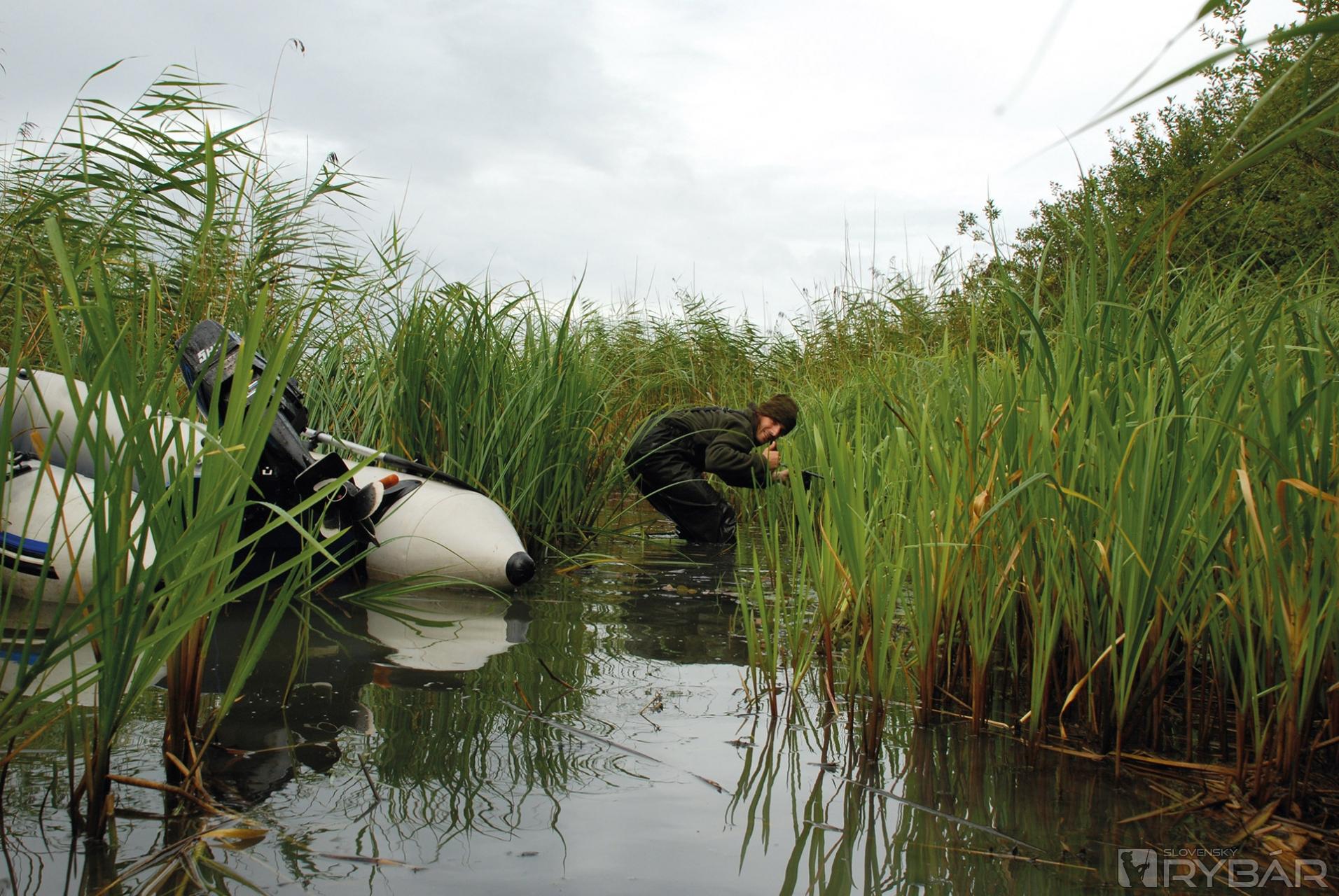 Druhý deň prišiel prvý záber. Ryba si celkom slušne brala a mňa čakalo trstinové dobrodružstvo. Dvadsaťmetrový pás tŕstia siahal až do 1,5 - 2 m. Skočil som do vody, podberák zavesil na hlavu a začal sa brodiť šachorinou. Zastavil som sa, až keď mi voda začínala tiecť do prsačiek. Vľavo, vpravo i predo mnou bola trstina. Kapor, samozrejme, vypálil do boku, priamo do nej. Tak, a som v prde..., hovoril som si. Kapra bolo počuť v tŕstí, pekne hlboko. Položil som prút do hustých stebiel a šiel do miest, odkiaľ som počul čľupot...