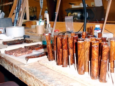 Trevor nás previedol celou výrobou - od uhlíkových zmesí /používajú päť druhov, základná surovina je zakonzervovaná v chladiacich boxoch/, cez pražiareň blankov, kde technológia silno pripomína pečenie cukrárenských šamronov. Keď sa z ,,upečeného“ blanku vytiahne kužeľová kovová forma, základná časť prúta je na svete. Nasleduje ručné brúsenie, kontrola, ďalšia povrchová úprava, pri ktorej tmavý uhlíkový blank získava typickú modrú farbu.