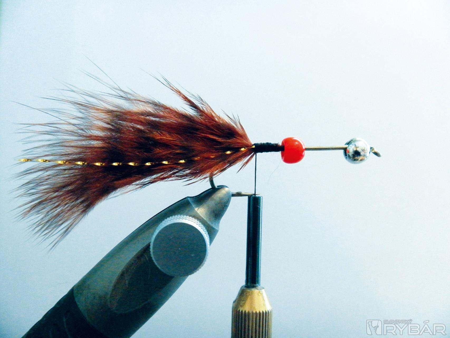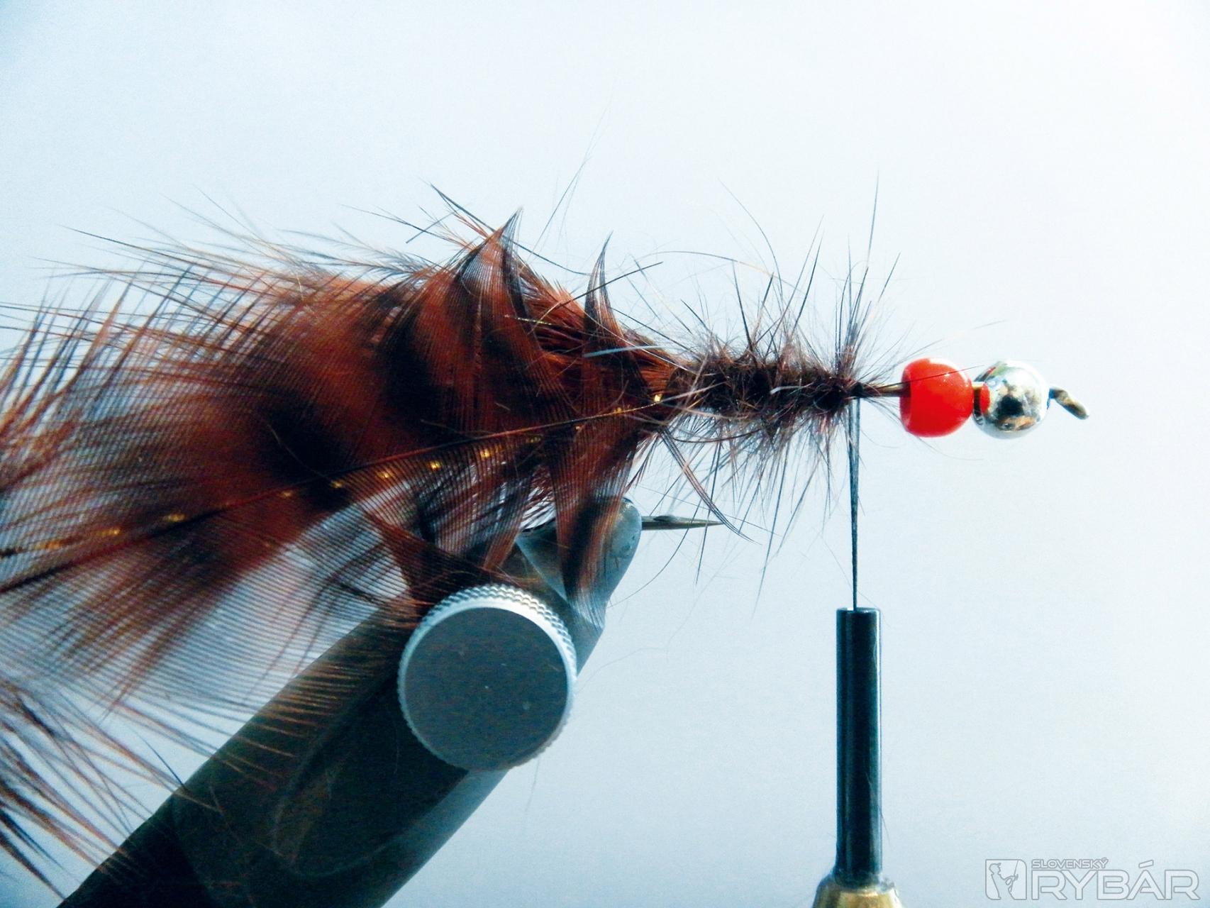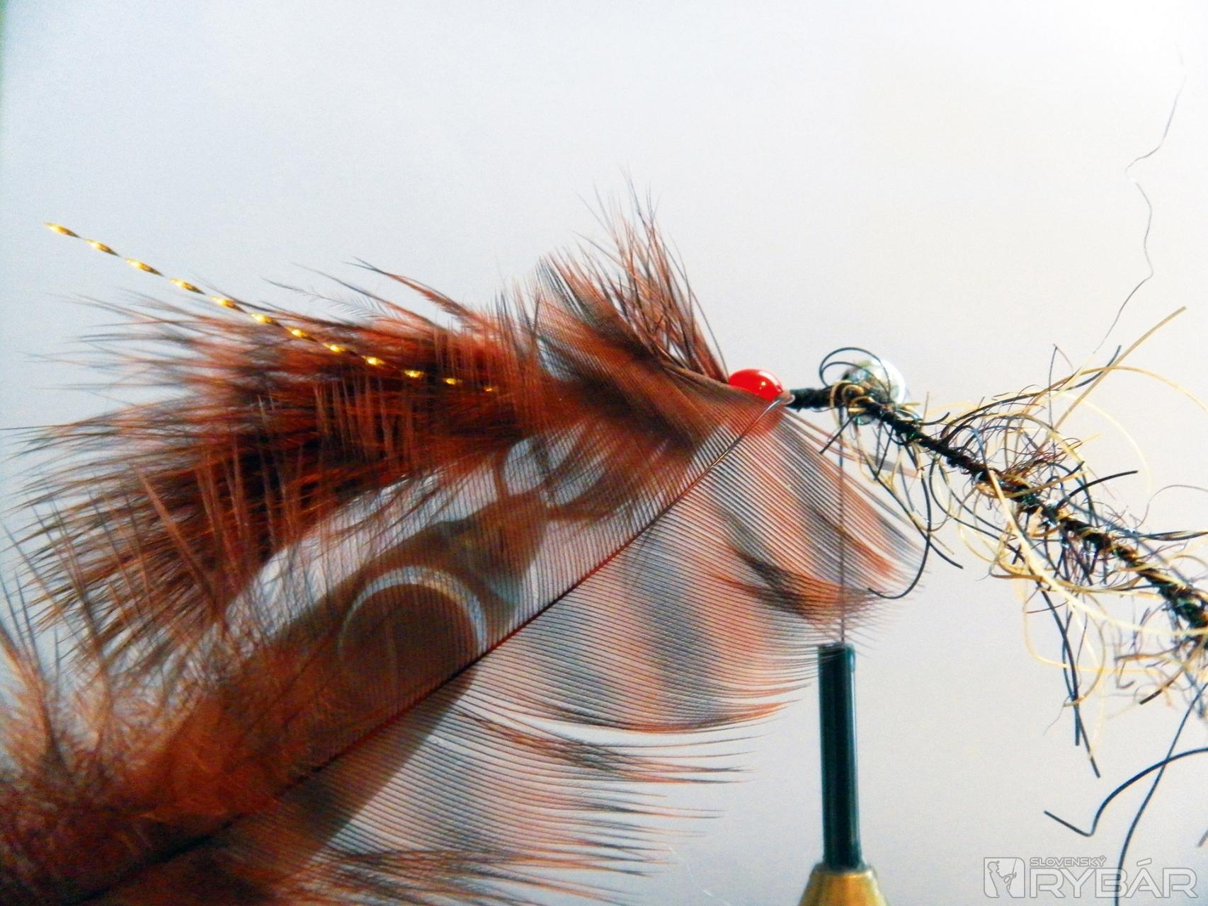 strímrový háčik č. 6, tungstenová hlavička 4,6 mm (strieborná a fluoro-oranžová), kohútie grizzly marabu (hnedá farba), perie z grizzly kohúta (sedlový skalp), dubbing zo zajaca (hnedá farba), spectra hair (zlatá farba), rishi brush (hnedá/škoricová farba), čierna viazacia niť