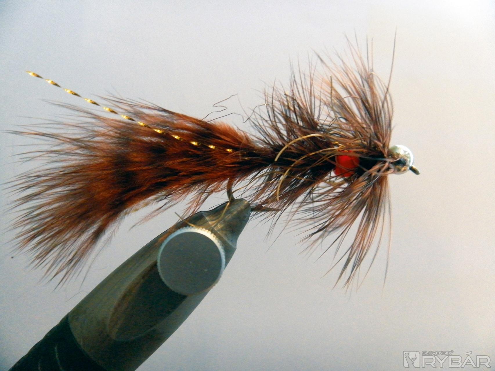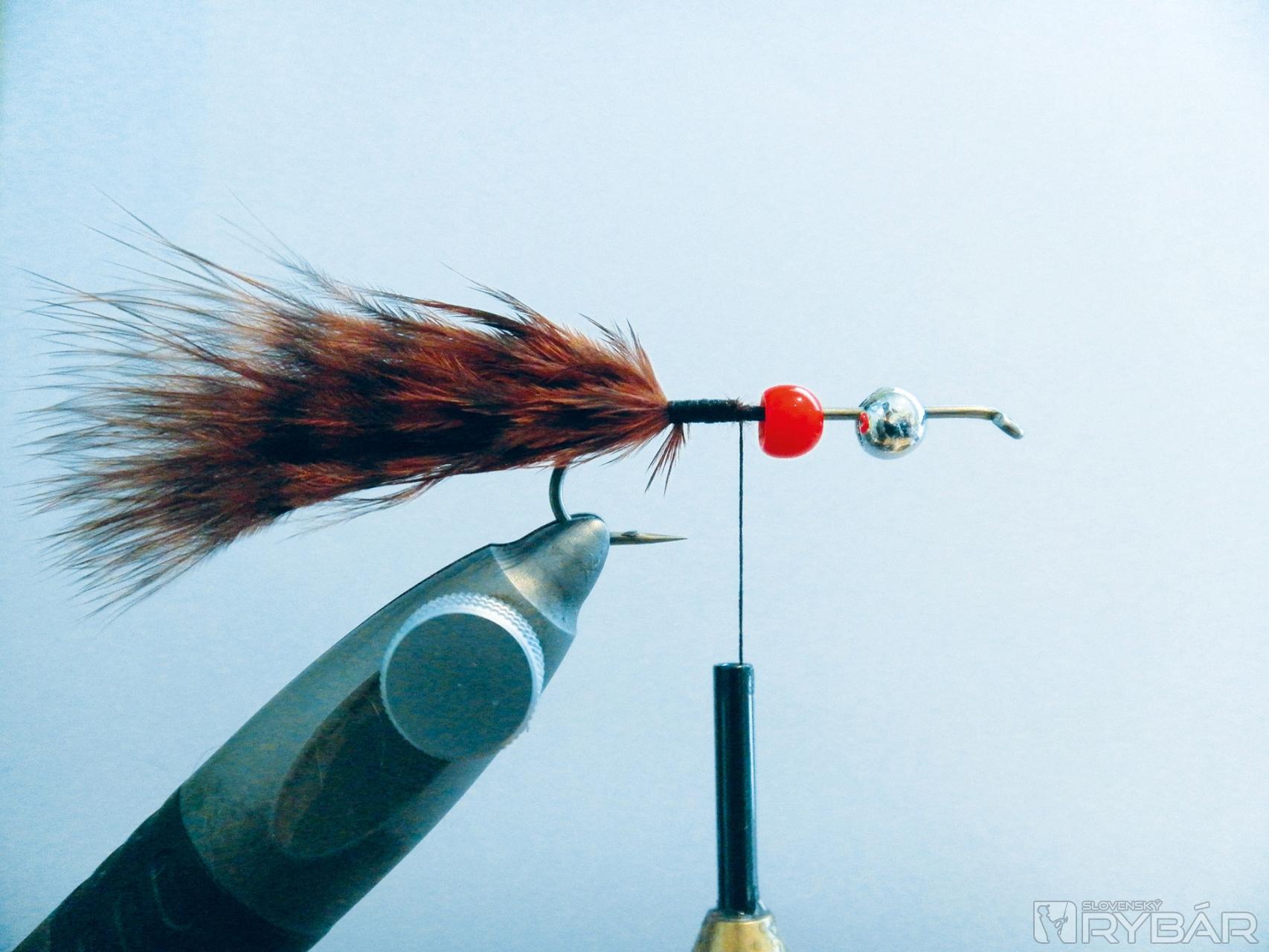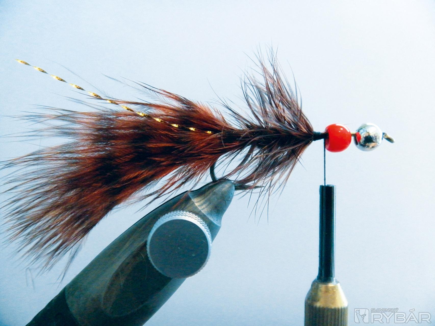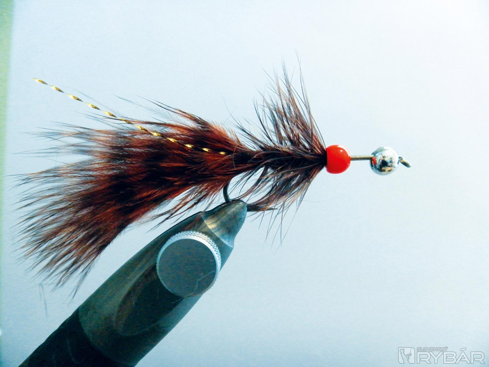 strímrový háčik č. 6, tungstenová hlavička 4,6 mm (strieborná a fluoro-oranžová), kohútie grizzly marabu (hnedá farba), perie z grizzly kohúta (sedlový skalp), dubbing zo zajaca (hnedá farba), spectra hair (zlatá farba), rishi brush (hnedá/škoricová farba), čierna viazacia niť