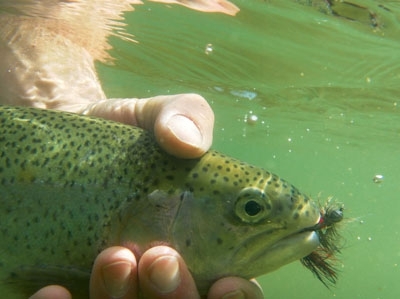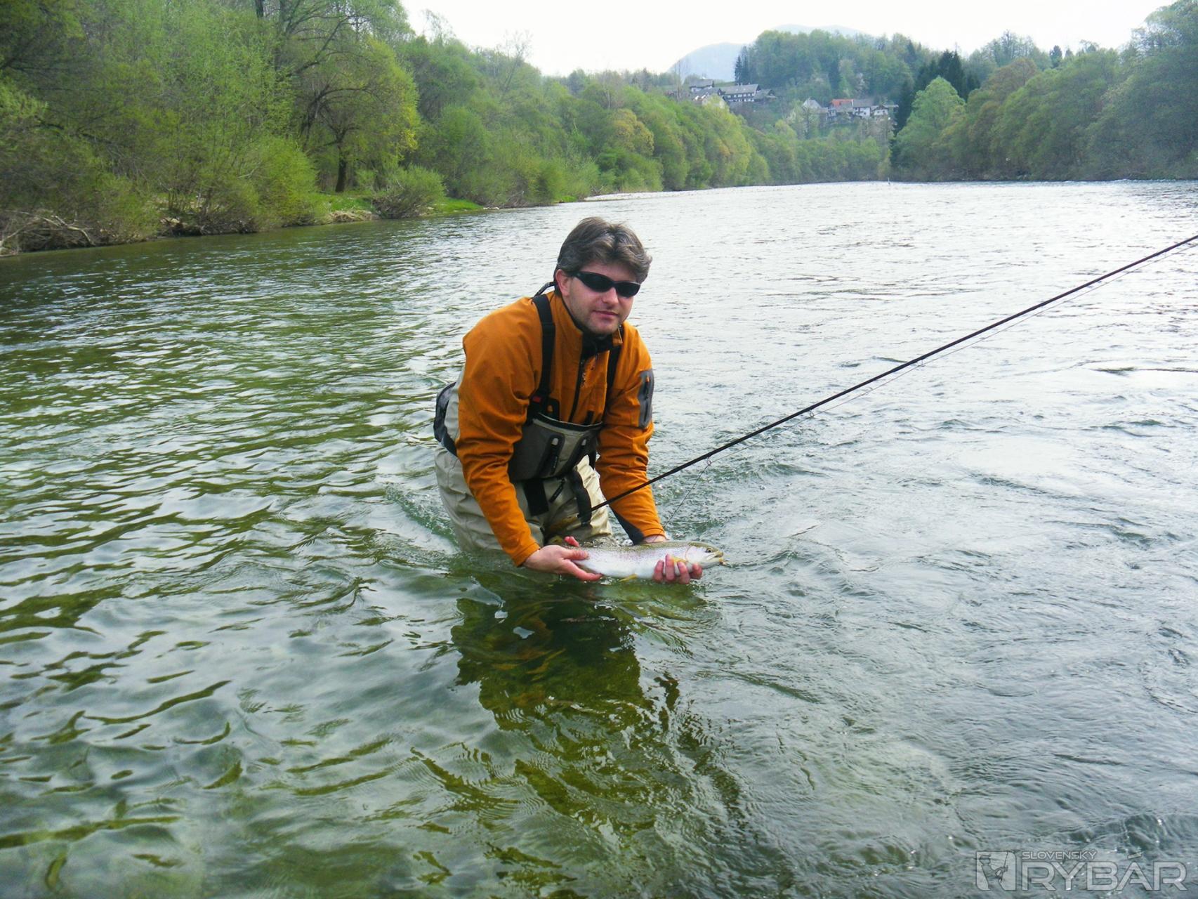 Na mieste pozorujeme rojenie májoviek a prekrásne pasenie pstruhov. Zakrátko sme už zabrodení asi 20 metrov pod splavom a pokúšame šťastie na suché mušky. Darí sa nám chytiť niekoľko lipňov. V splave sa však ukazujú krásne pstruhy, meníme jemné muškárske prúty za vyššie aftmy – 6 a 7 s potápavými šnúrami (rýchlosť potápania 6). Na konci zostavy máme ťažké strímre, zaťažené dvoma tungstenovými hlavičkami, pre rýchlejšie postupné klesanie. Všetky väčšie ryby sú tesne nad dnom a pokiaľ strímer pláva v stĺpci rieky dosť plytko, ryba vôbec nejaví záujem prenasledovať nástrahu.