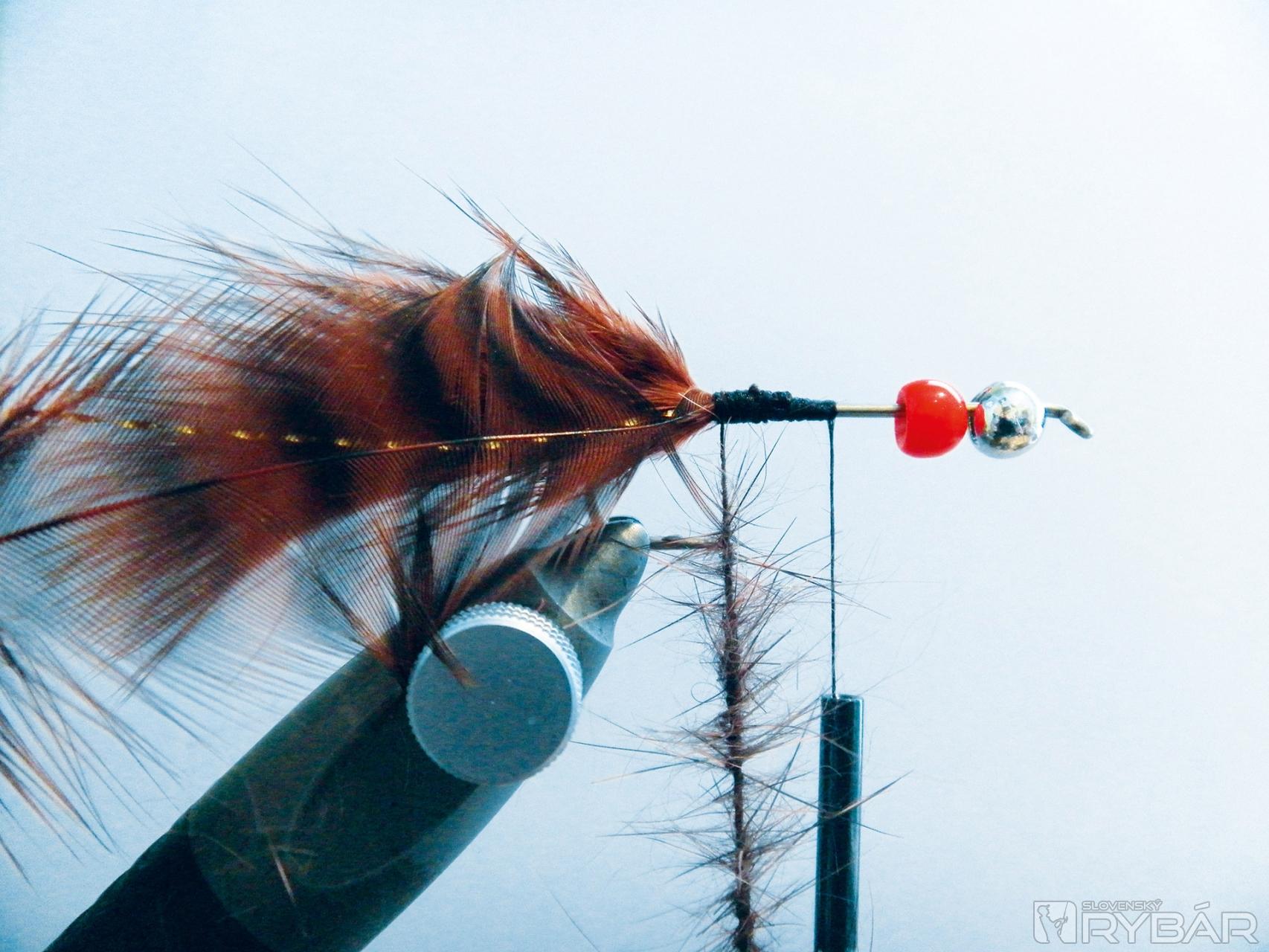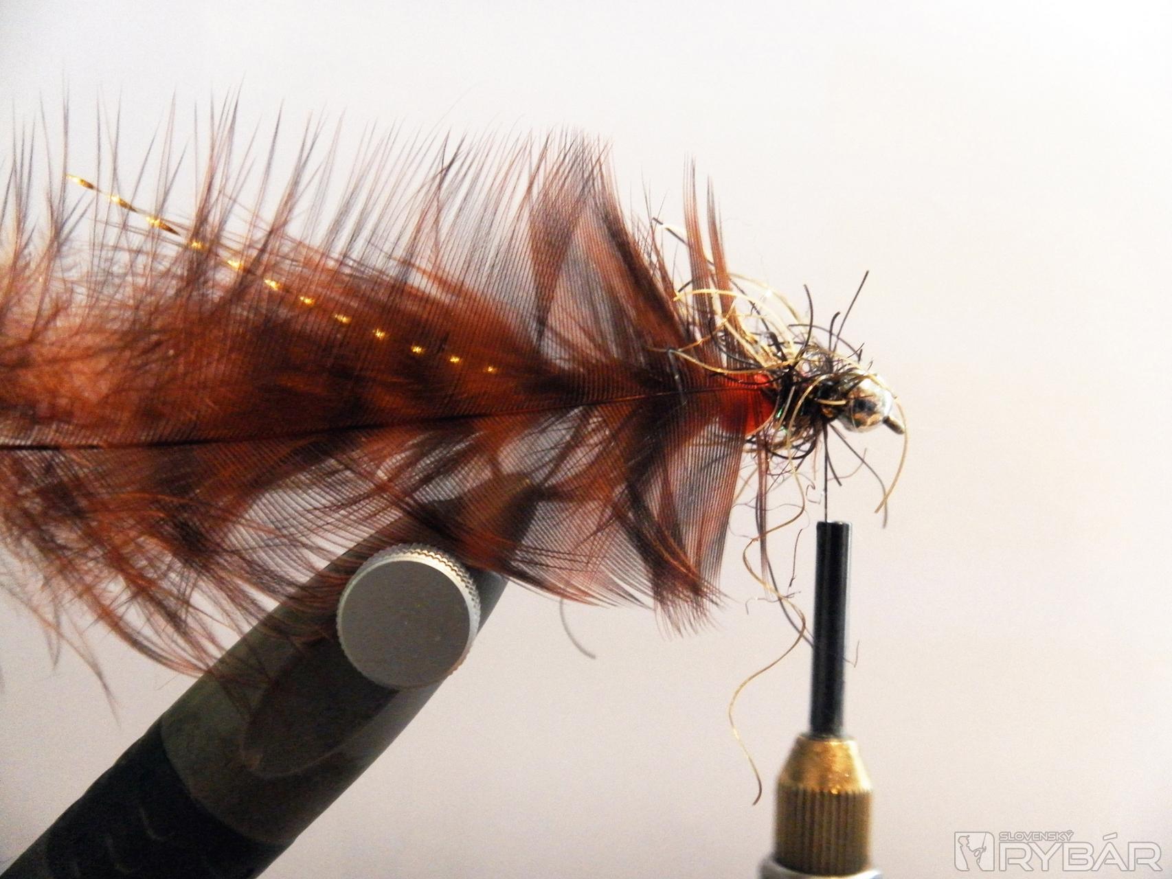 Základnou niťou priviažeme sŕpok z kohúta a rishi brush, ktorým vytvoríme telíčko strímra.