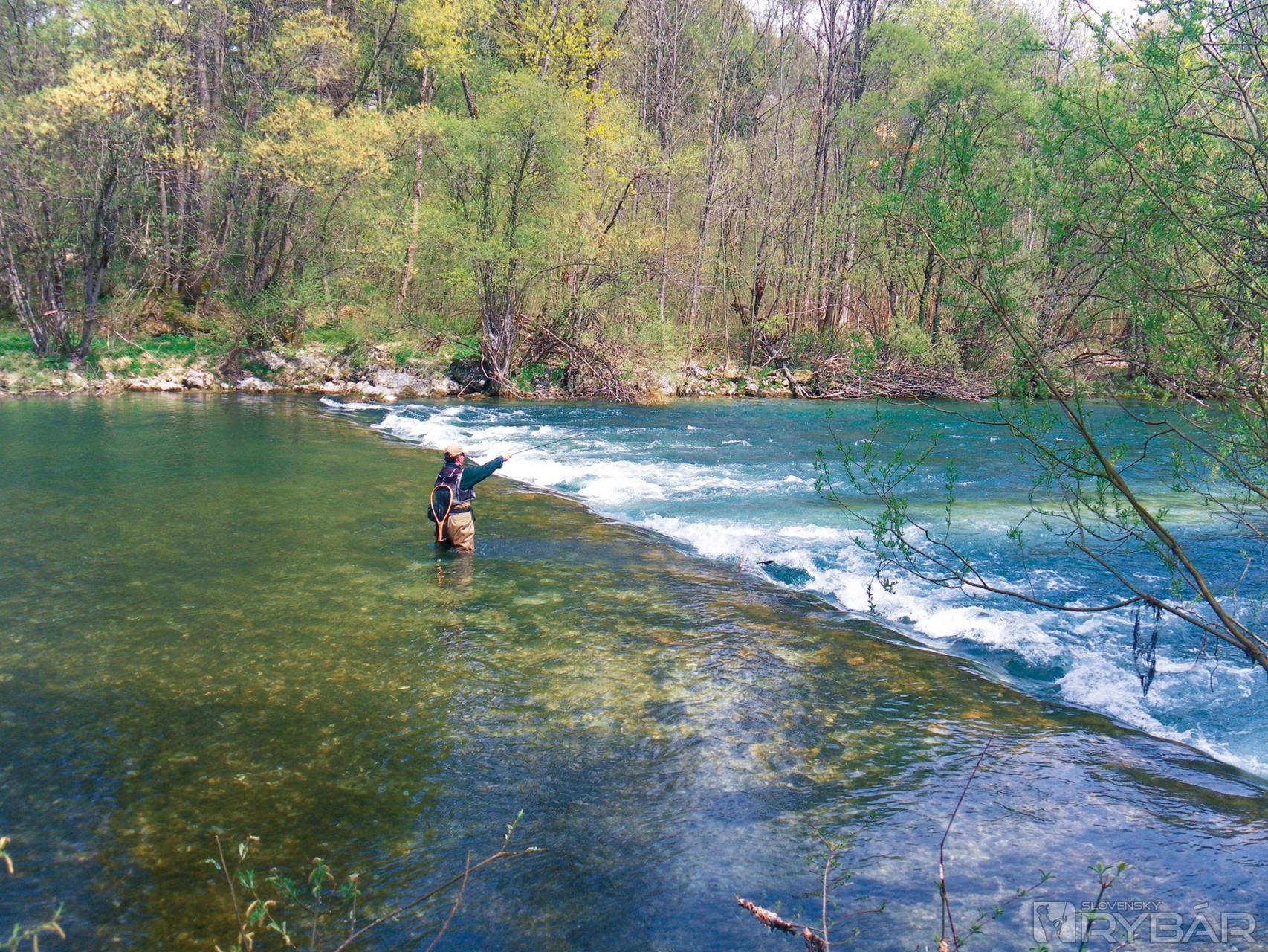 Ráno vyrážame do rybárskej predajne, kde už má Matej pre nás pripravené povolenia. Krátky rozhovor, kde je momentálne najlepšie ísť muškáriť a vyrážame. Matej nám odporučil skúsiť pod „trophy“ úsekom, ktorý sa začína menším splavom a pokračuje do tiahlej hlbočiny; vynikajúce miesto na strímrovanie.