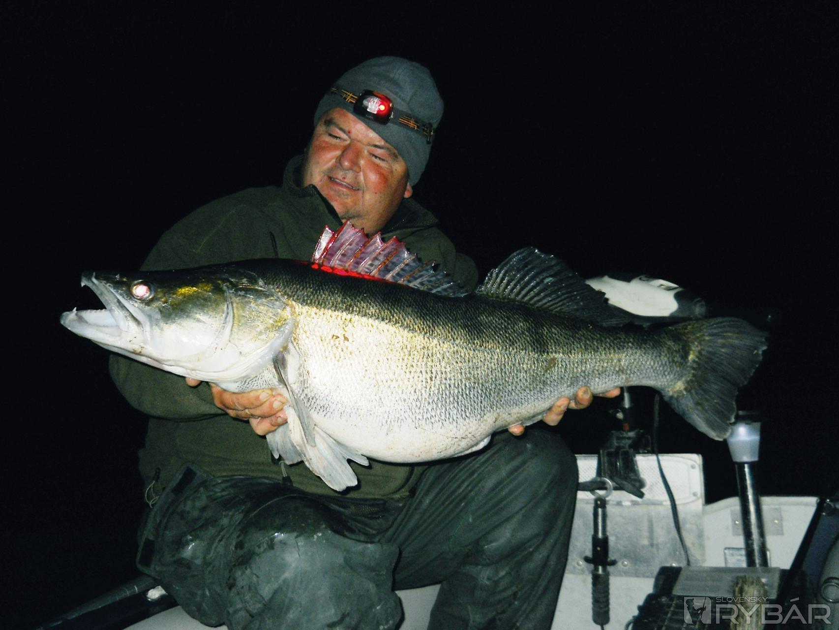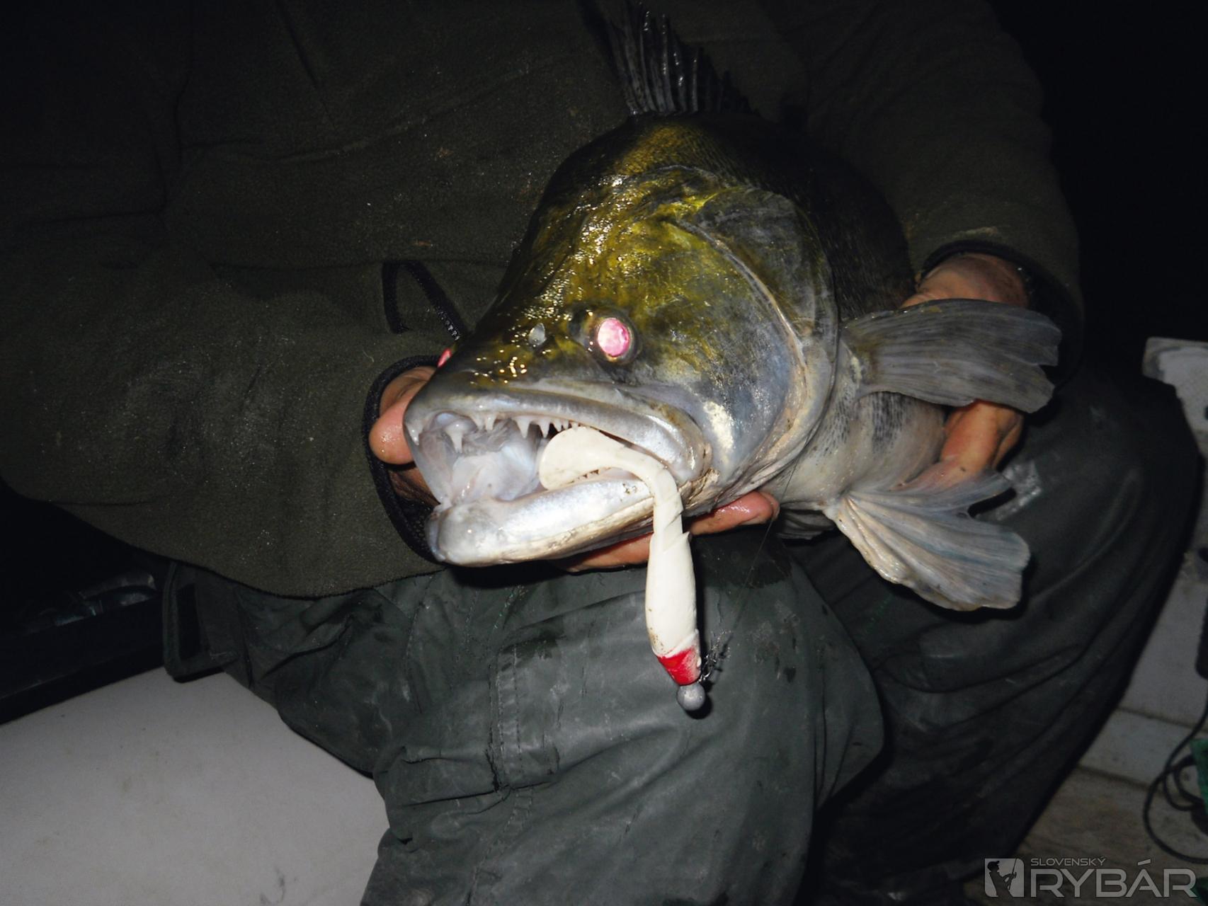 Poslednýkrát som otvoril kufrík a vo svetle čelovky hľadal nástrahu, ktorá by bola o čosi väčšia, ale ľahšia. V množstve nástrah mi pohľad padol práve na lastovičku!! V tom okamihu sa „TO“ stalo. Neviditeľná ruka viedla tú moju a tá sa ani v najmenšom nepriečila ... v duchu som jasal - „čiperka, veď presne akurát teba hľadám“. Keď už bola lastovička uväznená v karabínke, ešte v rýchlosti som letmým pohľadom kontroloval posledný meter šnúry a nahodil. Lastovičku som ťahal po sľubných miestach už ani neviem koľkýkrát, s maximálnou koncentráciou kopíroval členitý terén. Bol som taký zažratý do vedenia nástrahy, že som si zabudol popri tom vychutnávať cigarku, ktorá mi medzitým zhasla. Keď som mal nástrahu takmer pod člnom, odložil som prút a znovu si zapálil zhasnutú cigaru. Vzal som prút do rúk a s nástrahou len tak preklepával miesta tesne pred člnom. A vtedy prišlo to, čo by už snáď nikto ani nečakal! Pocítil som slabulinký kopanec, po ktorom v zlomku sekundy nasledoval môj prudký zásek do niečoho, čo zostalo stáť bez pohybu. Špička prúta, z ktorej pod vodnou hladinou mizlo čoraz viac a viac očiek, nikoho z nás dvoch na člne nenechalo na pochybách, že ide o rybu a nie hocijakú. Kto ma pozná vie, že sa s rybami veľmi nemaznám a málokedy dovolím rybe potiahnuť z cievky. Ináč to nebolo ani v tomto prípade, kde neubehla snáď ani minútka a v kužeľoch svetla pretínajúcich opar nad vodnou plochou ostalo na hladine ležať biele telo zubáča. Na prvý pohľad sa nezdal. Keď sa ale ukázal v celej svojej paráde, ihneď som povolil brzdu navijaka. Bolo však už predsa len dosť chladno, ryba už nebola v plnej kondícii, a tak po chvíli ležal kusisko zubáča vedľa člna. Kliešťami sme zubáča šetrne vylovili a položili na dno plavidla. Až vtedy sme si uvedomili, že sa jedná o kapitálnu rybu, ktorá má určite cez 10 kilogramov a je dosť pravdepodobné, že bude atakovať aj hranicu môjho osobáku. Adrenalín a zima urobili svoje. Ruky sa mi triasli, keď som vo svetle čelovky hodnú chvíľu hľadal meter. So zatajeným dychom som ukladal chvost na čísla, ... do metra veľa nechýbalo. Zubáč meral 94 centimetrov. Osobák sa nekonal, ale to mi vôbec nepokazilo radosť z úlovku. Rýchlo som vzal do rúk telefón a fotoaparát na zdokumentovanie. Urobili sme len zopár záberov, rybu som odhodlane ihneď vrátil vode. Bola to krásne stavaná ikernačka bez jedinej chybičky krásy. Strieborného rytiera som položil na okraj člna a lúčil sa so slovami, nech si dáva na seba pozor a s prianím a nádejou, nech sa ešte dakedy stretneme. Vo svetle čelovky jeho oči žiarili ako veľké perly. Na rozlúčku mi venoval spŕšku ľadovej vody a pomaly, ale isto sa stratil v hlbočine.
