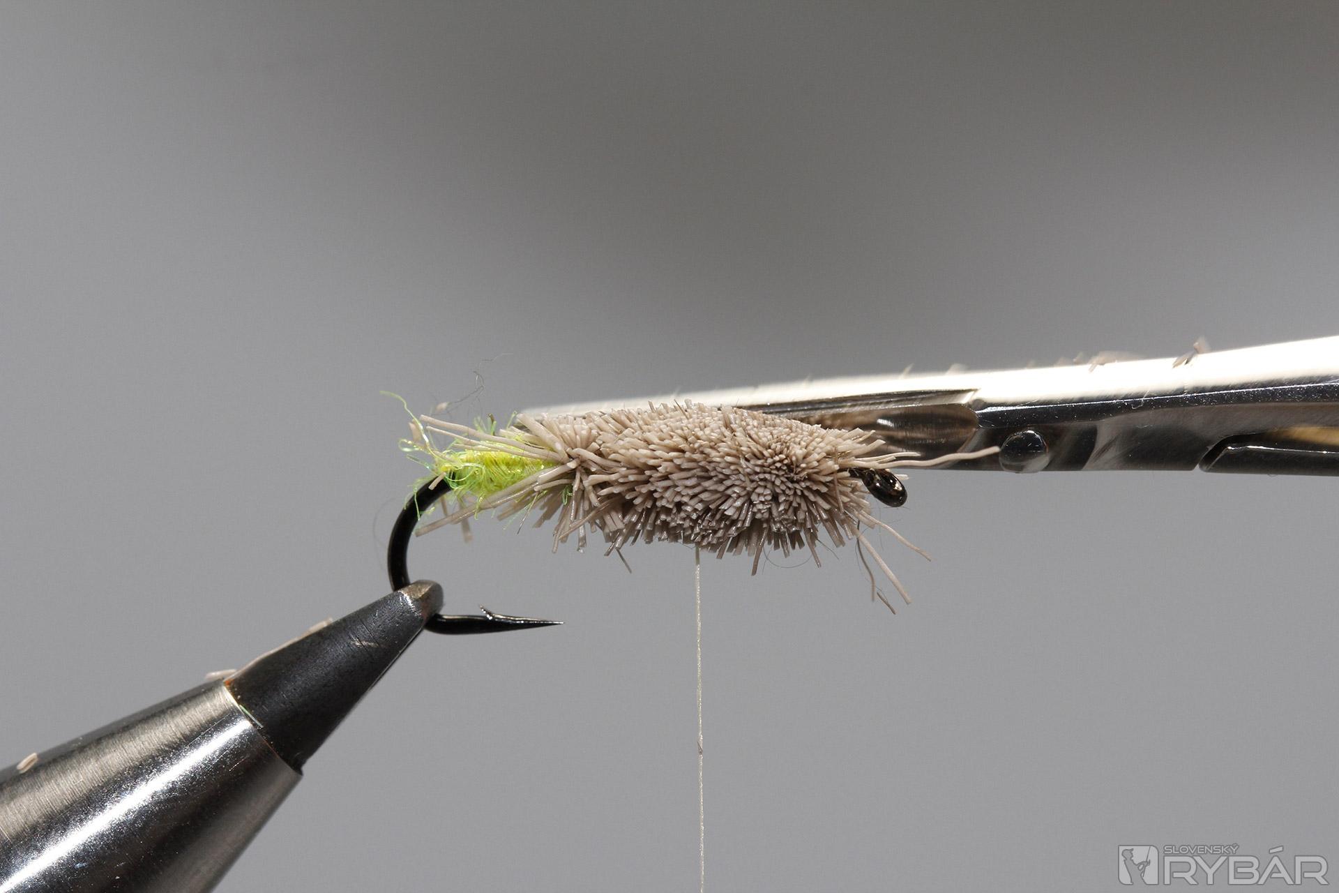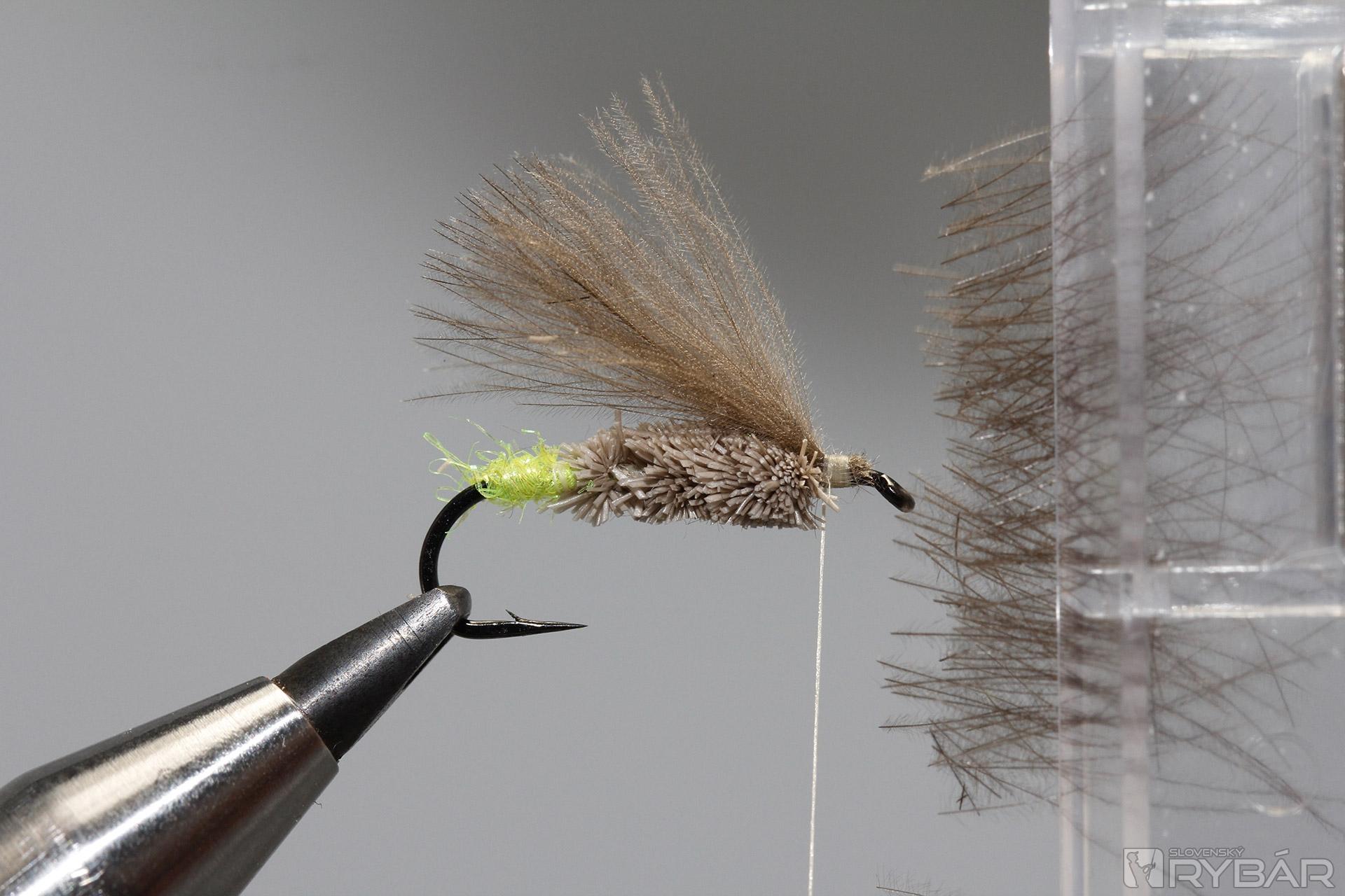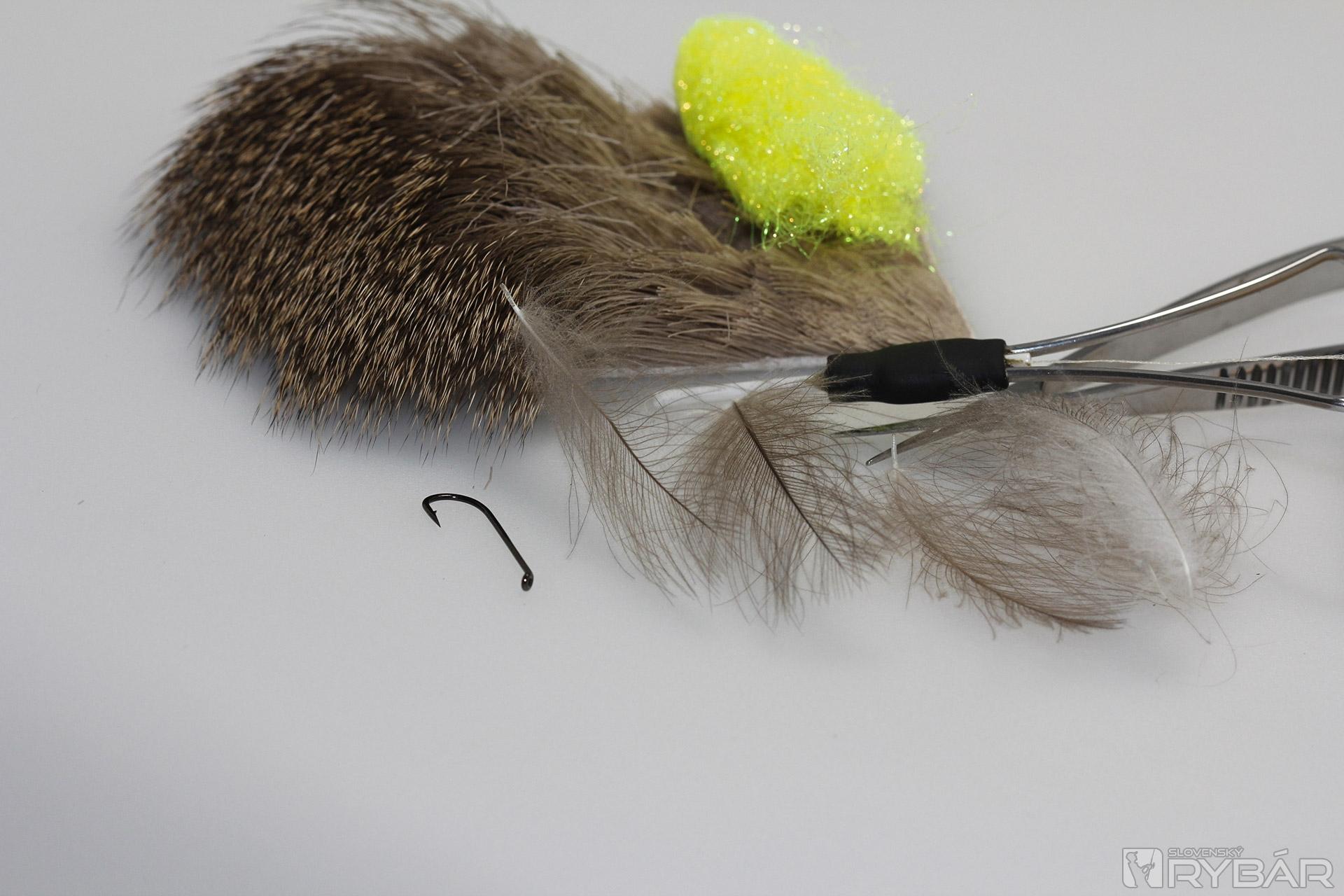 Z jelenej srsti zhotovíme telíčko. Jednotlivé snopčeky pevne uväzujeme na ramienko háčika.