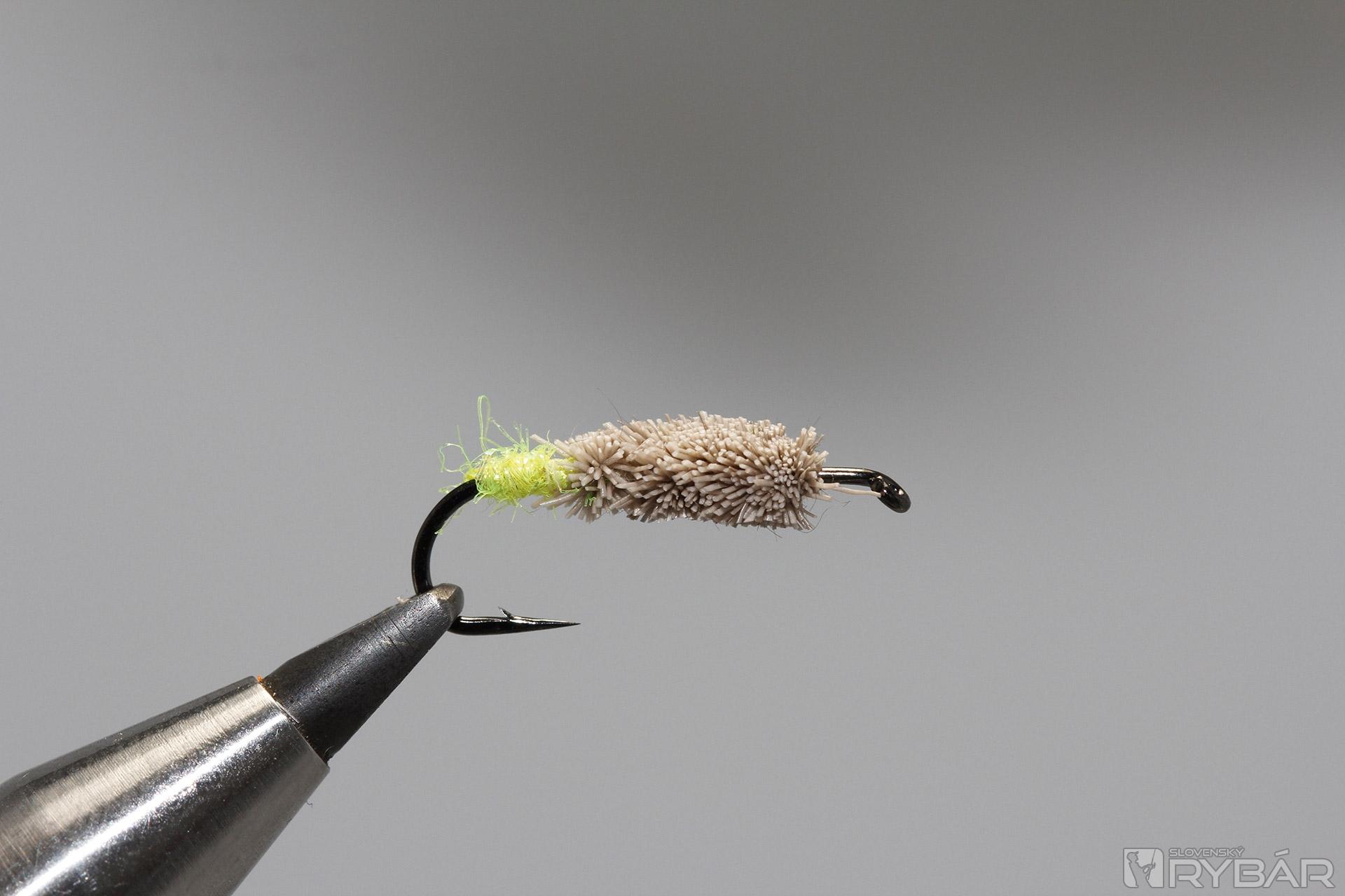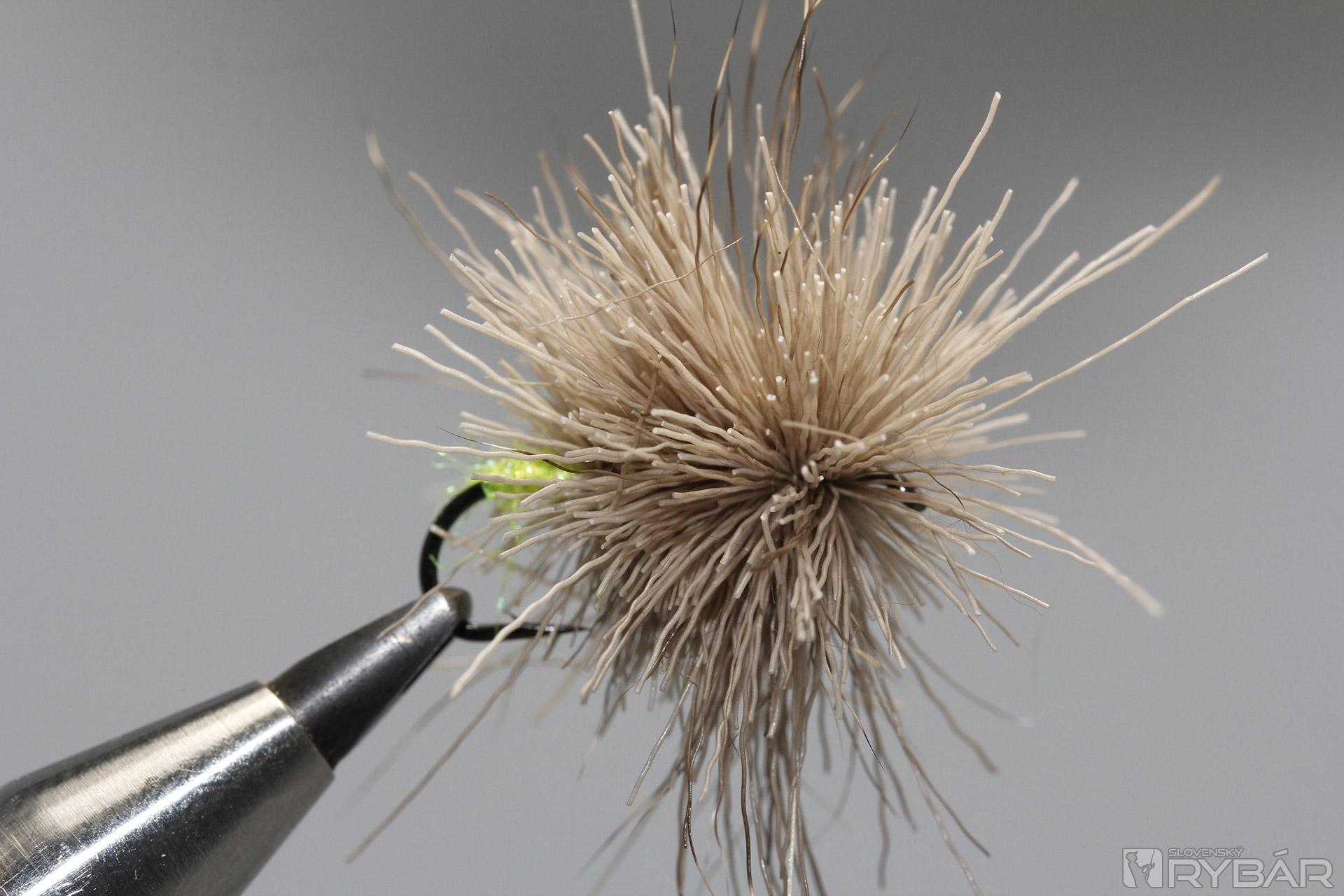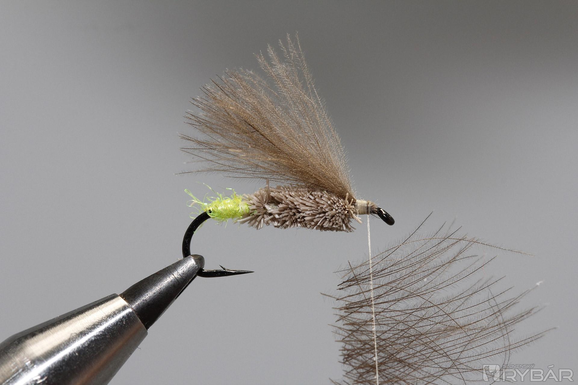 Z jelenej srsti zhotovíme telíčko. Jednotlivé snopčeky pevne uväzujeme na ramienko háčika.