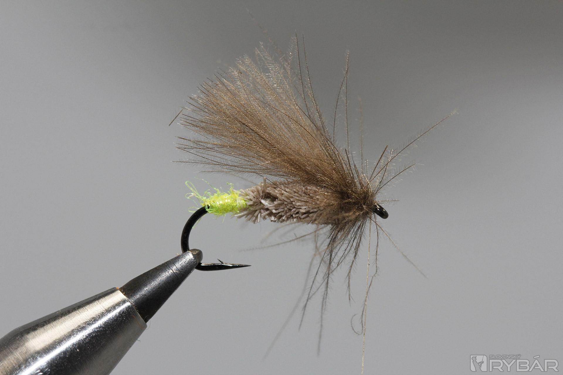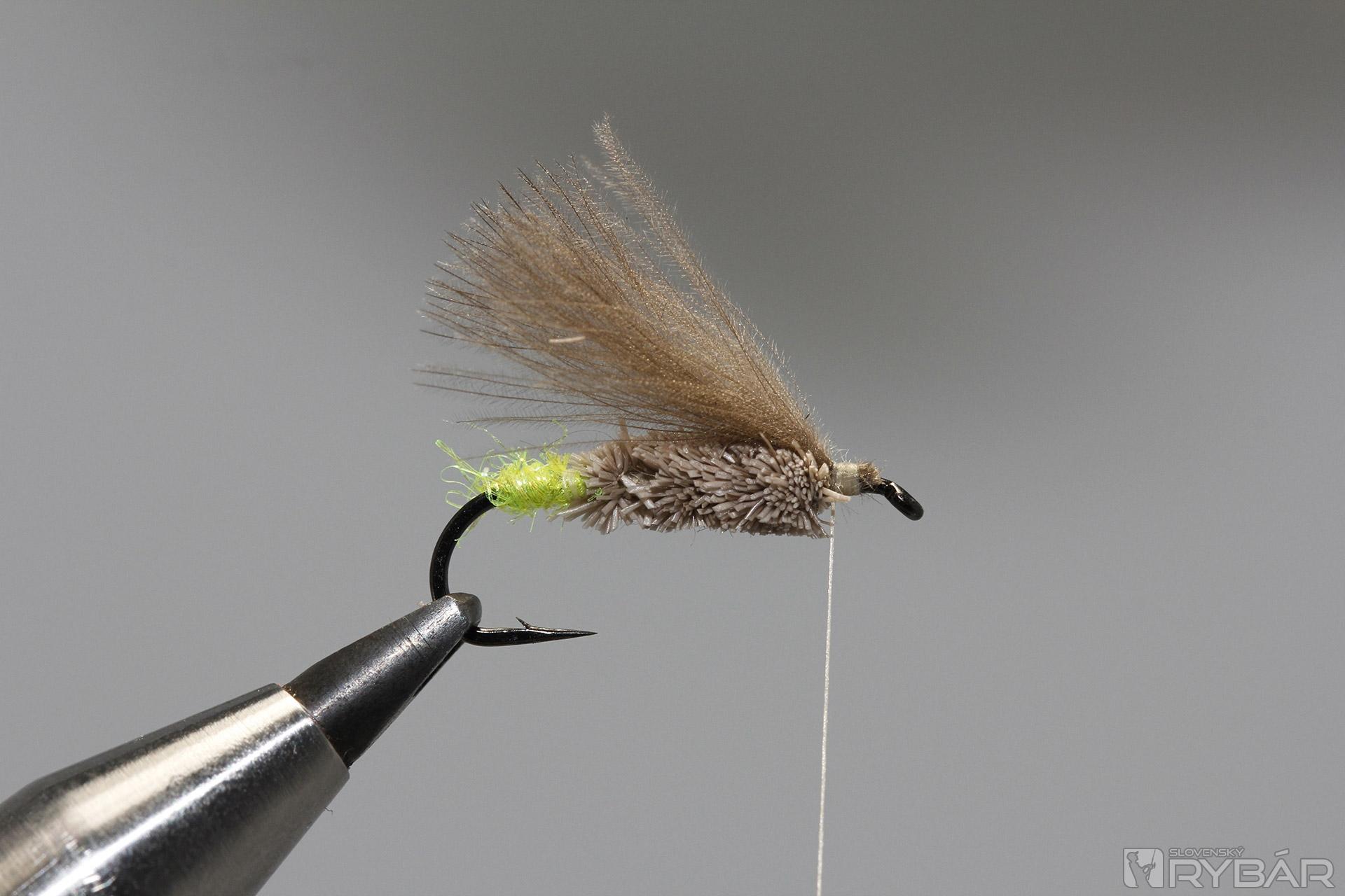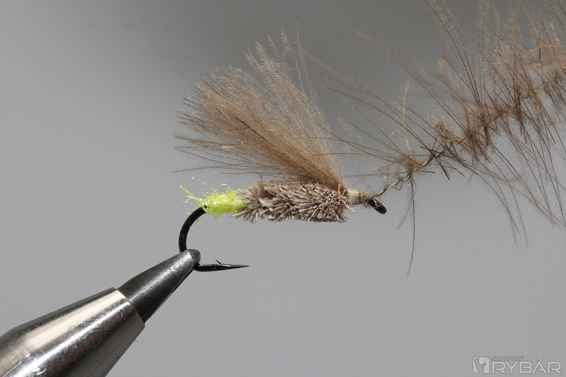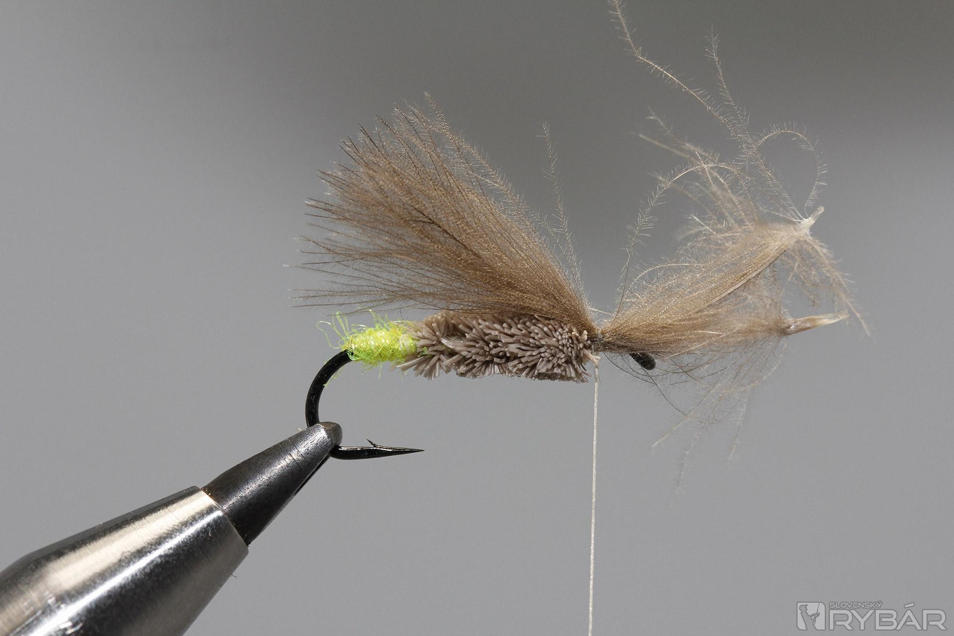 Je zhotovený z vynikajúcich materiálov ako je dutá srsť z jeleňa, alebo srnca a CDC peria. Vyskúšajte farby rôznych atraktorov. Mušku je možné zhotoviť aj z výlučne prírodných materiálov, alebo úplne vynechať atraktor na zadočku mušky. Pri večernom muškárení je však výrazný spúšťač veľmi dobrým rozpoznávacím znakom. Viazanie telíčka sa môže spočiatku zdať trocha náročné, avšak vôbec to tak nie je. Na telíčko používam „odpad“ z jelenej srsti. Sú to krátke časti srsti, ktorú som nepoužil pri strihaní napr. dlhých krídeliek iných vzorov.