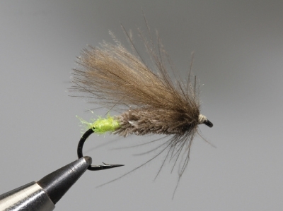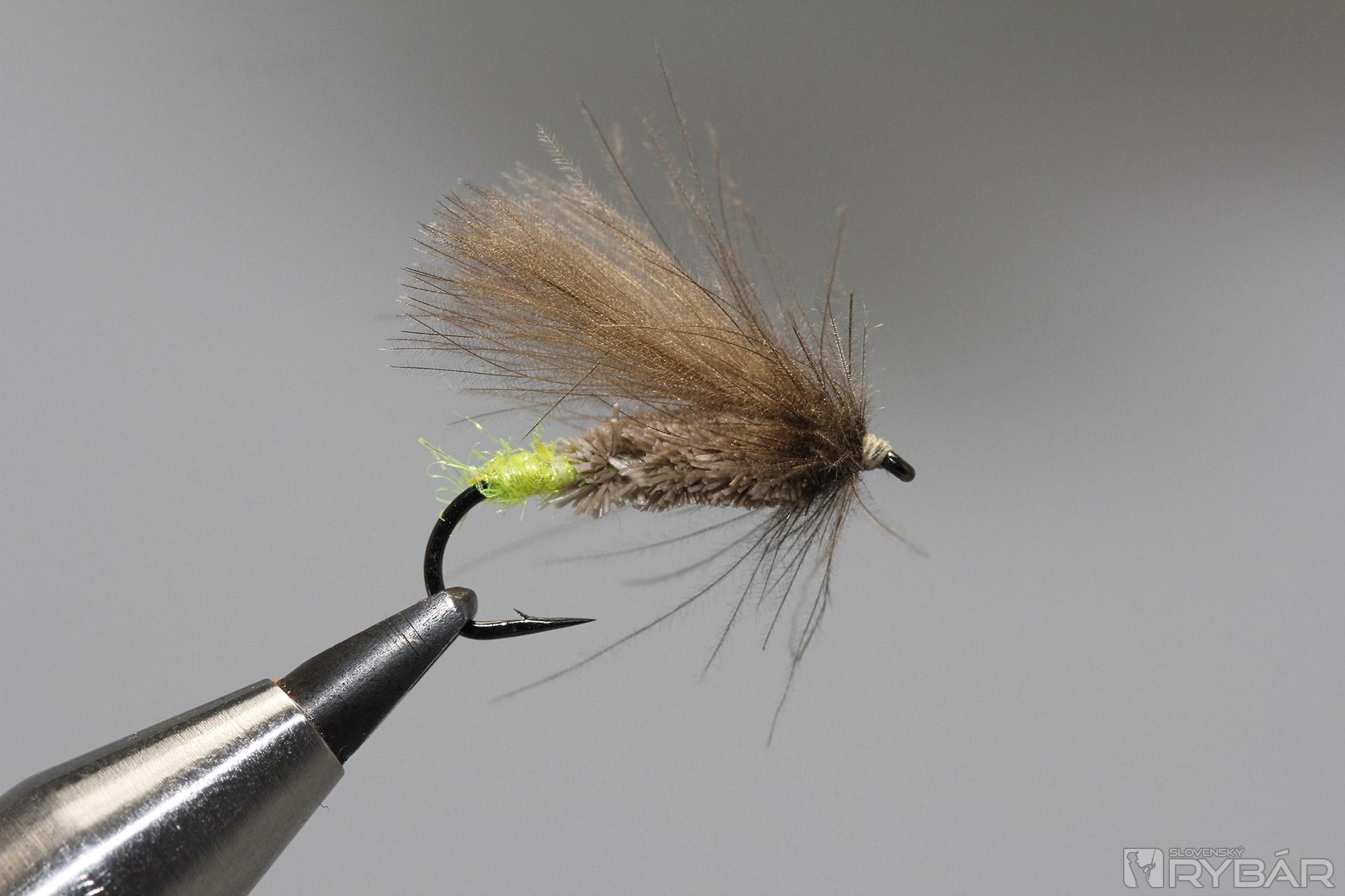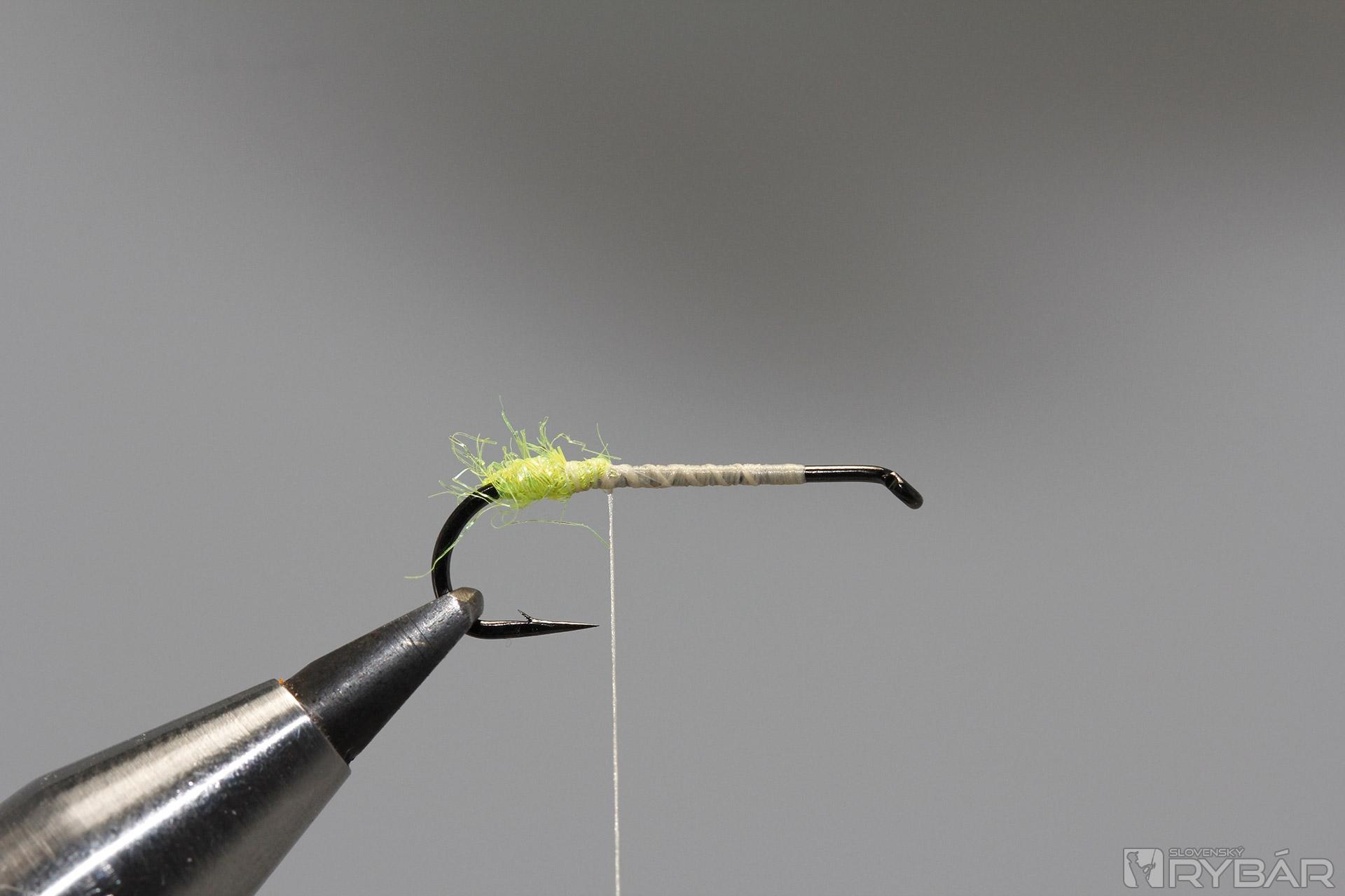 háčik, veľ. 10 s dlhším ramienkom, CDC perie, srsť z jeleňa, žlto-zelený spectra dabing, viazacia niť.