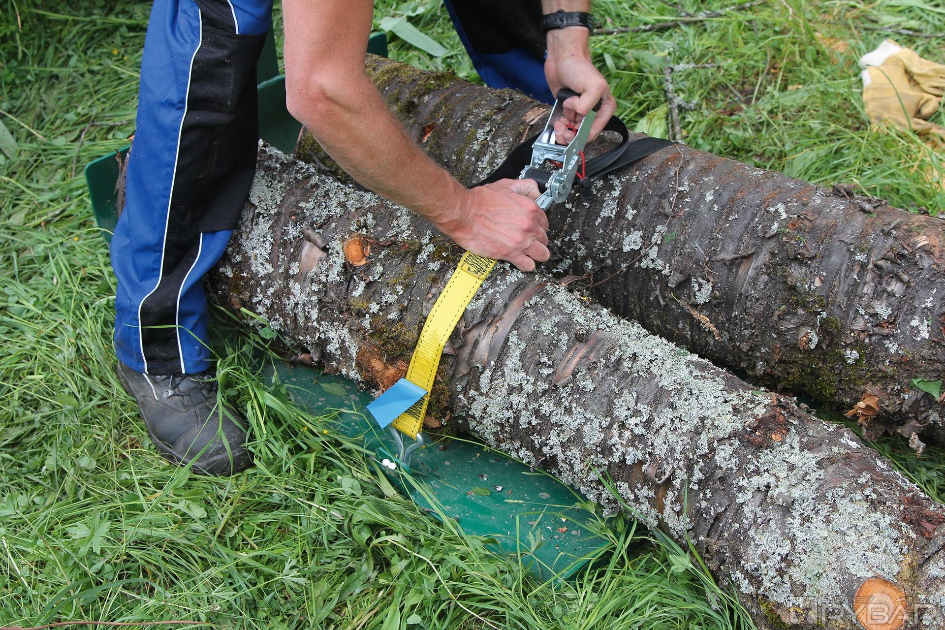Na ťahanie používame špeciálne sane. Existujú rôzne vleky, ale väčšina je urobená na kolesách. Nakoľko u nás na všetko na kolesách už potrebujete papiere a EČV upravili sme vlek-sane, ktoré používajú kanadský drevorubači na približovanie dreva so štvorkolkami. Len ich verziu sme trocha vylepšili, nakoľko oni sane ťahajú na reťaziach, čo je použiteľné len na rovine. Ak idete z kopca sane s drevom na reťazi sa môžu rozbehnúť a strhnúť aj vás aj „kolku“. Naša verzia s pevným úchytom na guľu je bezpečnejšia. Drevo sa k saniam pritiahne popruhom s račňou (gurtňou). Takto upevnený kmeň stiahnete na sklad, alebo k vlečke. Počas ťahania používajte v teréne pohon 4x4. My sme uzávierku ešte vlastne ani nepoužili, ale všetko závisí od podmienok, kde budete robiť.