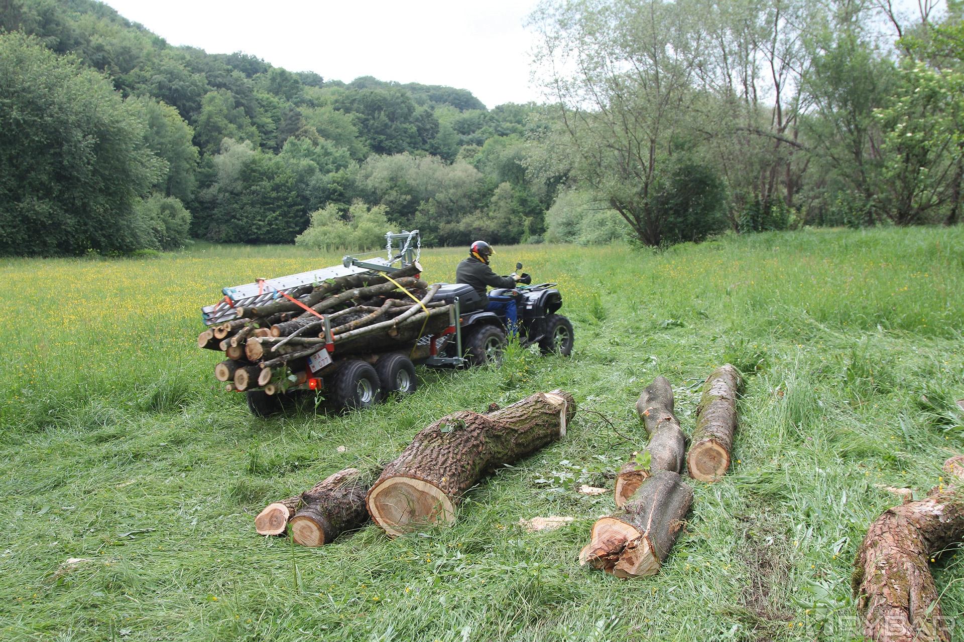 Pri odvoze sme používali vlečku na drevo pre ATV takzvaný „klaničák“. Veľkou výhodou klaničáka je, že môžete naň naukladať rovno až 4 m kusy v celku. Nemusíte robiť metrovicu v lese a tam ju ukladať. Potom ukladať na auto, potom skladať a doma znova ukladať metrovicu. Takto si domov odveziete 2-, 3-, alebo 4-metrové kusy. My sme robili 3-metrové kusy. Tým odpadá ukladanie v lese, nakladanie na auto, doprava a skladanie, čo nie je veľmi efektívne a ani lacné. A hlavne to nemusíte robiť dvakrát.