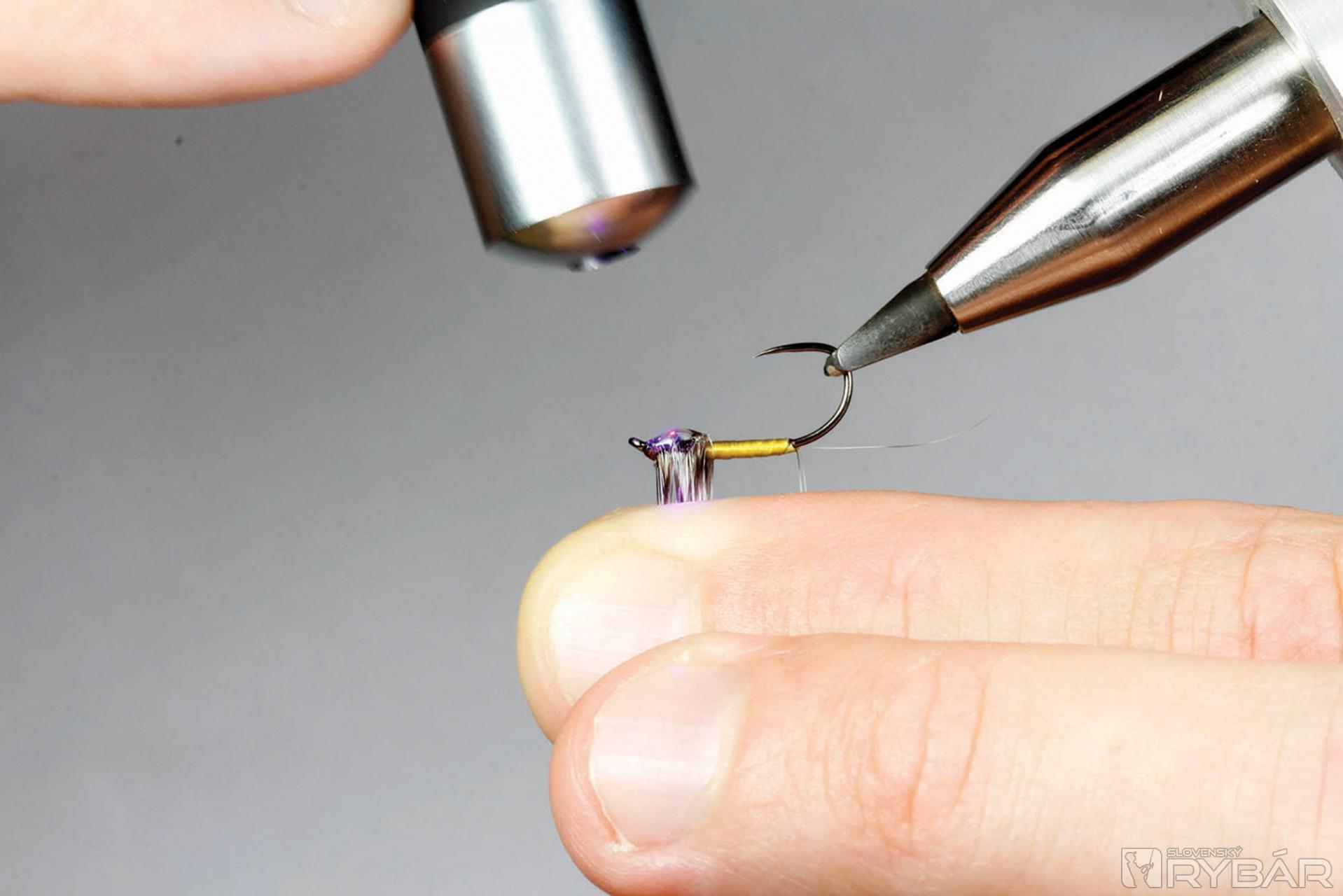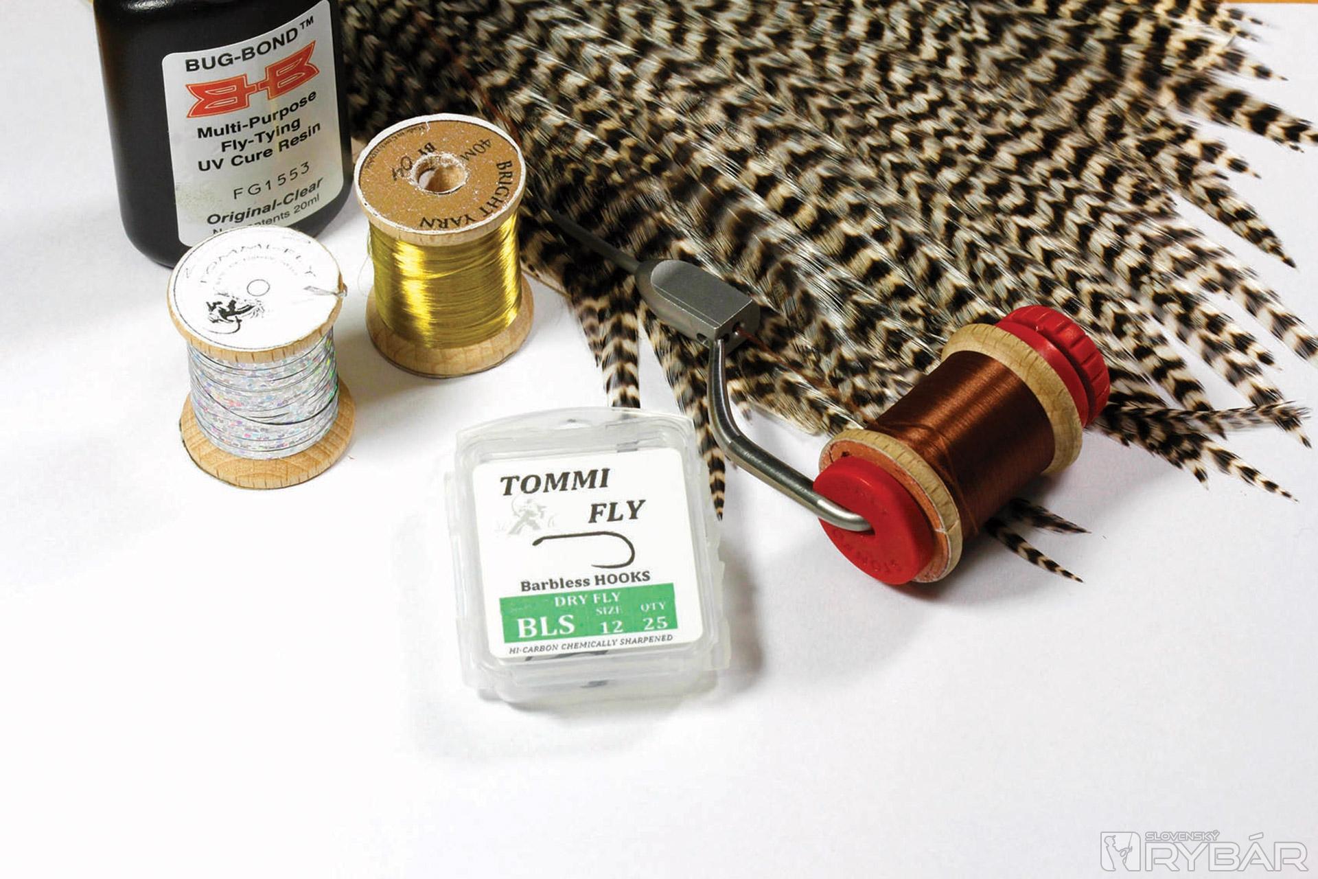 Suchý háčik, tmavá viazacia niť, grizzly pierka, lametka, zlato-zelená niť, UV lak, UV lampa.