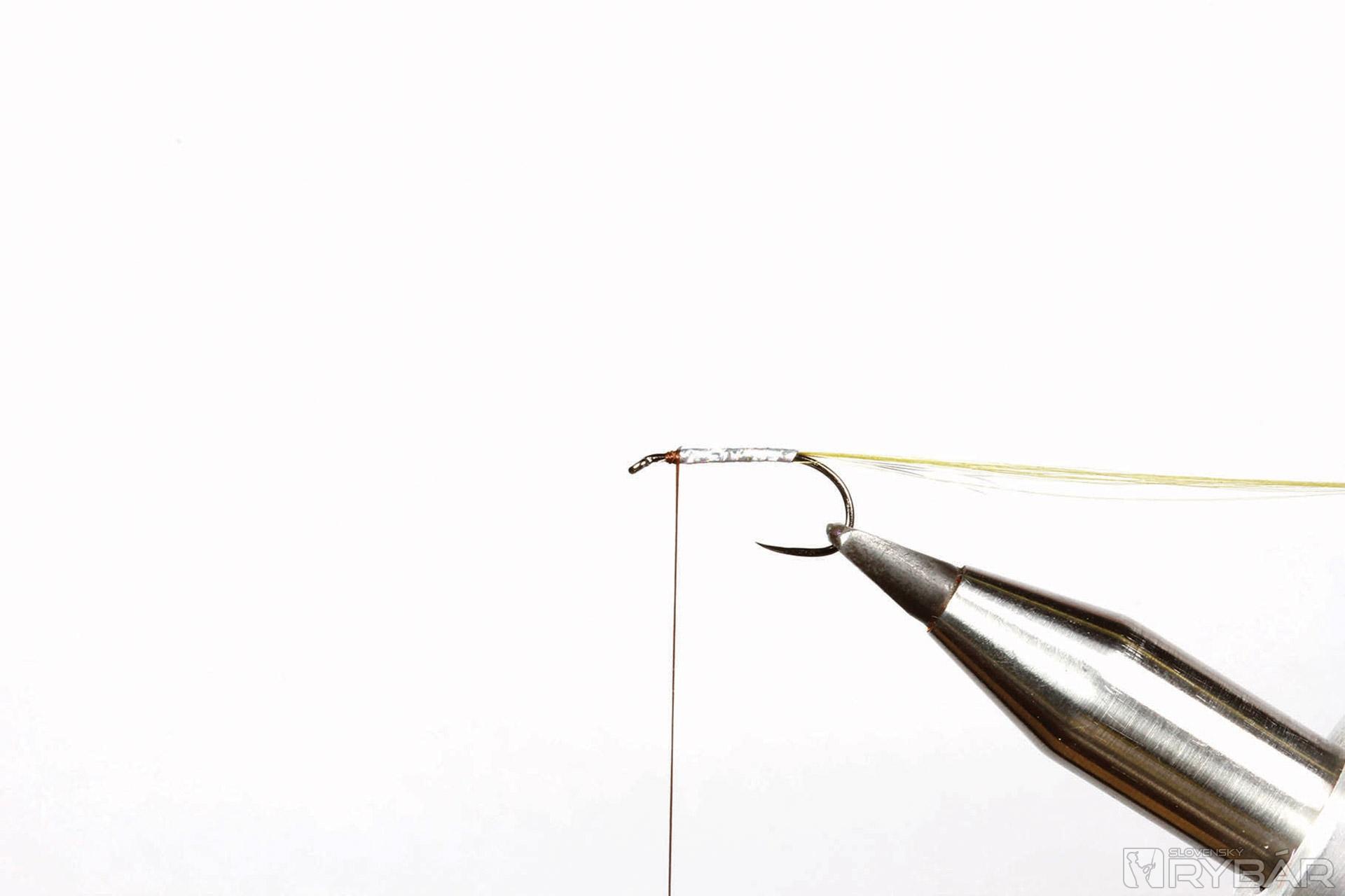 2. Ďalej naviažeme lametku a zlato-zelenú niť na telíčko.
