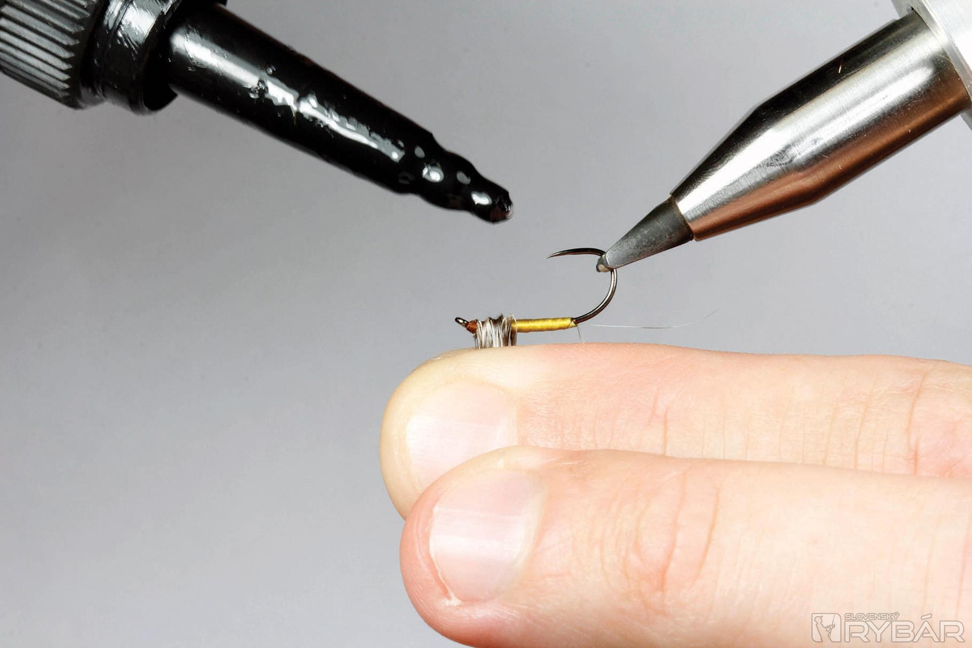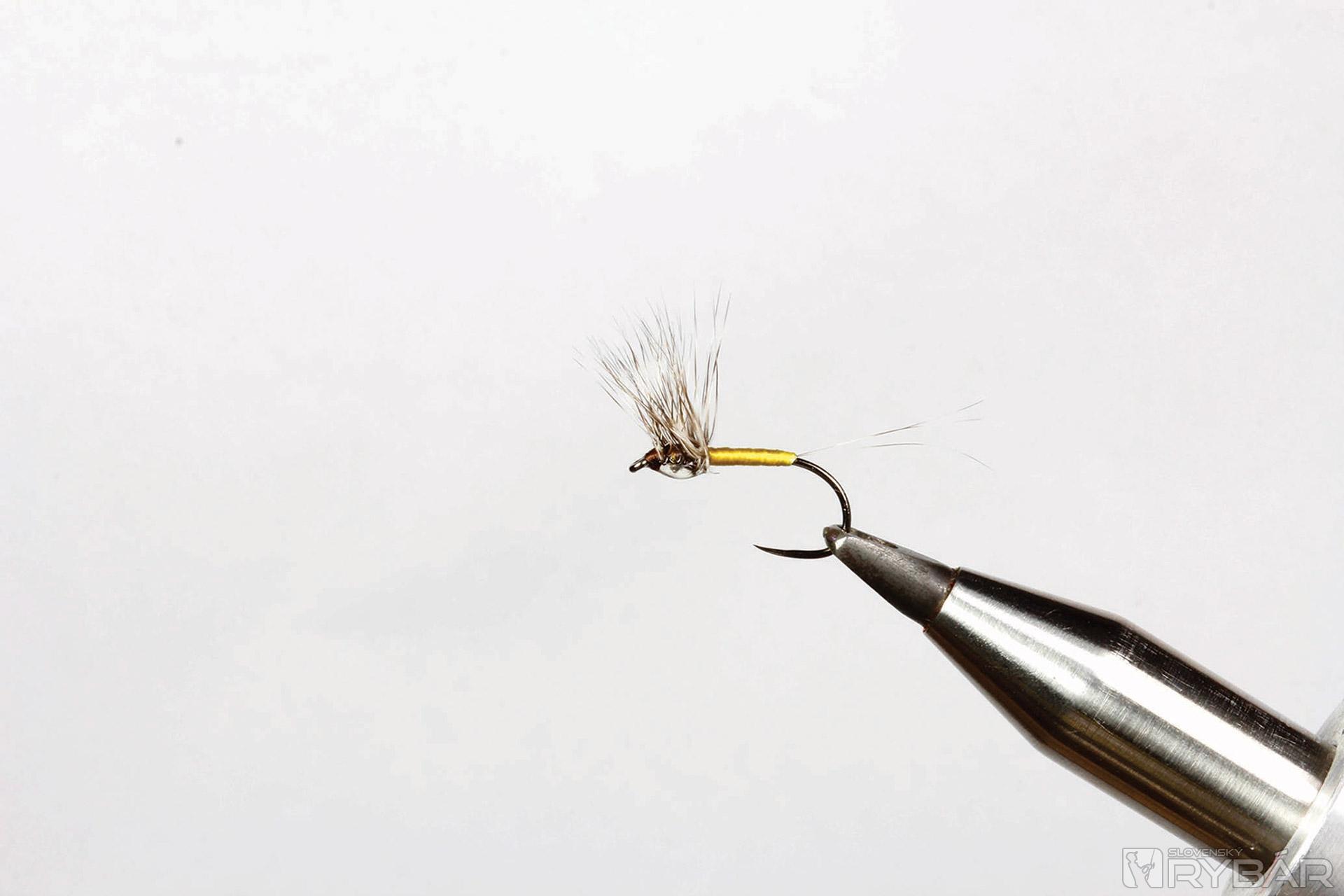 Obyčajná podenka viazaná neobyčajným spôsobom. Ak máte vo vašej viazačskej výbave UV lak, určite skúste aj túto mušku. Zo začiatku sa viaže ako úplná klasika, ale na konci je potrebné nôžky prevrátiť smerom hore a spodnú časť hlavohrude zakvapnúť UV lakom. Ten udrží všetky lúče pierka na vrchu. Získame tak niečo nové, možno úspešnejšie ako klasicky viazané mušky. Lovíme s jednou muškou na nadväzci.