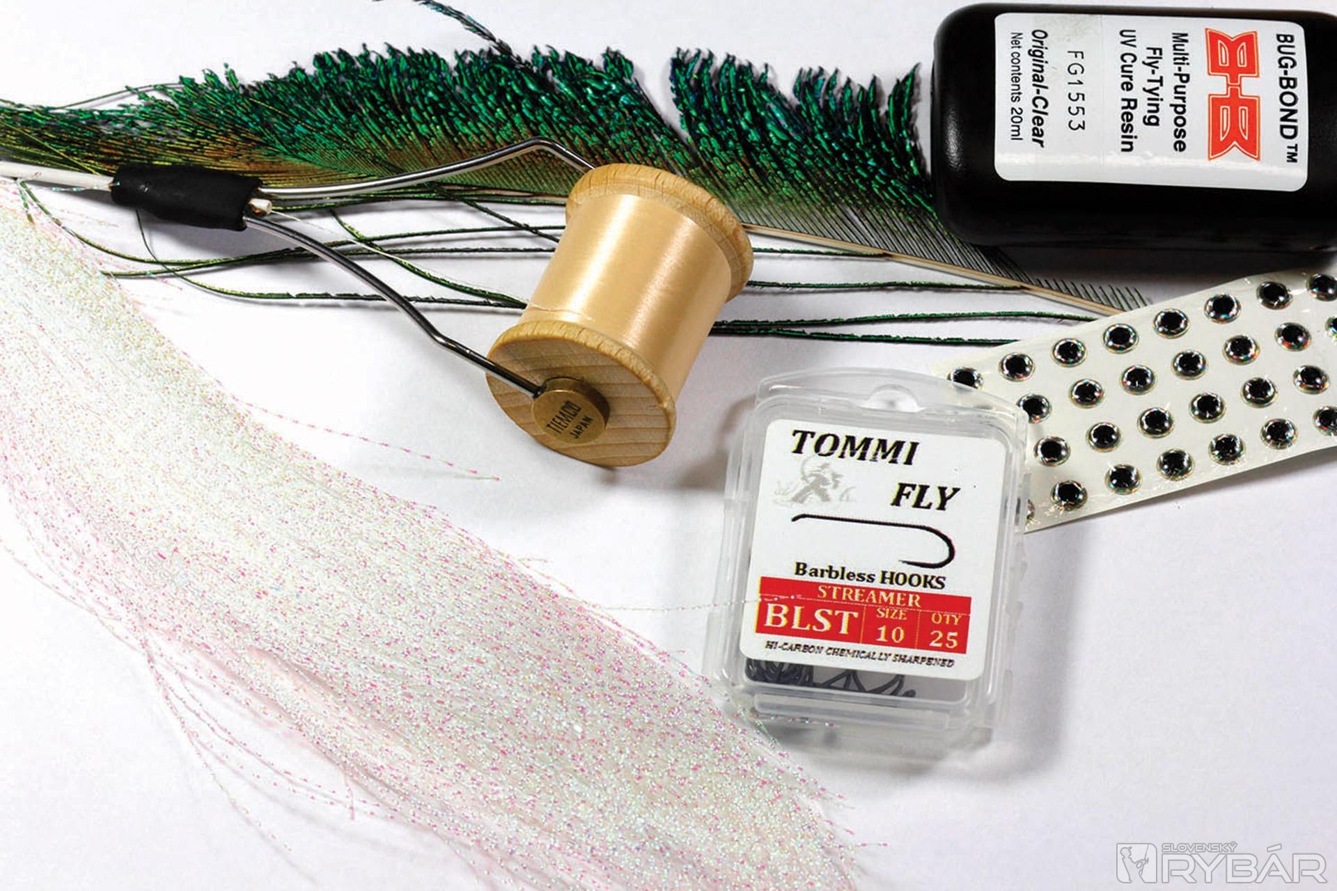 Strímrový háčik, svetlá viazacia niť, crystal flash, páví „meč“, tzv. sword, UV lak a UV lampa.