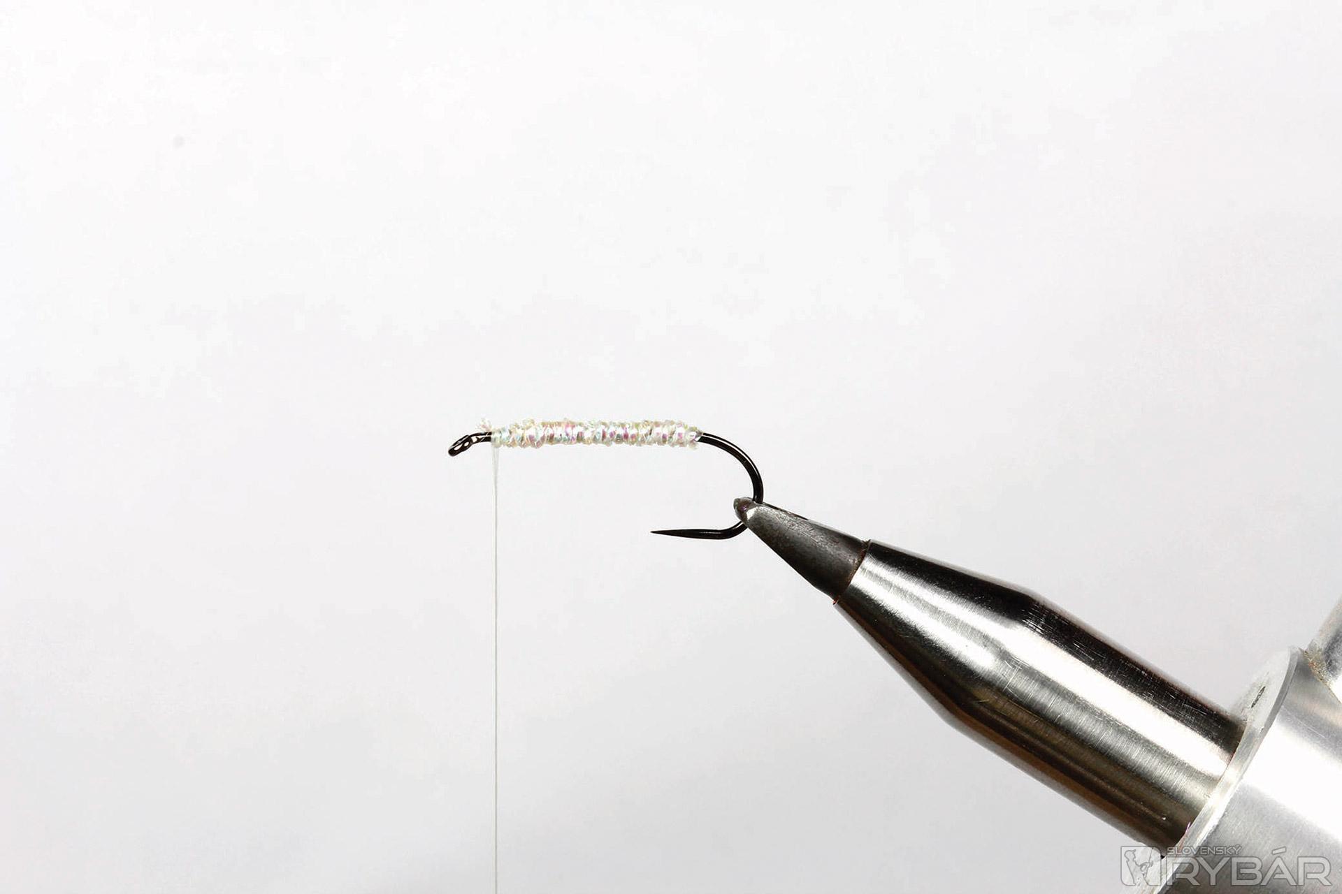 1. Háčik upneme do zveráčika a naviažeme niekoľko vlákien crystal flash.