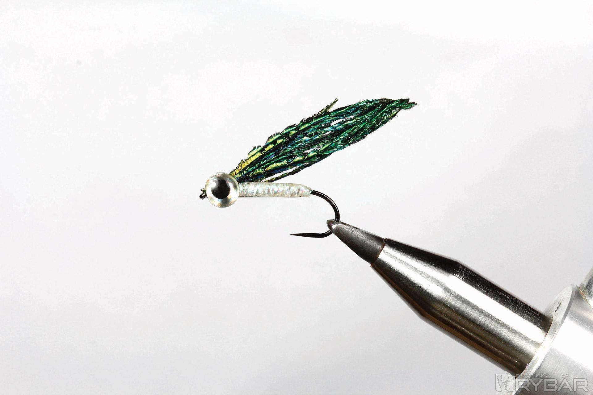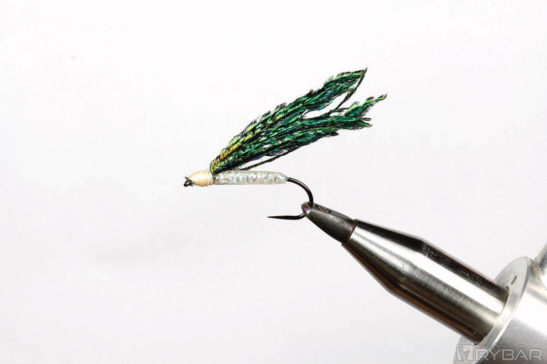 Malý strímrik viazaný z pera páva, konkrétne z jeho „meča“. Už sme o tom v minulosti písali, je to tá časť pávieho chvosta, ktorá je pri jeho rozprestretí dole, takmer na zemi. Okrem toho má strímer zhotovené telíčko z lesklých vlákien crystal flash a ako hlavný atraktor som použil výrazné oči. Takto je muška „nabitá“ atraktívnymi viazacími materiálmi. Jedinou nevýhodou je krehkosť jeho krídla z pier. Inak je to fantastická muška, ktorá je jednoduchá na zhotovenie. Lovíme buď so samostatnou muškou, alebo v tandeme s väčším strímrom, príp. inou muškou.