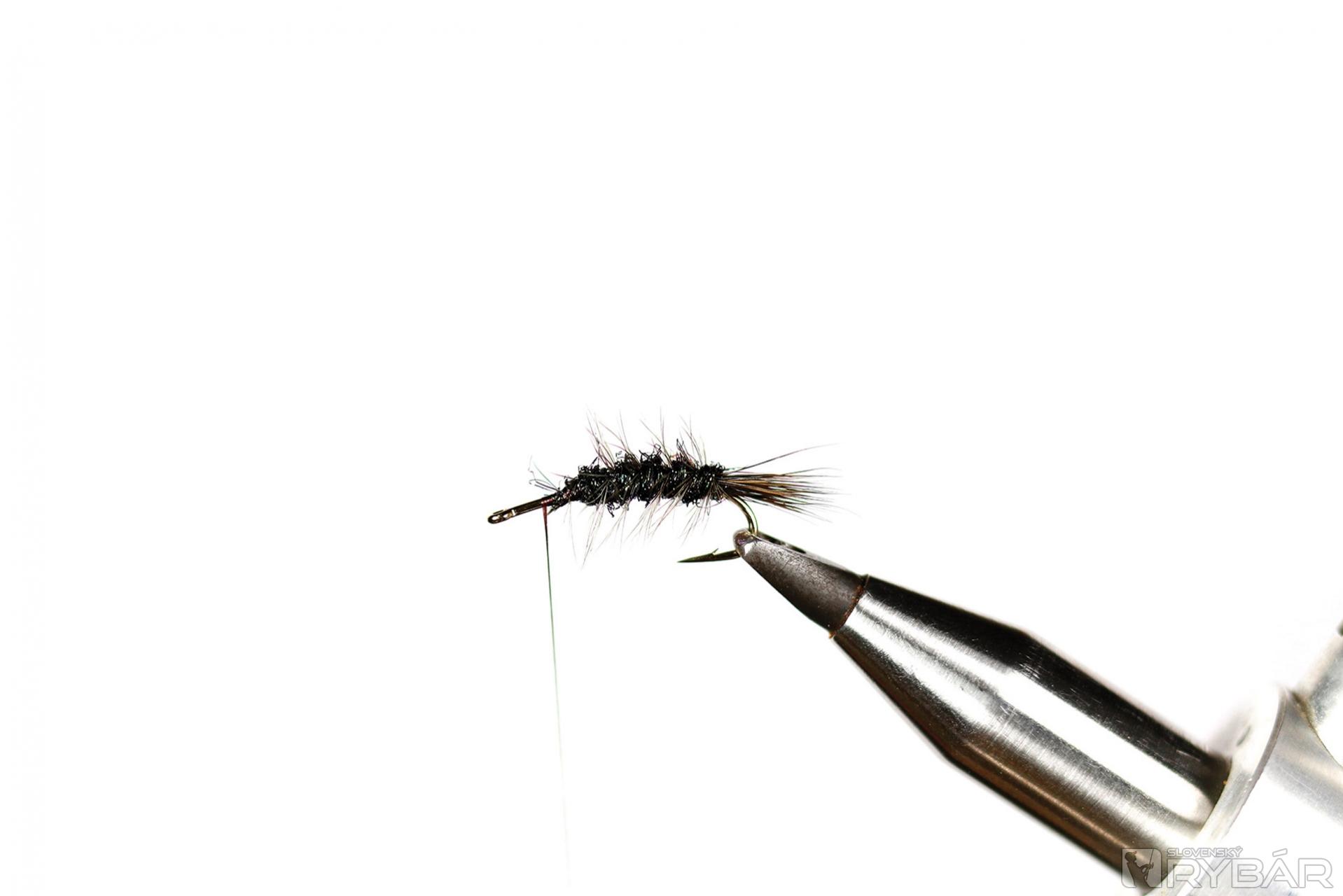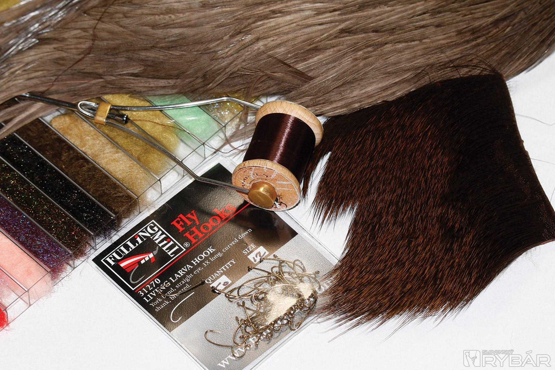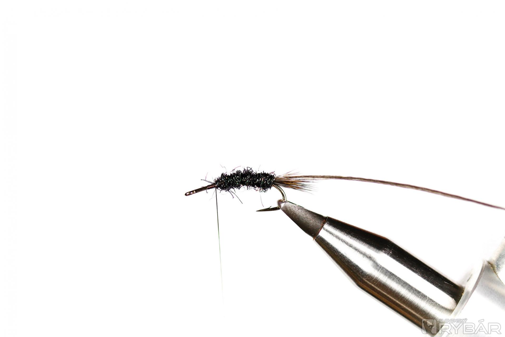 Špeciálny, tzv. Larva hook, tmavá viazacia niť, tmavá srsť z jeleňa, spectra dabing, tmavé pierka z kohúta.