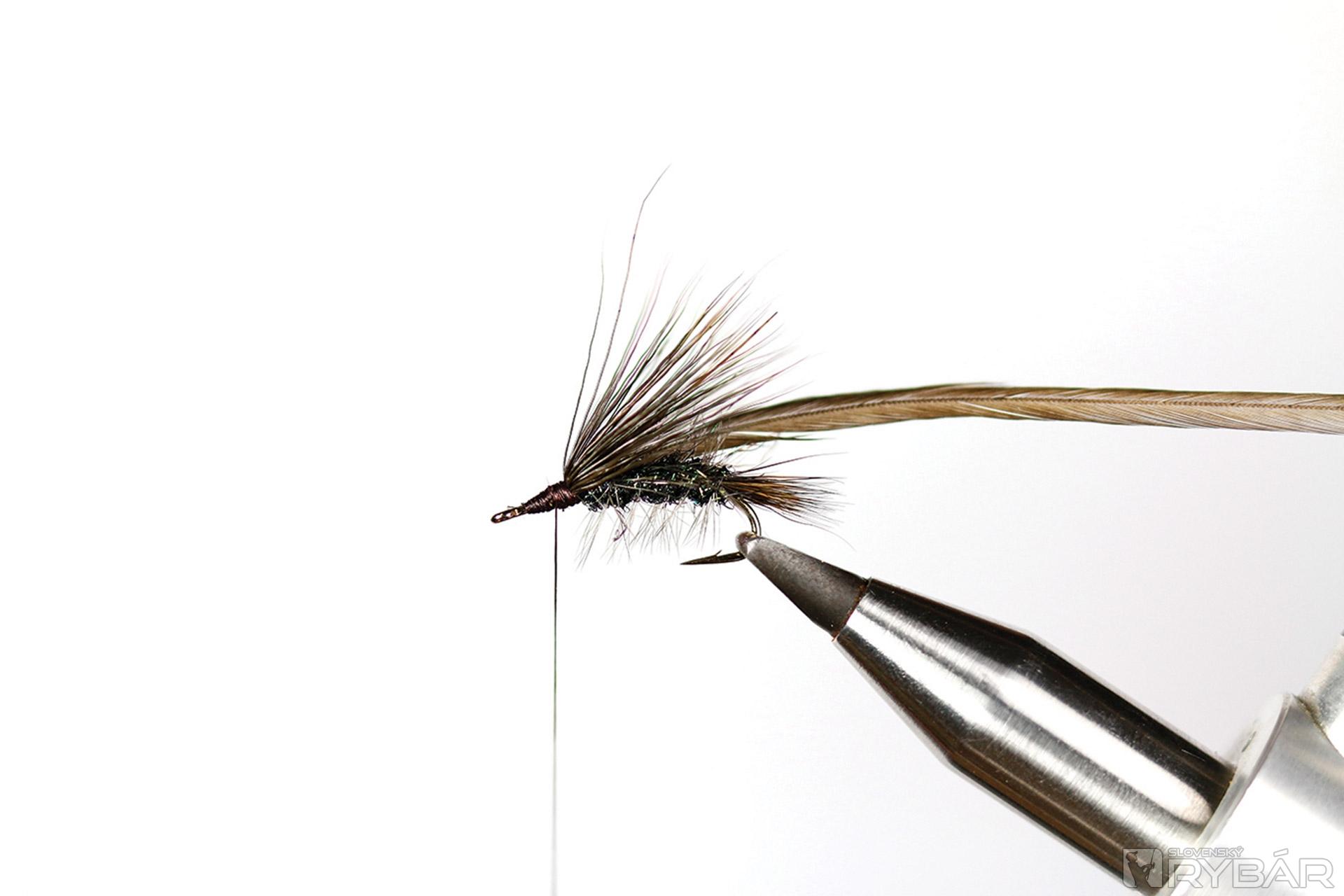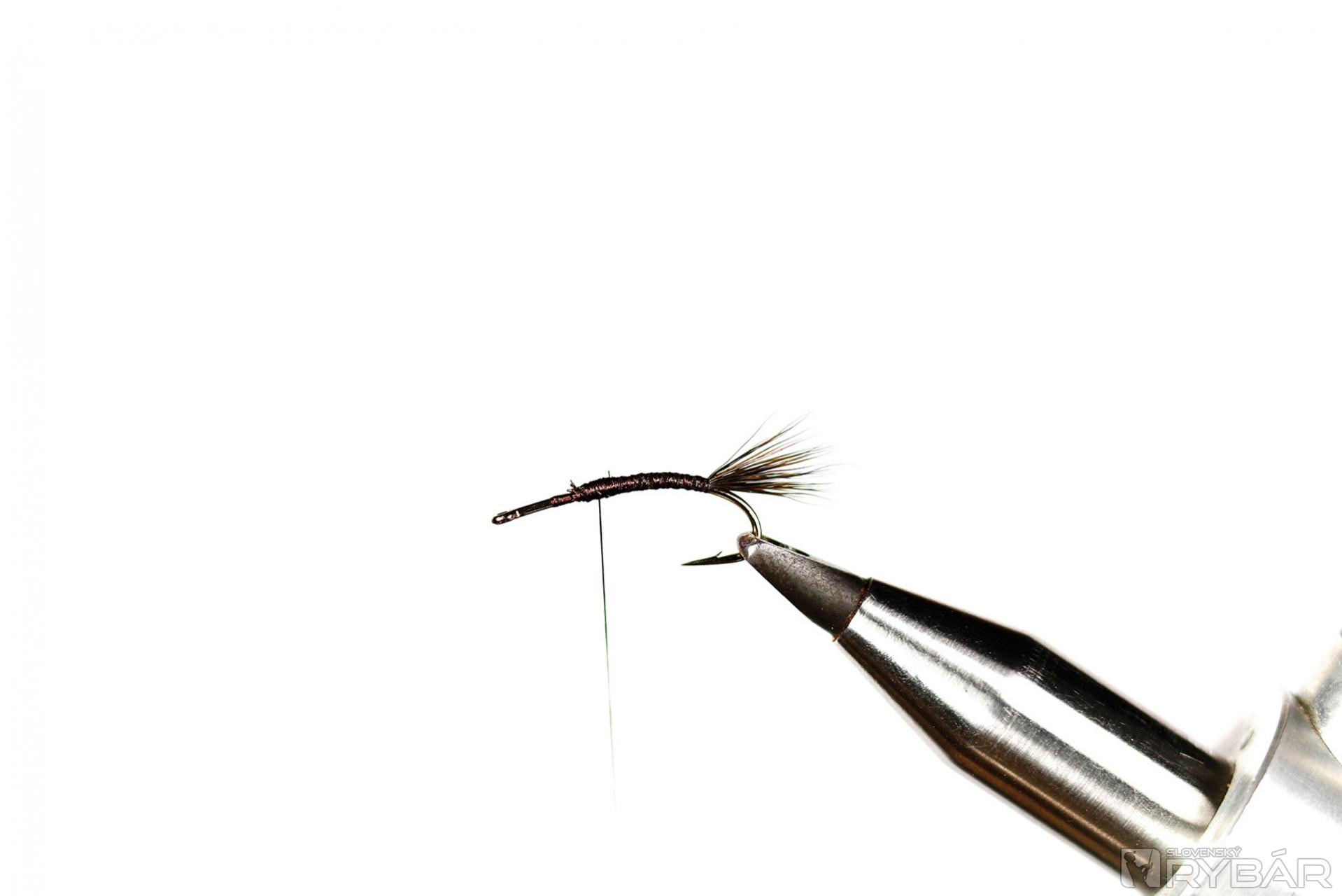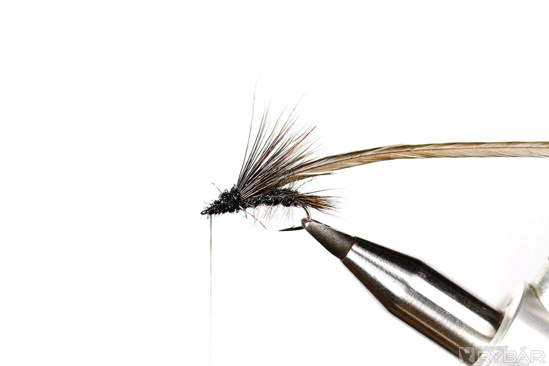 Špeciálny, tzv. Larva hook, tmavá viazacia niť, tmavá srsť z jeleňa, spectra dabing, tmavé pierka z kohúta.