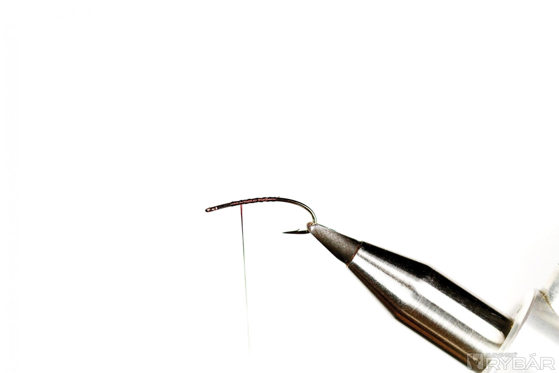 1. Háčik upneme do zveráčika a naviažeme niť.