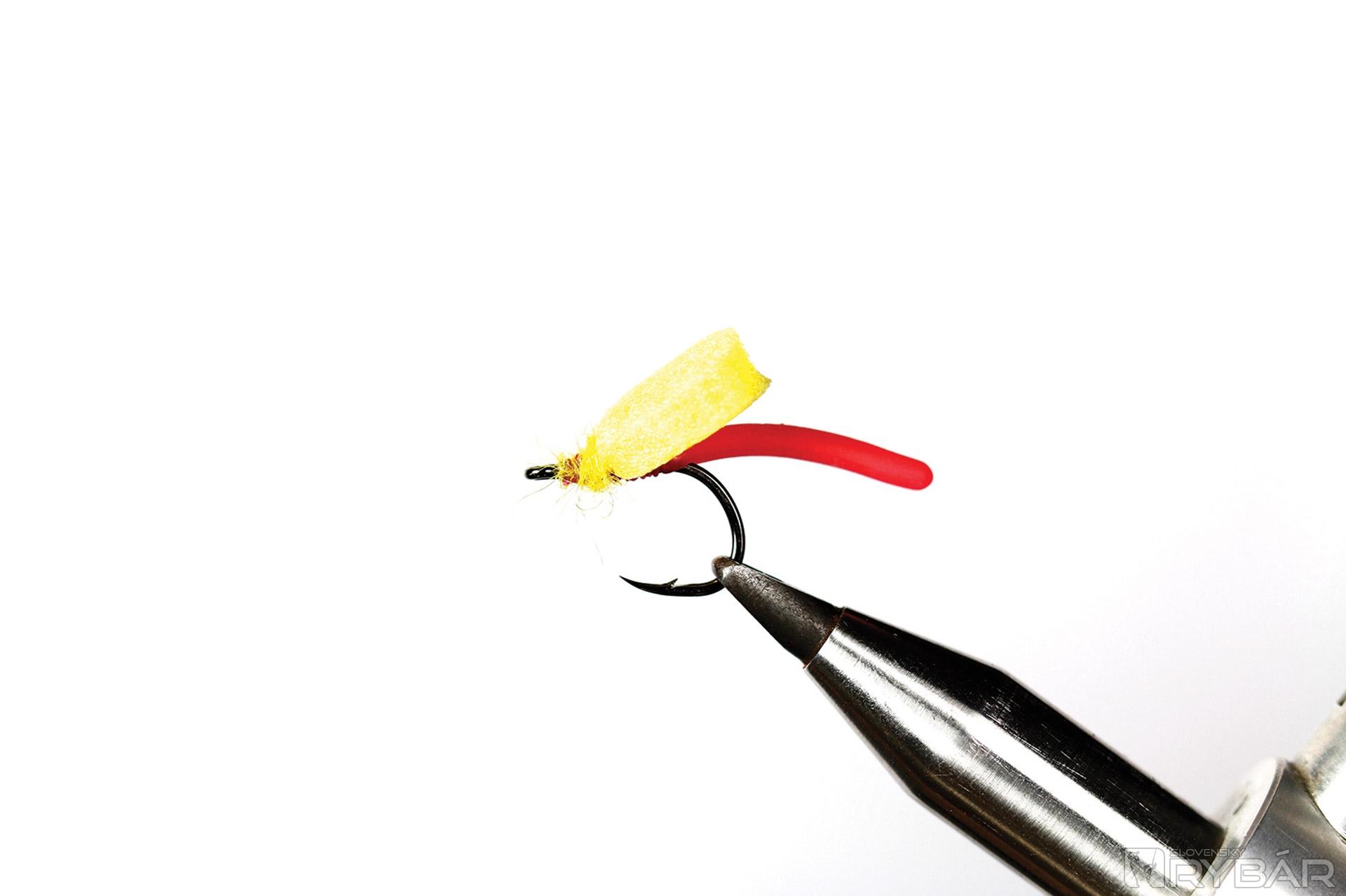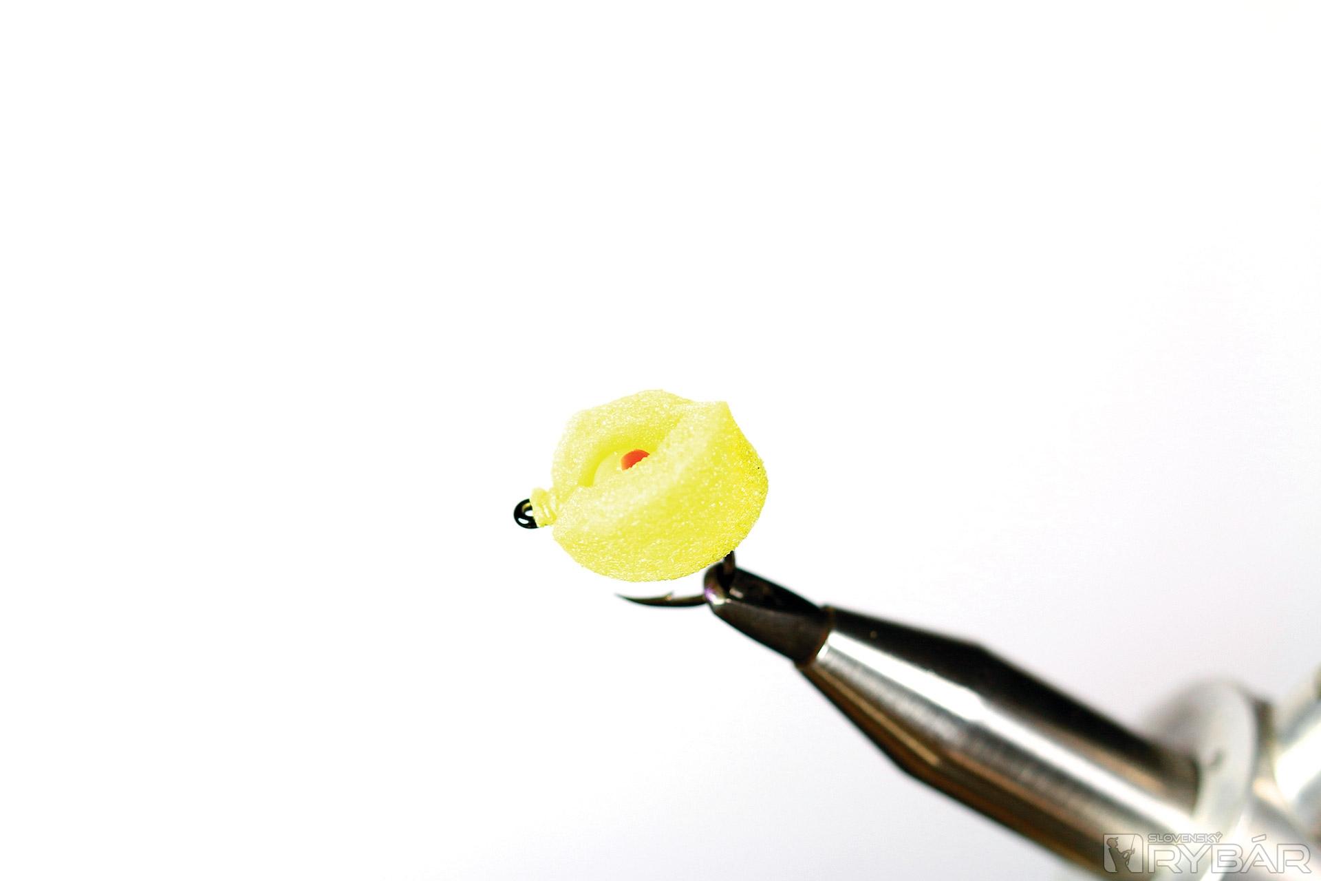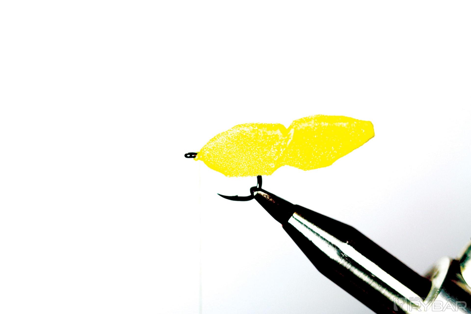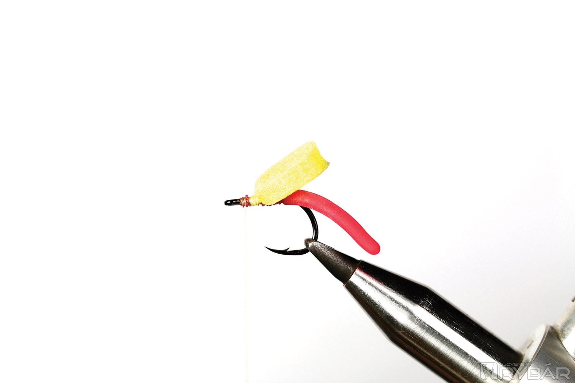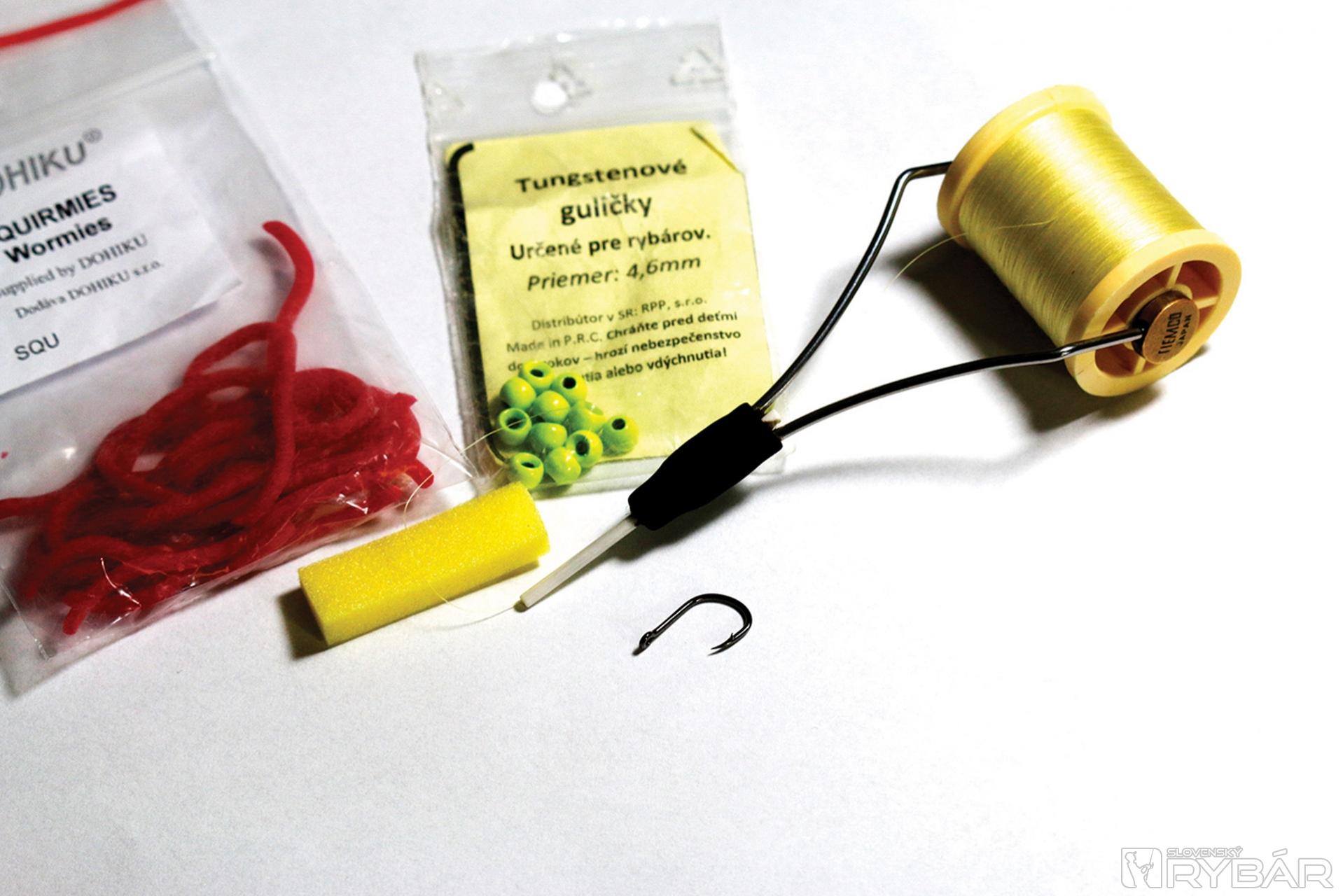 Kaprový háčik, žltá viazacia niť, žltý polycelón, volfrámová guľôčka, squirmy worm gumička.