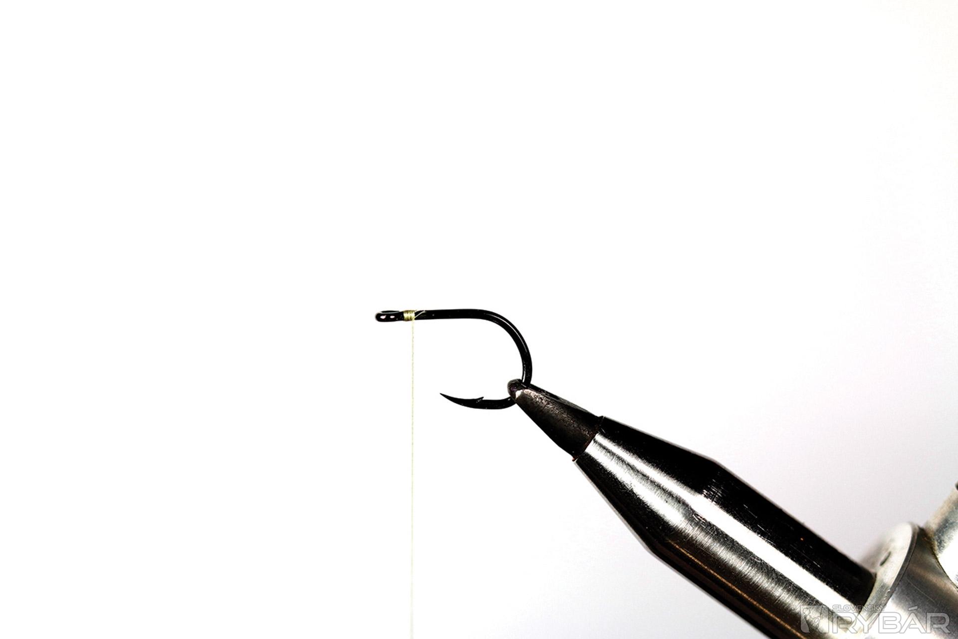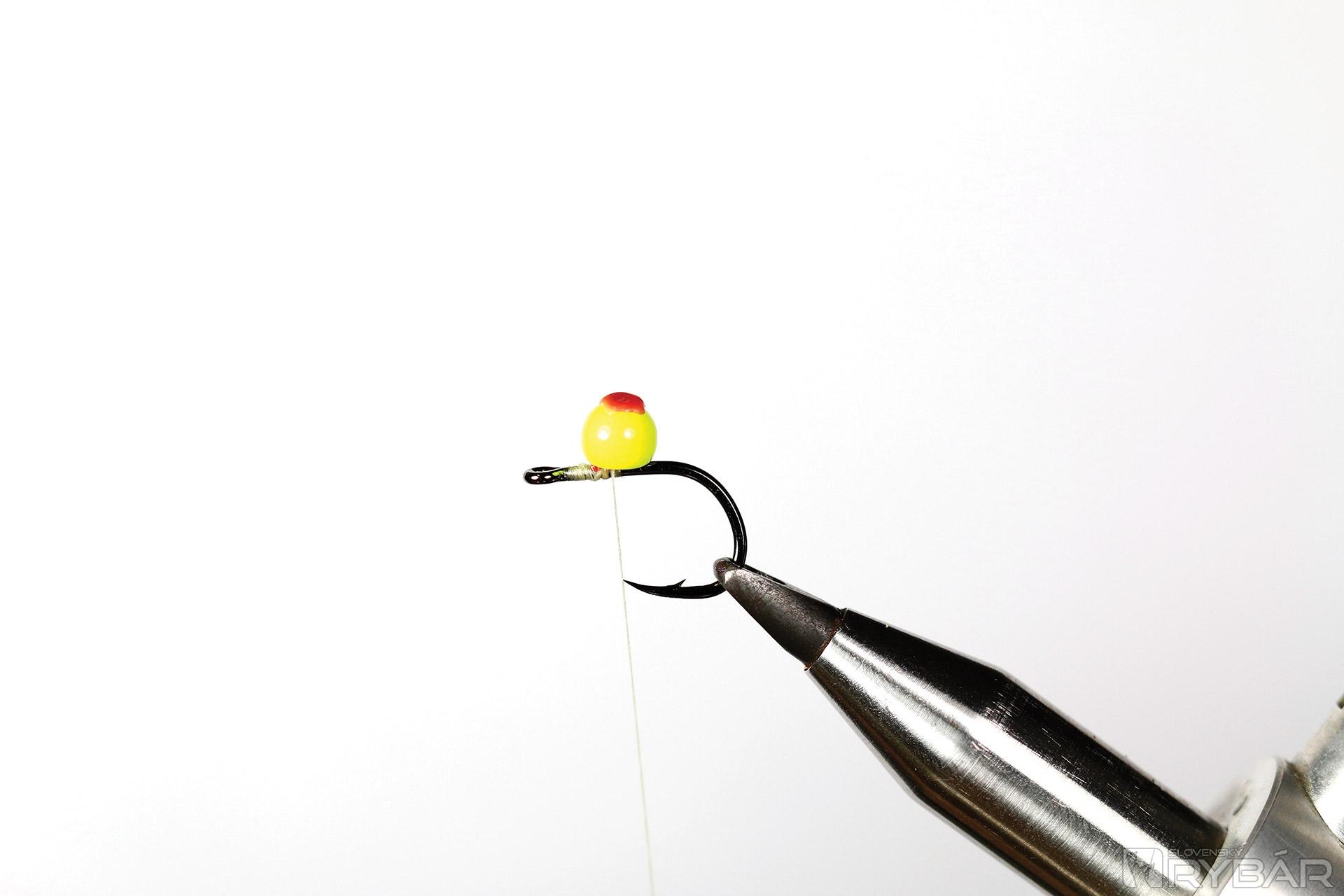 7. Volfrámovú guľôčku si na háčik upevníme pomocou zataveného vlasca.