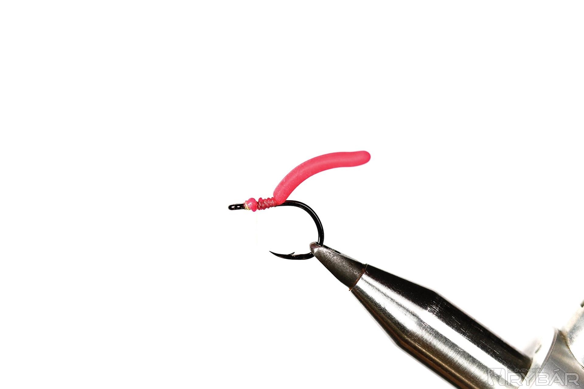 4. Na háčik naviažeme kúsok gumičky „sqirmy worm“. Má imitovať pinku, alebo kostného červa.