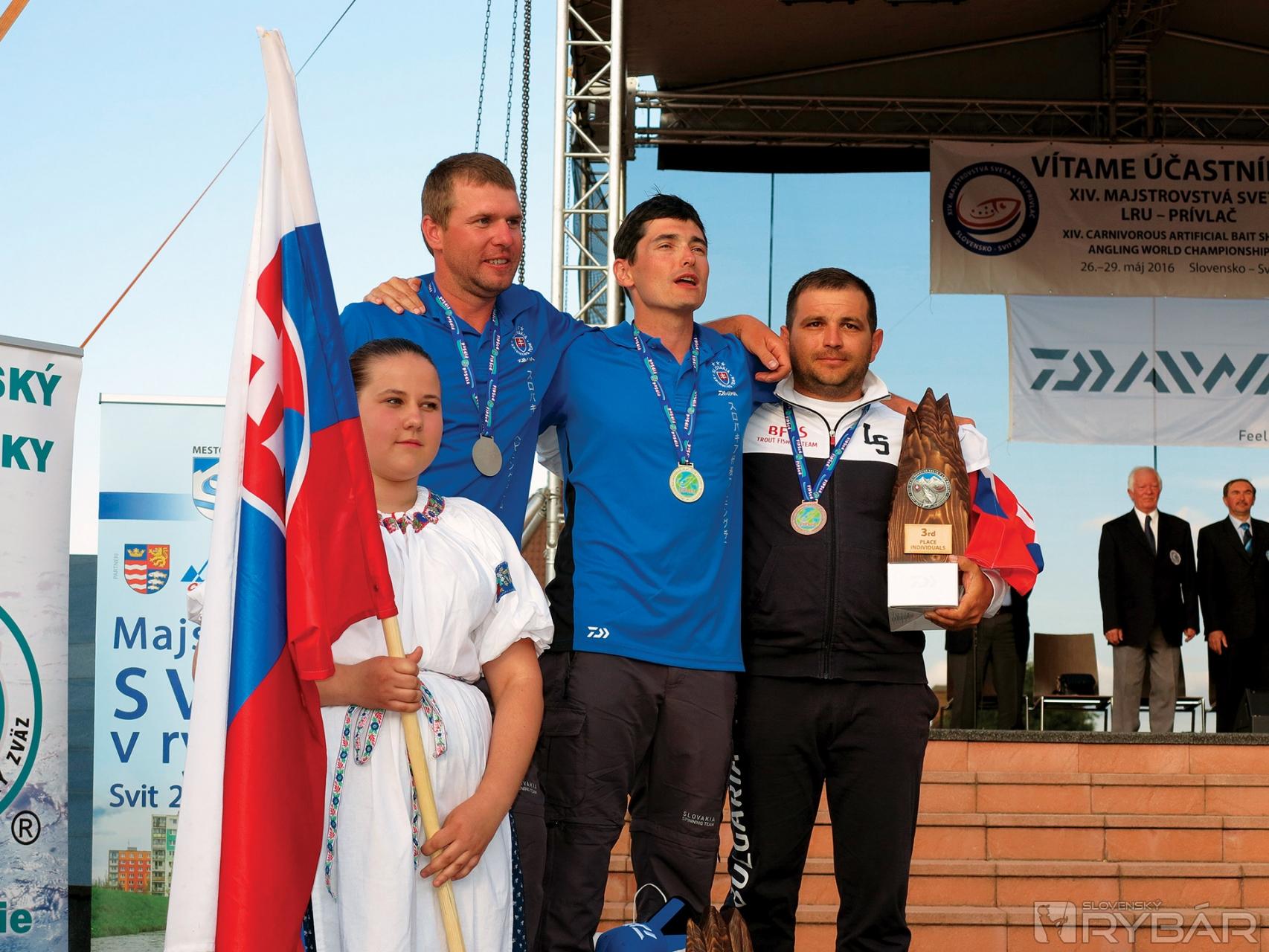 Najlepšia trojica medzi jednotlivcami - vľavo druhý Lukáš Hollý, v strede majster sveta Peťo Horňák (Slovensko) a vpravo Todor Kostadinov (Bulharsko)