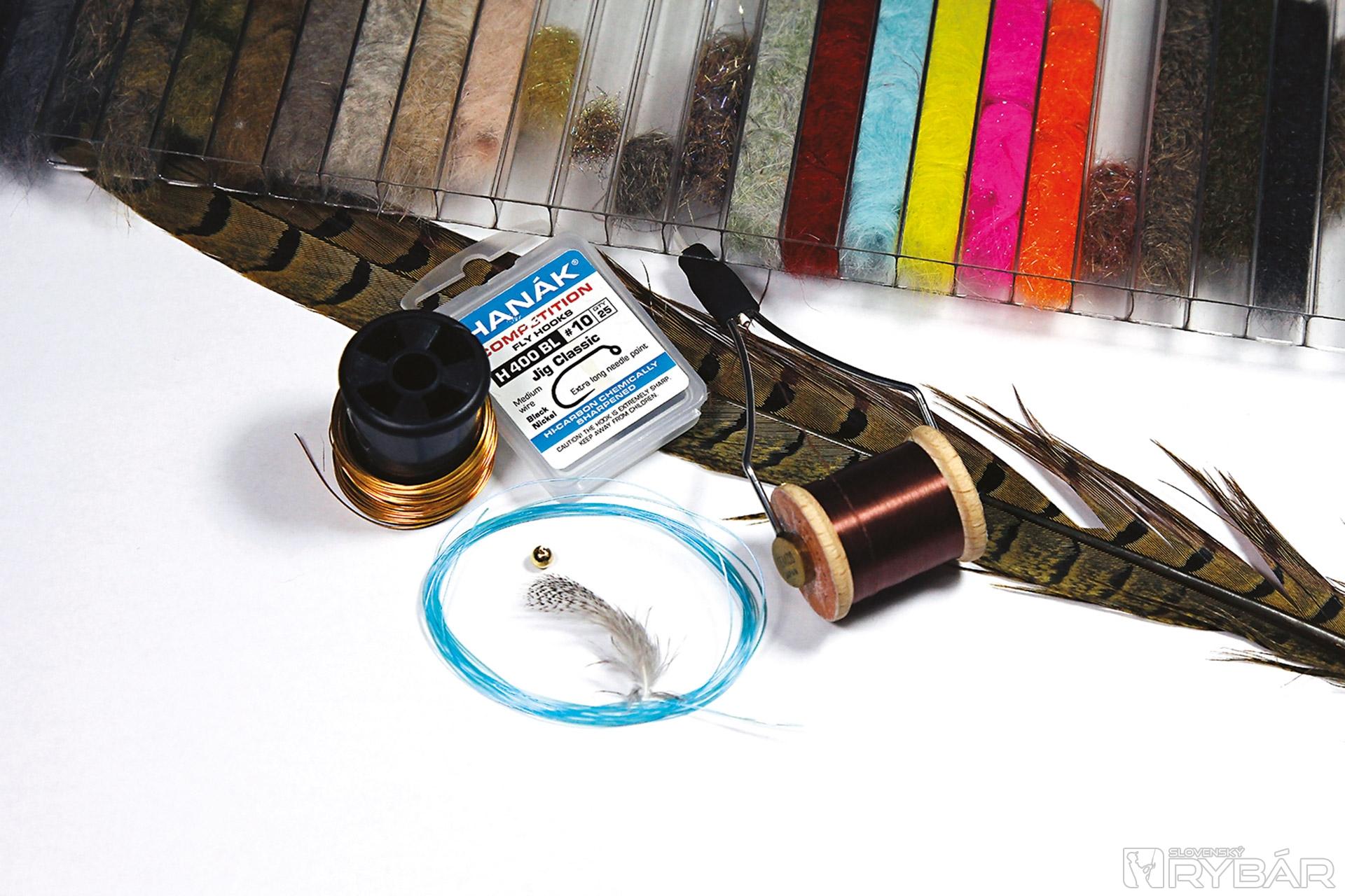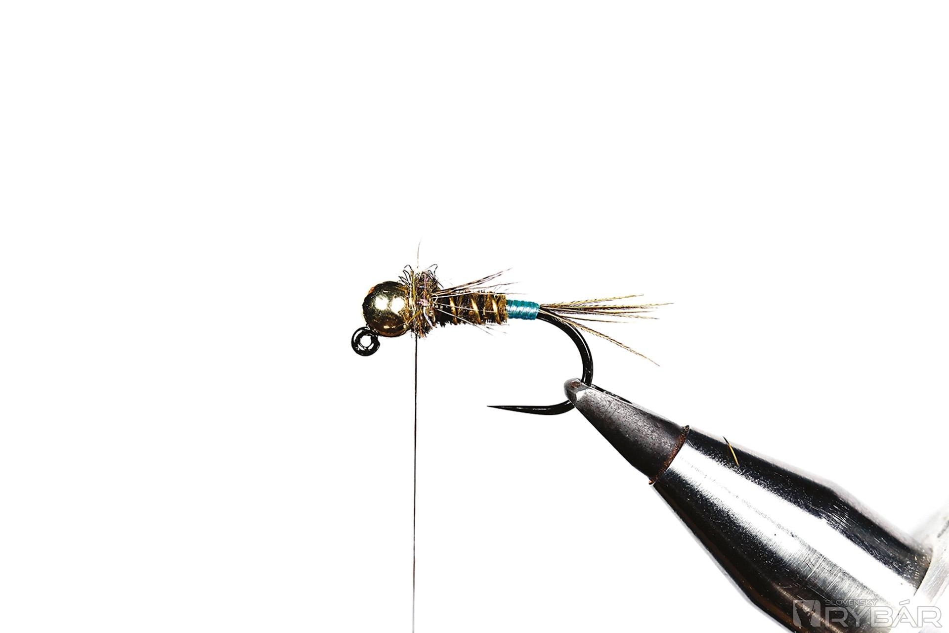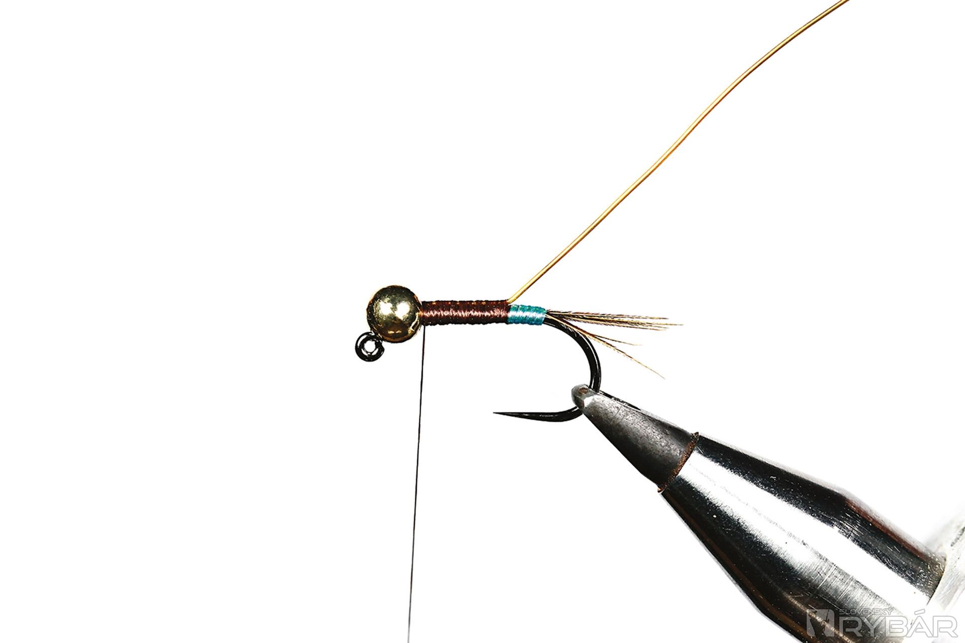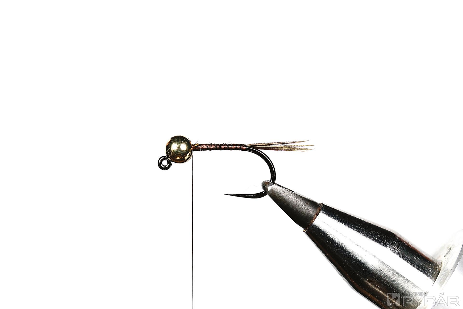 1. Na háčik navlečieme guľôčku, upneme ho do zveráčika a naviažeme štety z bažanta.