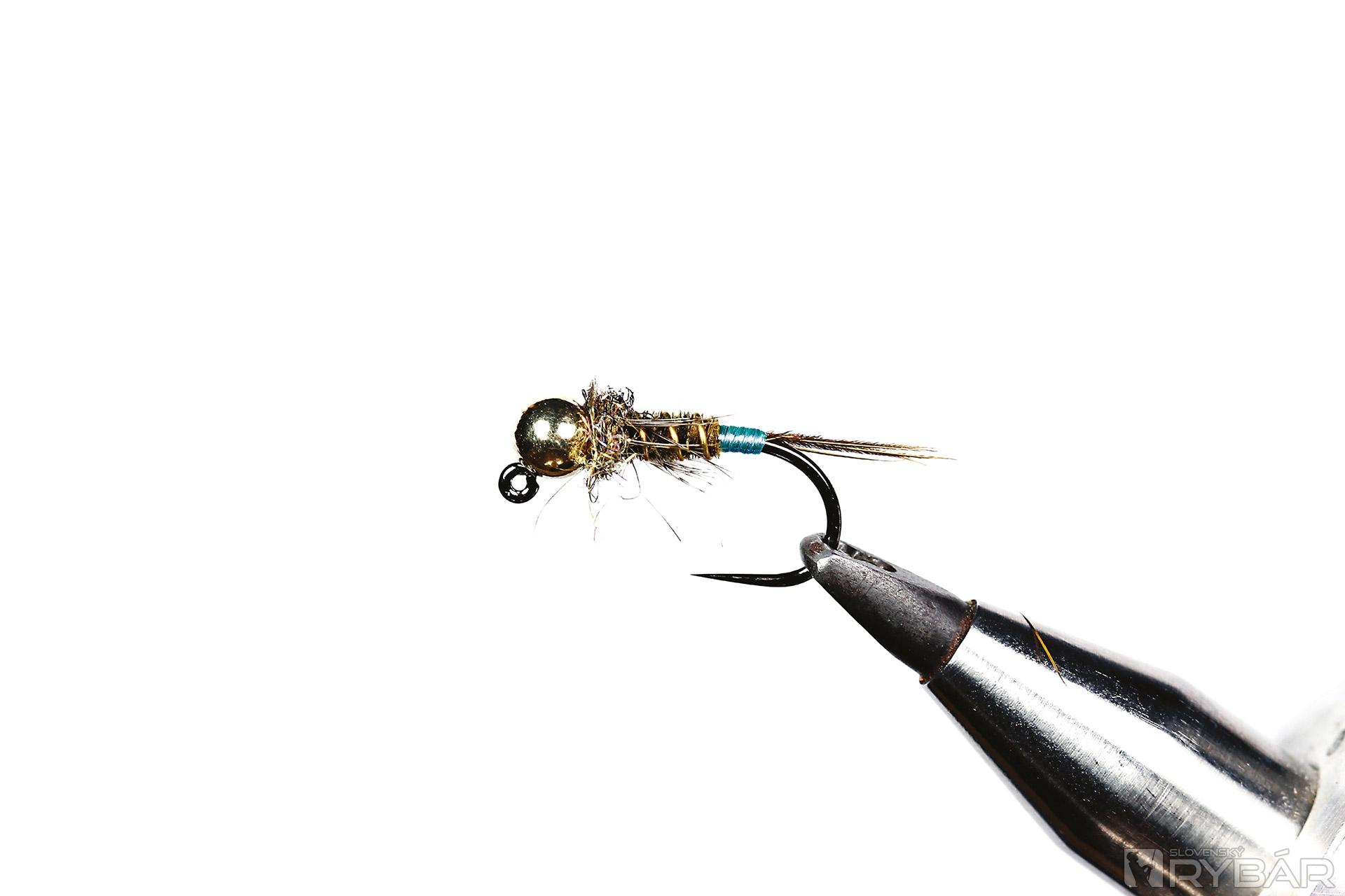 Na prvý pohľad nevýrazná nymfa, ale pomohla mi pri mnohých úlovkoch. Dávam to za príčinu najmä krúžkovaniu hrubším krúžkovacím drôtikom. Vo vode má ryba väčšiu šancu všimnúť si ho a myslieť si, že ide o prirodzené krúžkovanie prírodnej nymfy. Veľmi dobré je aj kontrastné krúžkovanie, keď svetlým drôtikom prekrúžkujem tmavšie telíčko. Extra atraktorom je v tomto prípade aj modrá UV lametka pri zadočku mušky. Musím ešte spomenúť, že krúžkovací drôtik som kúpil v galantérii!