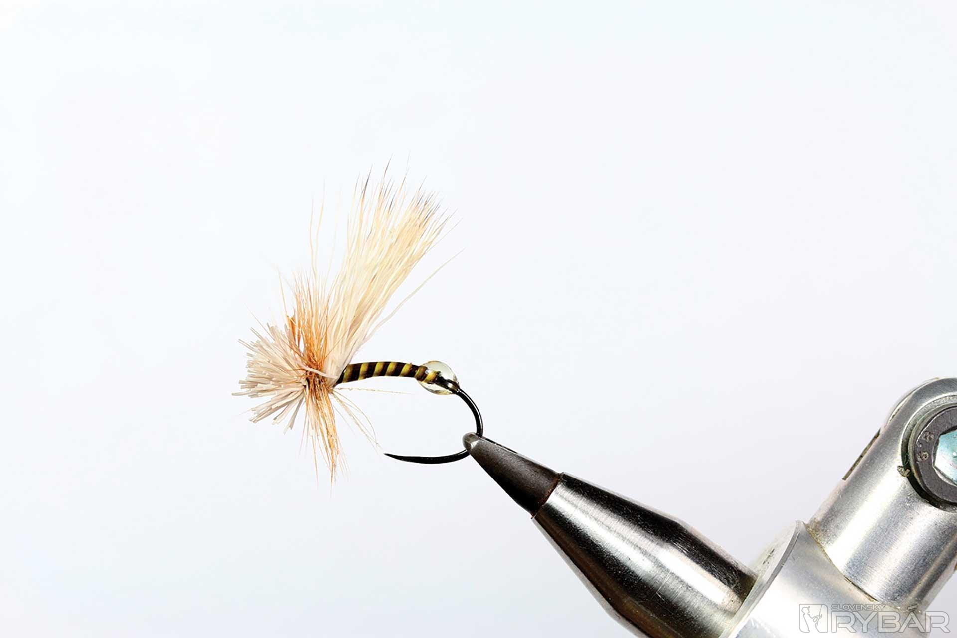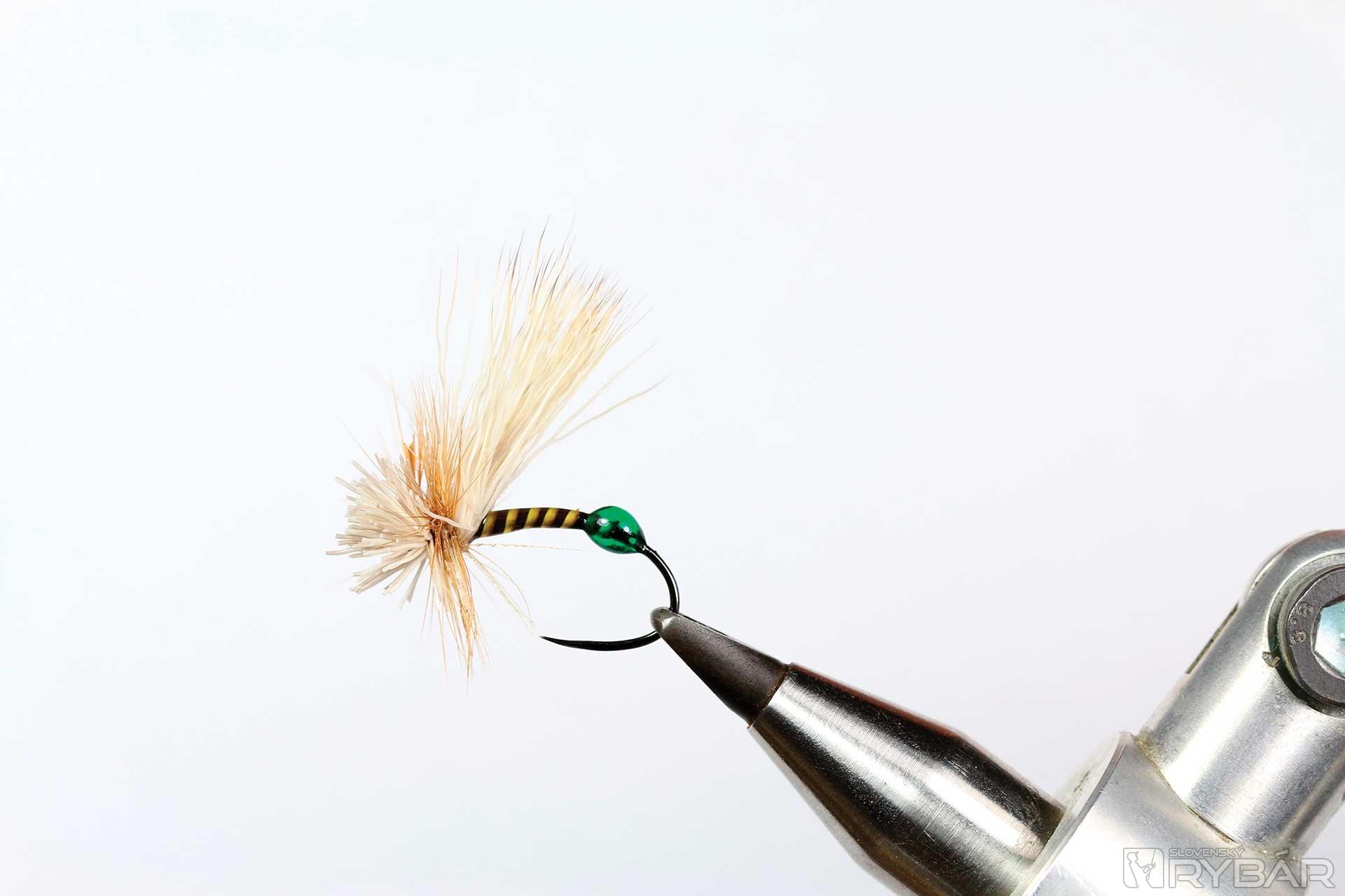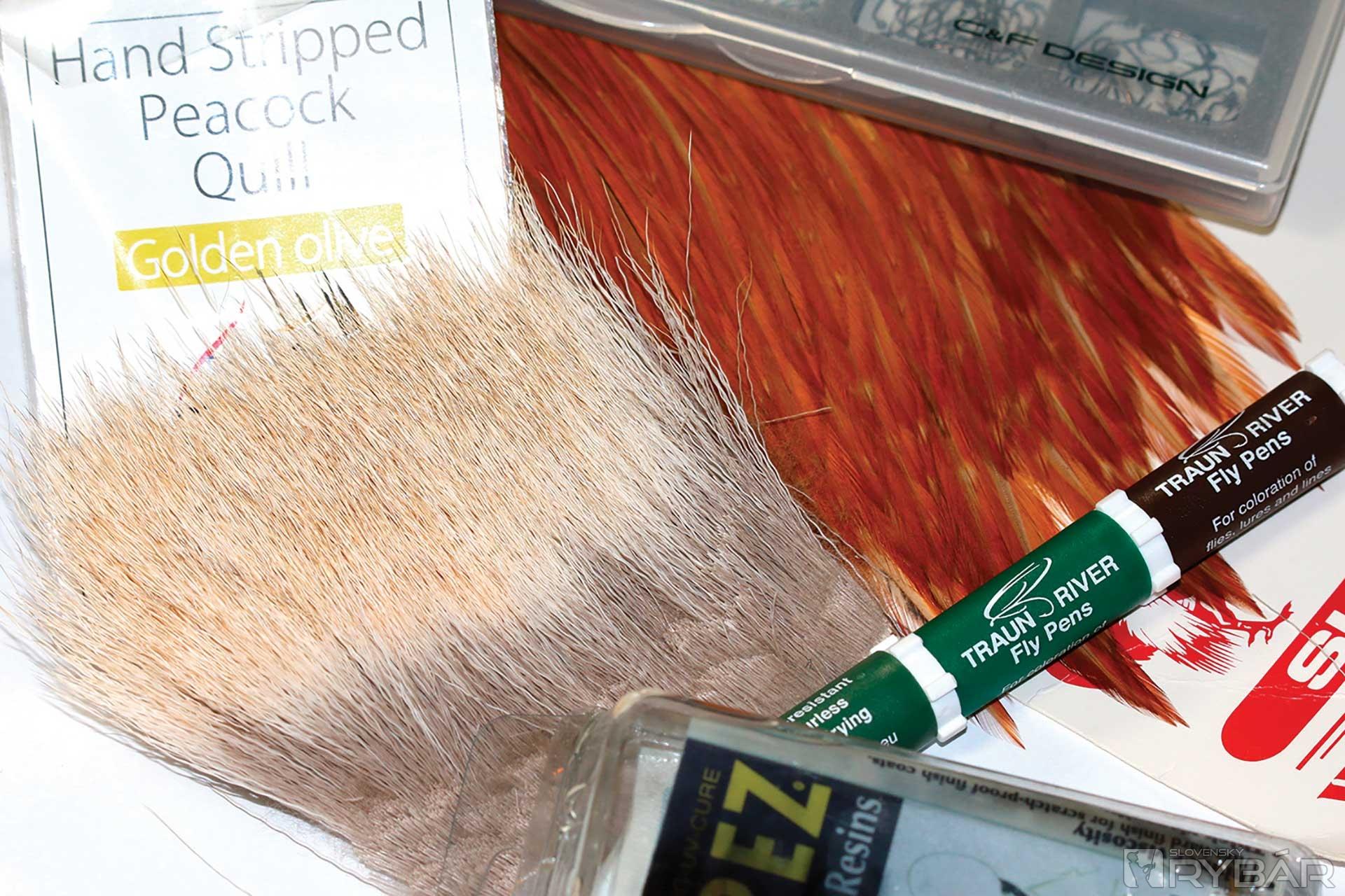 kuklový háčik, tmavá viazacia niť, odriapaný lúč z pera páva, srsť z jeleňa, hrdzavé pierko z kohúta, UV lak, zelená fixka.