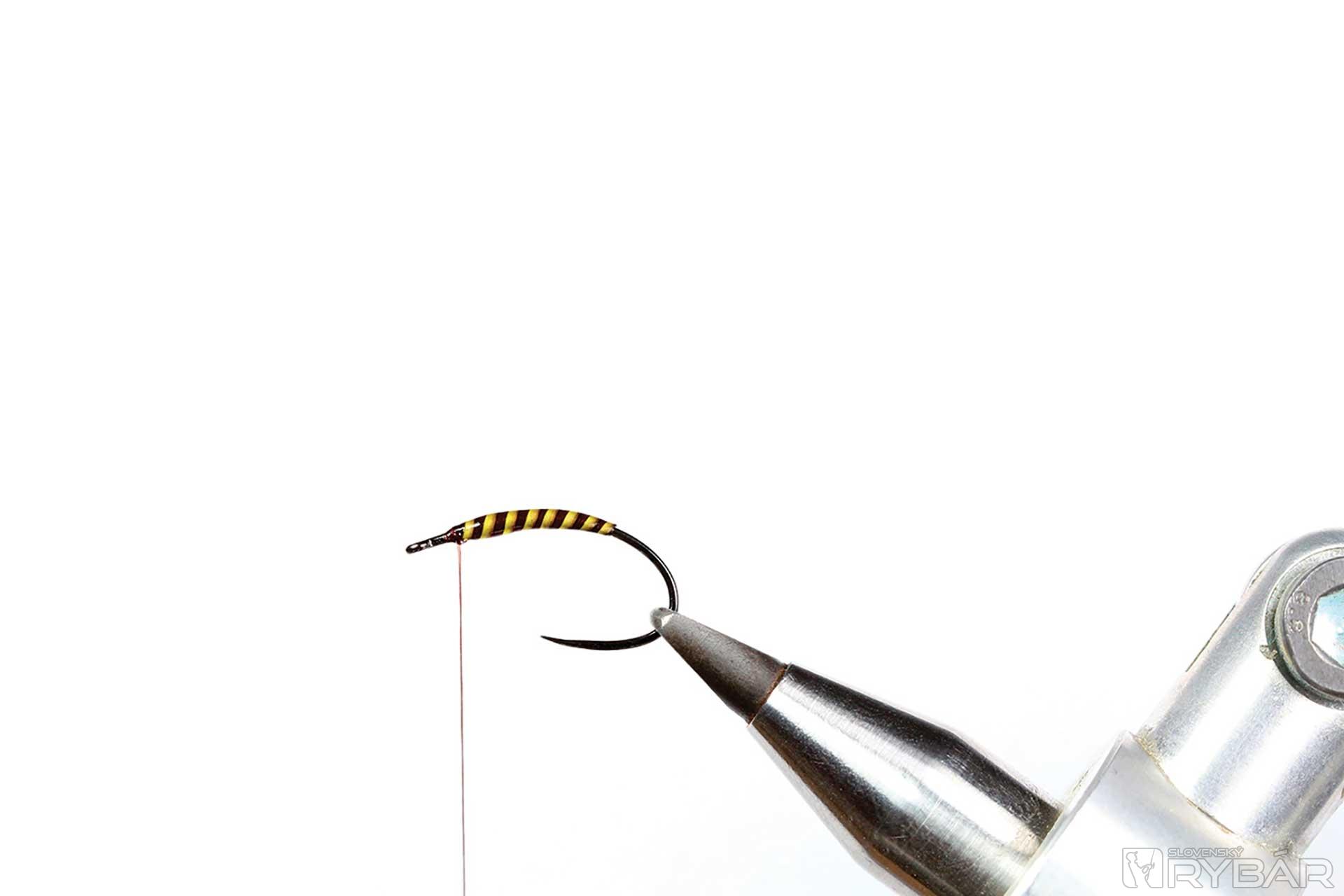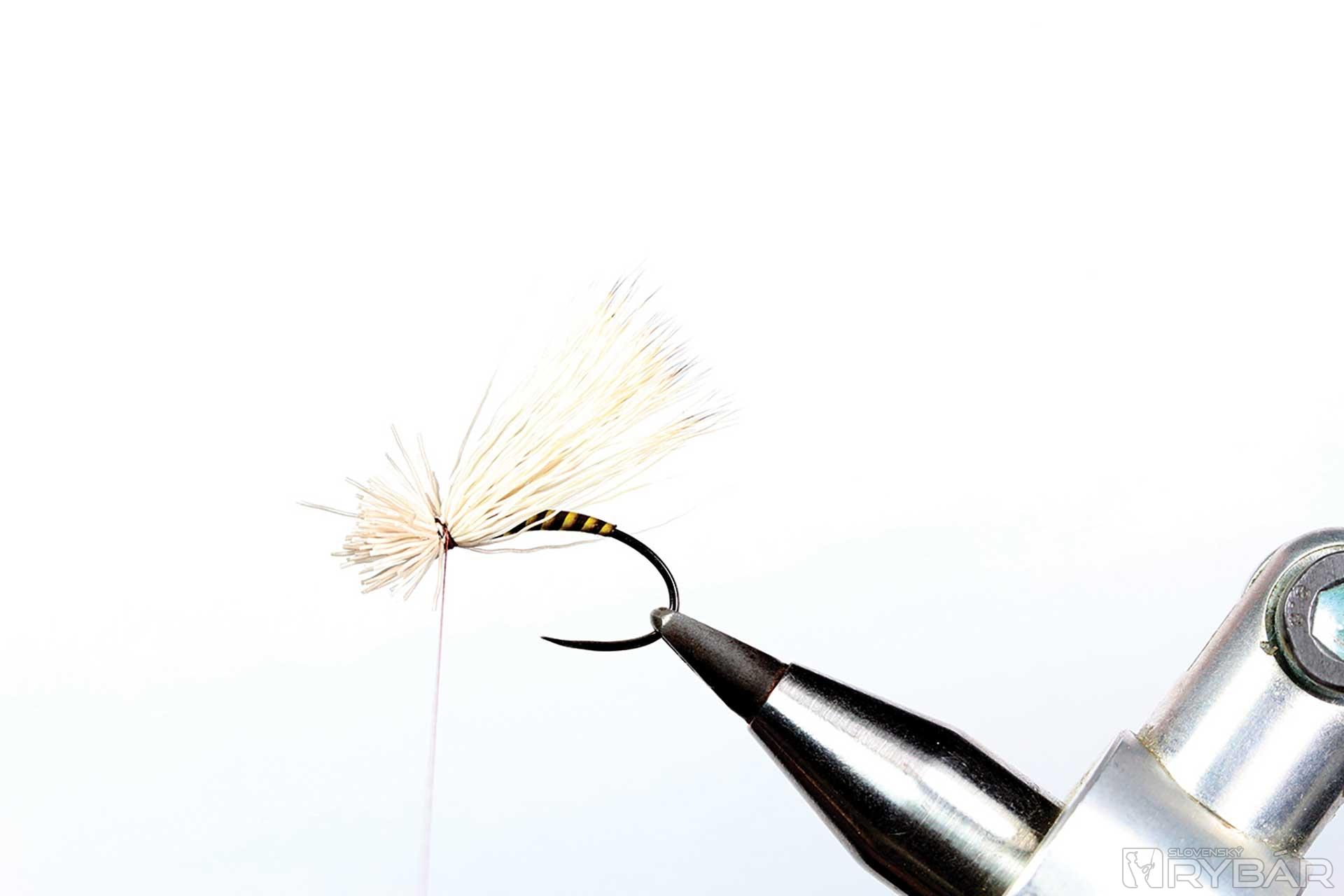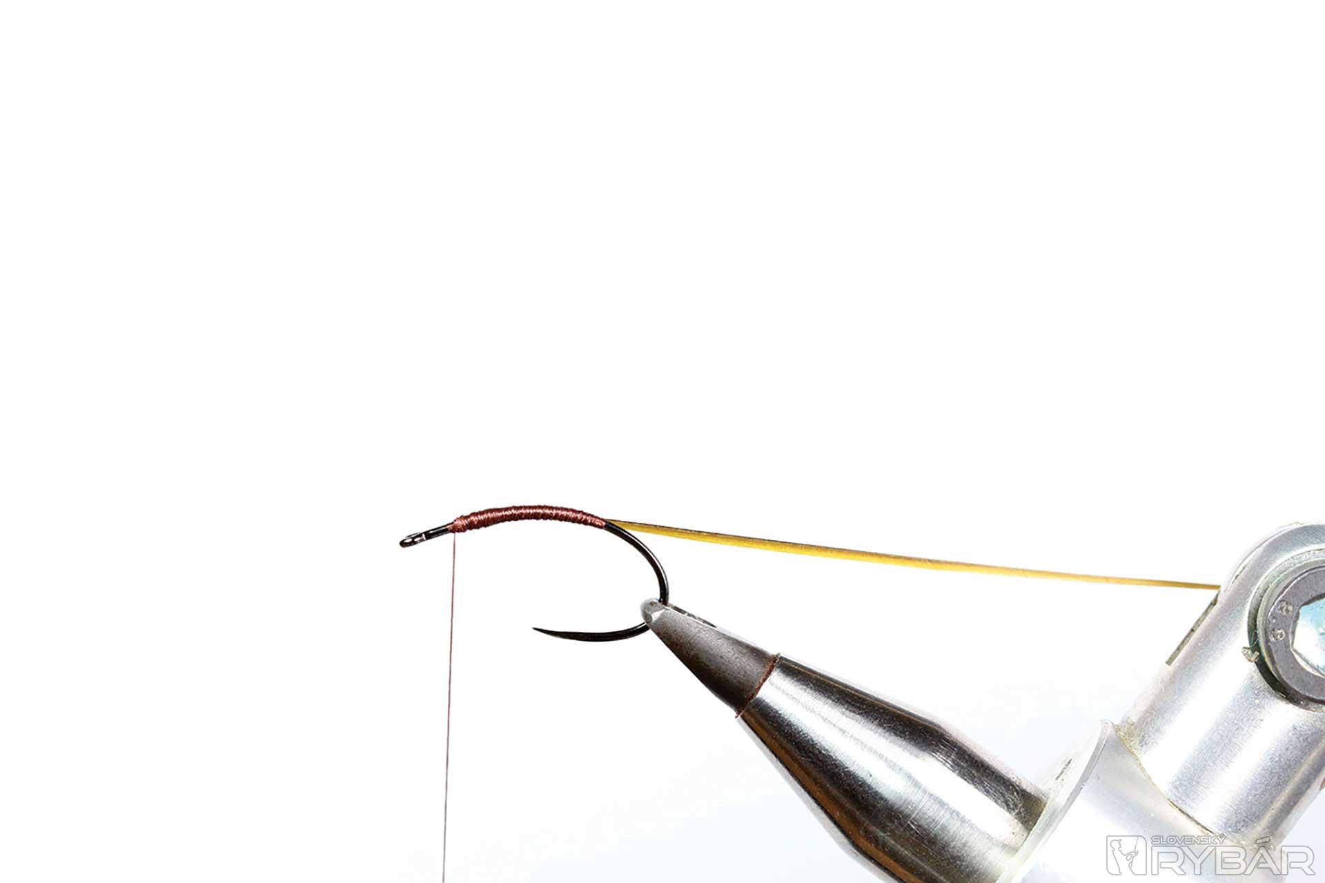 kuklový háčik, tmavá viazacia niť, odriapaný lúč z pera páva, srsť z jeleňa, hrdzavé pierko z kohúta, UV lak, zelená fixka.
