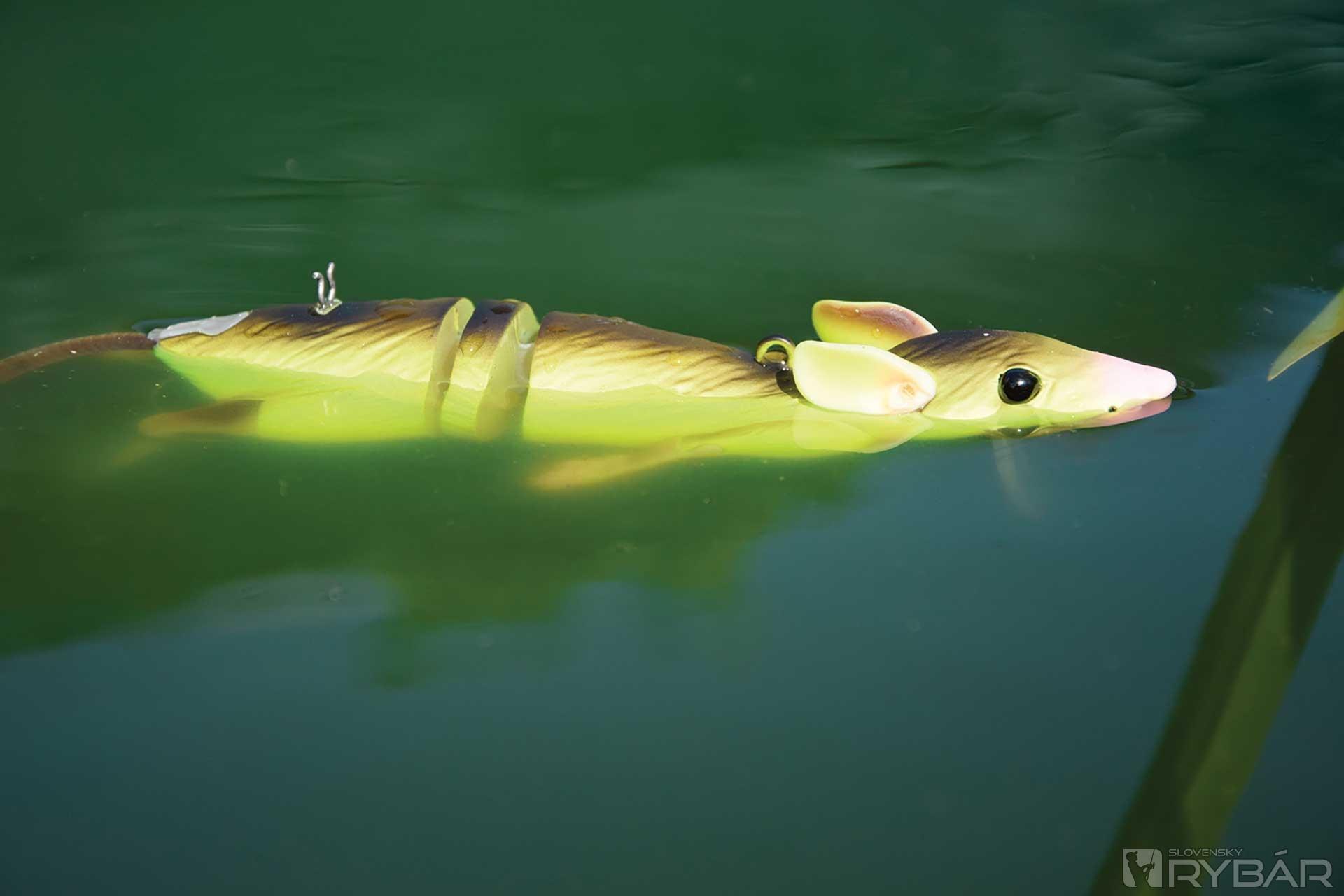 Existujú však aj iné typy nástrah, ktoré som už v úvode načrtol. Sú to rôzne napodobeniny kačíc a potkanov. Dá sa povedať, že je to akási novinka na trhu. Ak si spomeniete ako som začal článok v predošlom čísle o mojej skúsenosti s útokom sumca na rodinku kačíc, tak nepochybne tieto nástrahy majú svoje miesto v každej zbierke nástrah. Ja mám tieto nástrahy tiež, len čo som ich uvidel na trhu, tak som ani chvíľku neváhal či si ich kúpim alebo nie. Síce u nás sú ešte len krátko, sú neoverené, ale už prinášajú prvé úspechy. Kačica je presná napodobenina kačky, má pohyblivé nožičky, ktoré napodobňujú špliechanie nožičkami na hladine, tým láka predátora zaútočiť. Táto nástraha pláva na hladine a vedenie tejto nástrahy je veľmi jednoduché. Jedinou vašou úlohou pri jej vedení je jej pomalé navíjanie nástrahy k sebe. Kačička spraví všetku úlohu za vás. Vedenie kačičky je taktiež pozvoľné, netreba sa nikde ponáhľať a nie je na škodu aj zastať. Stalo sa mi, že sumec nástrahu prenasledoval a čakal pri nástrahe a ako náhle sa nástraha pohla, zaútočil. Toto tiež patrí k tým najkrajším záberom z hladiny. Ak môžem poradiť, tak kačičku je asi vhodné používať celé leto. Potkan je nástraha imitujúca plávajúceho potkana. Na rozdiel od kačičky je vybavený aj lopatkou ako u voblera, ktorá mu dáva ten nezameniteľný pohyb. Nástraha potkan veľmi dobre lieta pri nahodení. Mne sa najviac osvedčil v období žatvy, keď sa polia kosia a hlodavce sa presúvajú, a je tým pádom aj zvýšený pohyb na hladine. A, samozrejme, najväčšie šance sú, keď chytáme niekde pri susediacom poli s našou lokalitou kde chytáme ryby. Tak ako som písal, tieto nástrahy sú ešte málo na trhu, a tým aj používané krátky čas, ale prinášajú úspechy a keď sa človek zamyslí, tak aj majú byť prečo úspešné. Nebojte sa preto experimentovať! Dúfam, že sa vám moje skúsenosti a rady budú páčiť a prispejú k tomu, aby ste boli úspešnejší pri vode ako ste boli doteraz, a podarí sa vám chytiť nejakú tú vysnívanú peknú rybu. Prosím, netreba však zabúdať na to, že keď budeme odnášať tieto ryby od vody, tak sa nám aj tie ciele prekonávať samých seba, budú stále horšie a horšie zdolávať. Veď treba si chrániť to čo máme doma a starať sa o to, aby sme aj doma mohli chytať kapitálne ryby, ako sa chytajú aj v zahraničí.