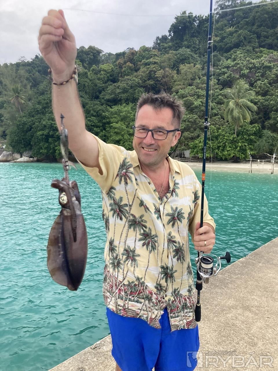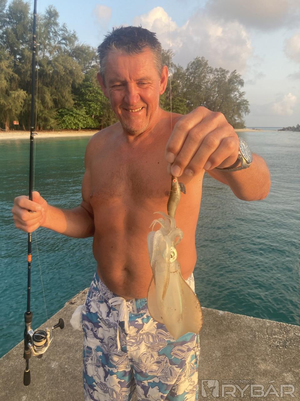 Všetci domorodci chytali na výrazné farby, tak som zámerne vyskúšal prirodzenú hnedú farbu krevety. V malej vode pri brehu som si vyskúšal, ako to funguje, ako sa nástraha správa. V podstate bolo treba ťahať na prepad ako pri love zubáča. Veľa nám pomohlo to, že sme pri šnorchlovaní videli dva kalamáre, ako sa správajú. Väčšinu času plávali úplne pri dne. Tak som to tak vyskúšal ťahať. Asi na desiaty hod som zacítil záber, ale nepremenil som ho, nevedel som, či to bola ryba alebo kalamár. Tak som tam začal znova hádzať a podarilo sa. Vlastne som ani nevedel, čo som chytil, len to zrazu oťaželo a na vode sa zjavil tmavý mrak – to kalamár vystrekol farbivo. Po pár metroch znova. Ono to ťaháte ako handru, aj sa to tak správa. Môj prvý kalamár na udicu. Feri sa zabával chytaním večere na mäso. Väčšie ryby sme doniesli do reštiky, kde nám ich pripravili na večeru.