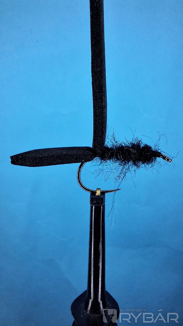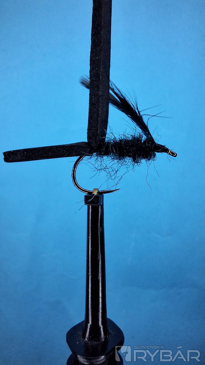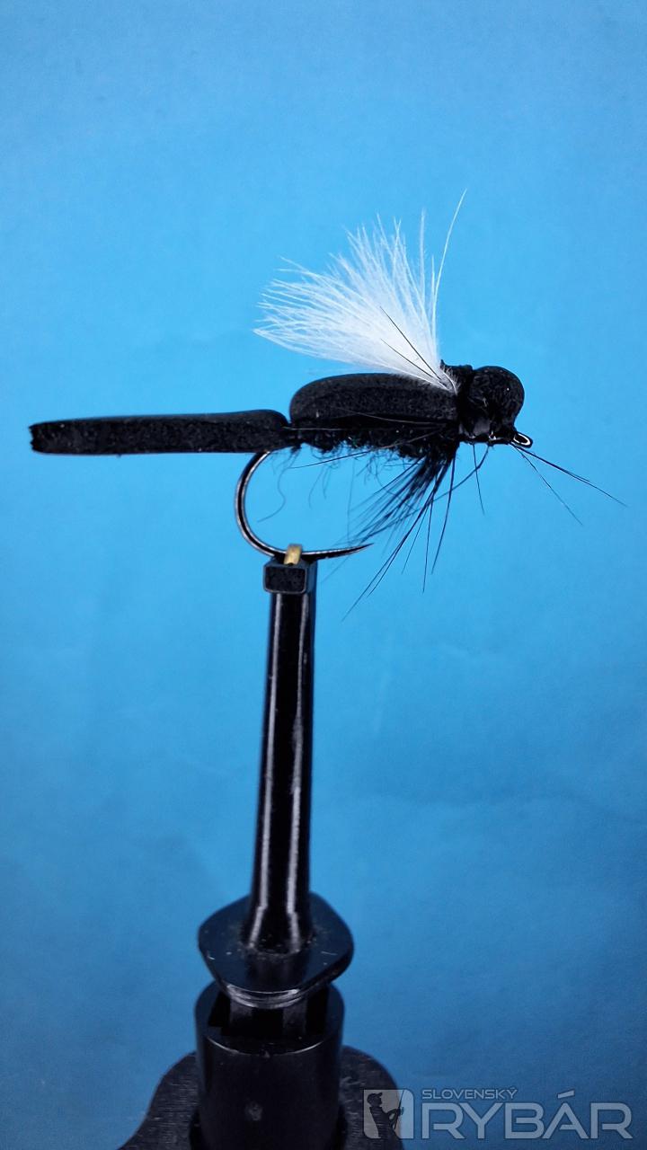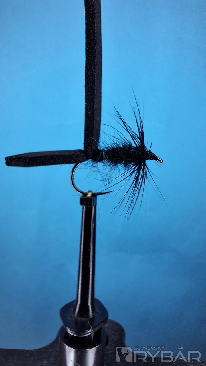 Materiál: čierna viazacia nitka, háčik č. 10, čierna pena, čierne pierko zo sliepky, biele CDC, čierny GLS dabing.