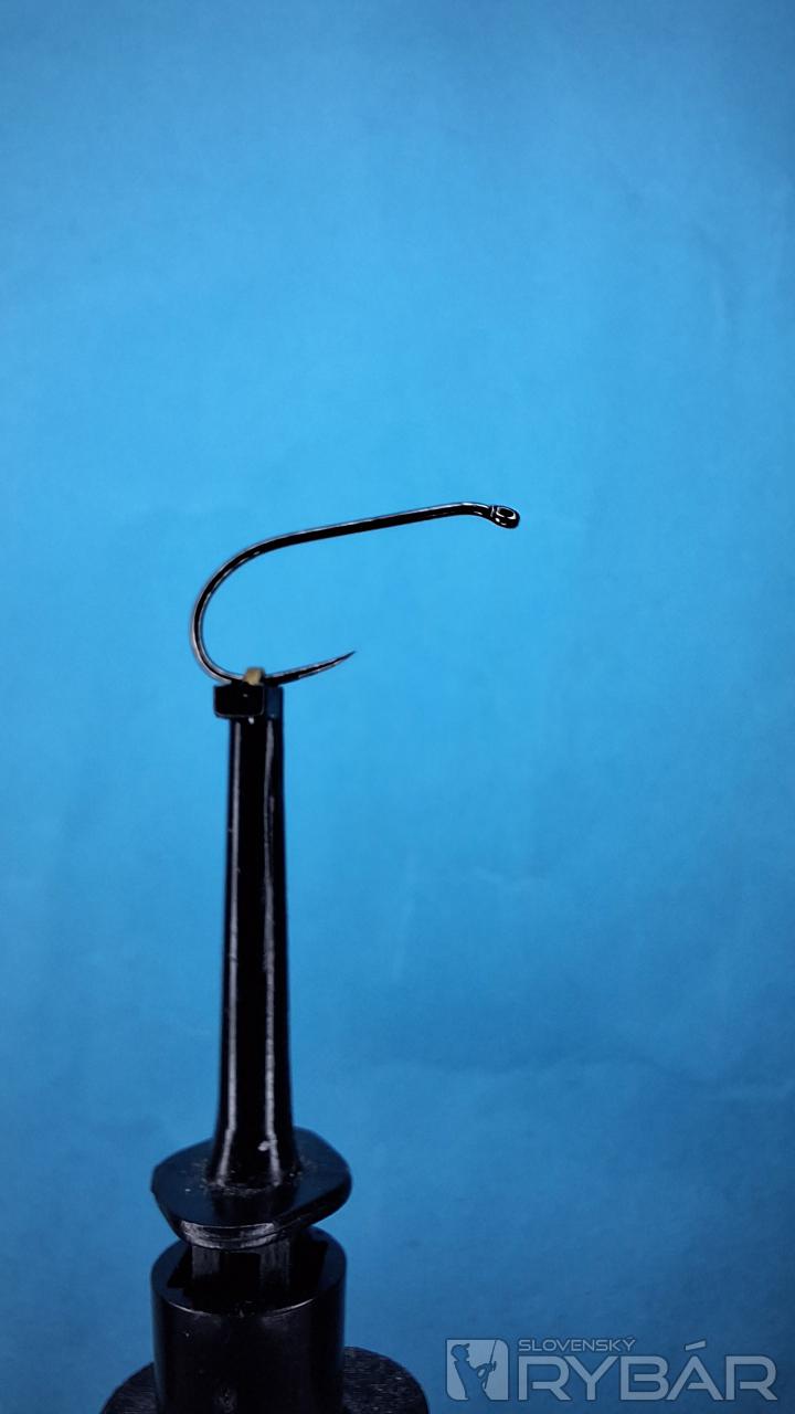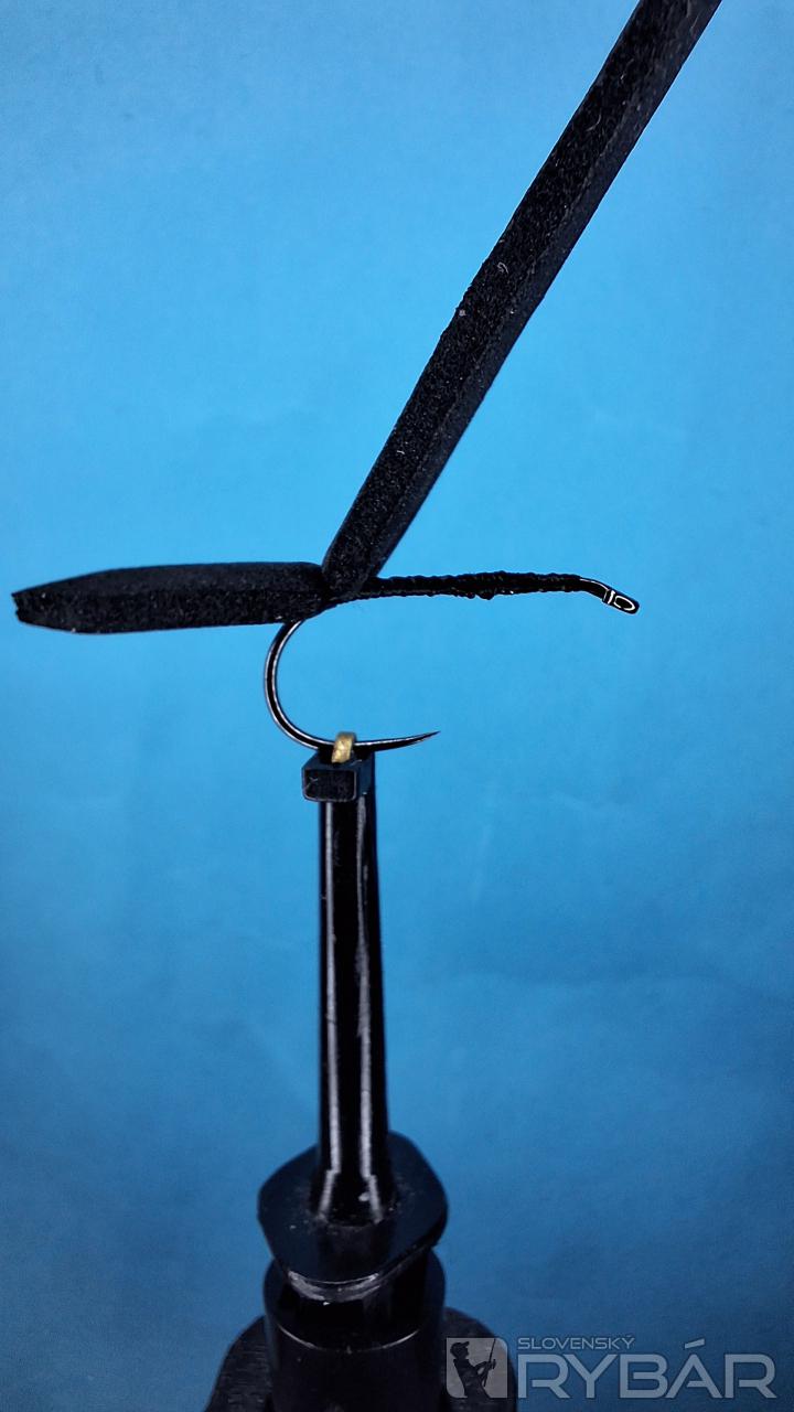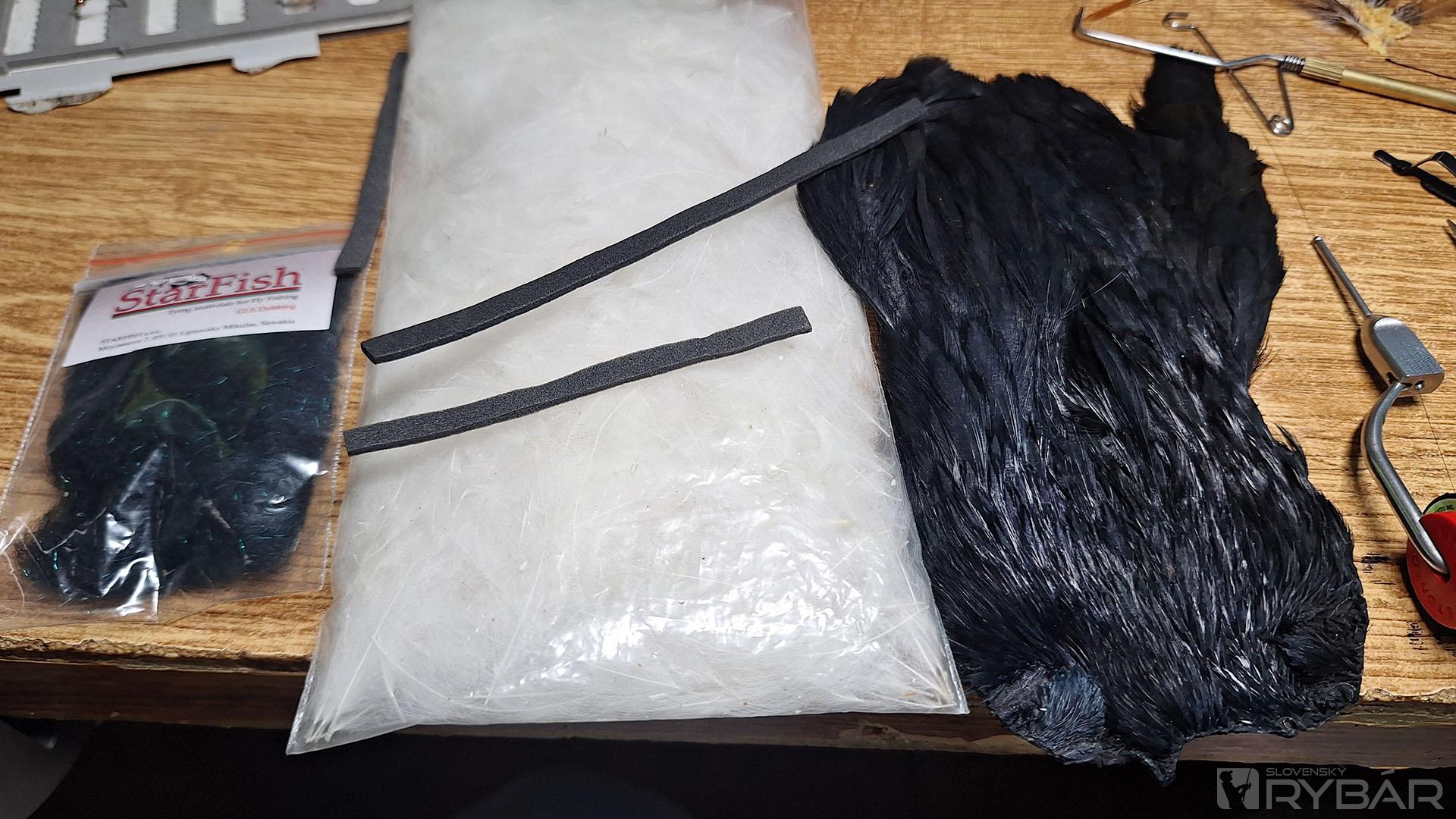 Materiál: čierna viazacia nitka, háčik č. 10, čierna pena, čierne pierko zo sliepky, biele CDC, čierny GLS dabing.