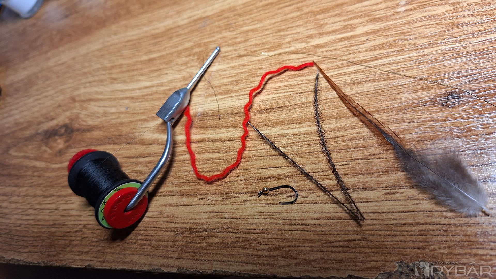 Použitý materiál: svetlý skalp zo sliepky, háčik veľkosť 10 Dohiku 302, hlavička veľkosti 3,5 mm, zlatý drôtik, pierka z páva, červená vlna.