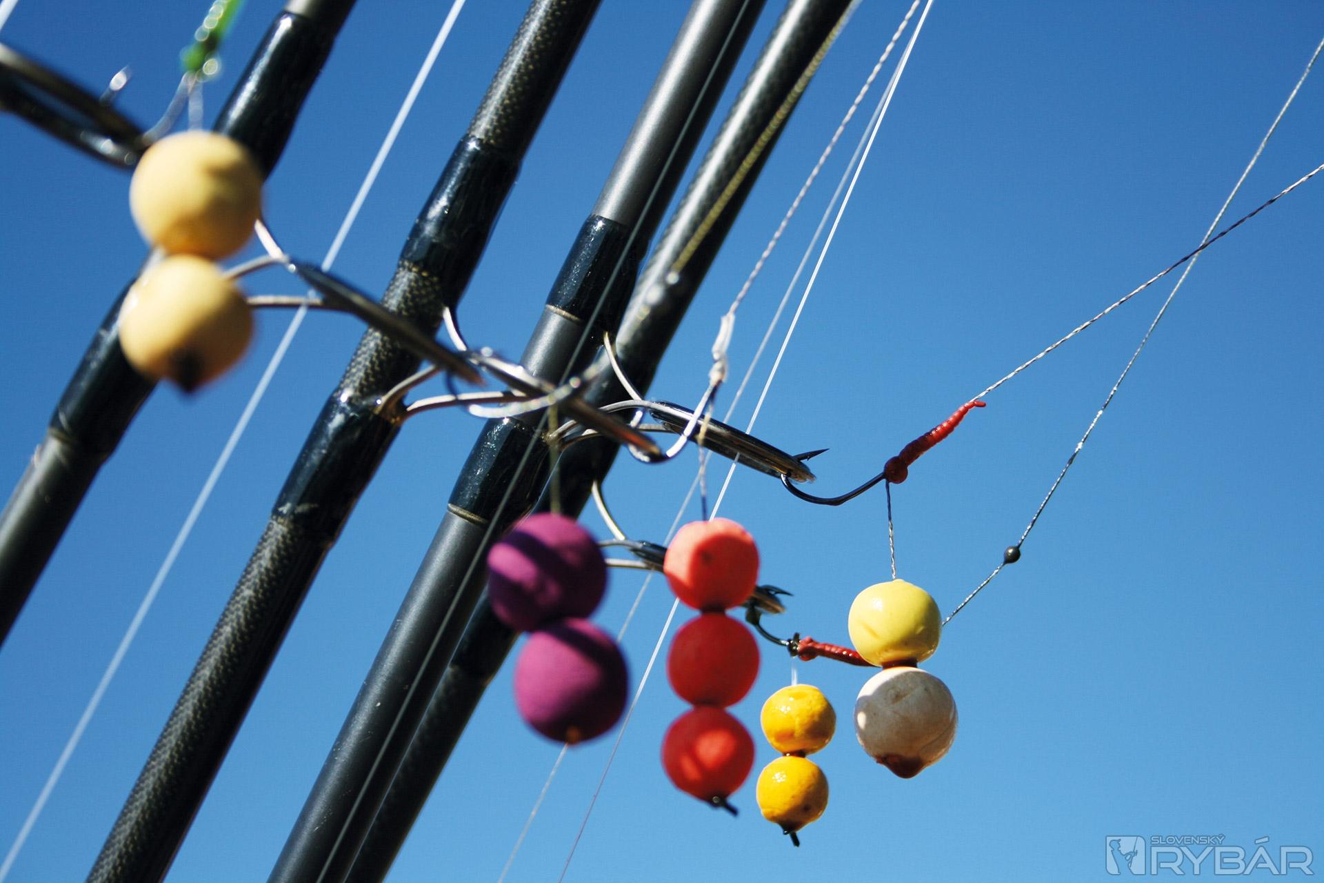 Prúty umiestňujem na svahu v hĺbke od 3 do 7 metrov, ďalšie dva ležia v tráve, zvyšné prúty nahodím na kraj kanálu do 8 metrov a jeden na kraj vodnej pláne pri ostrovčeku v zátoke do 5-metrovej hĺbky. Ako nástrahy volím naozaj pestrý výber pop-up, oranžové a žlté na plytčine a biele a fialové na hĺbke, alebo pár zrniek kukurice na vlase a výber je kompletný.