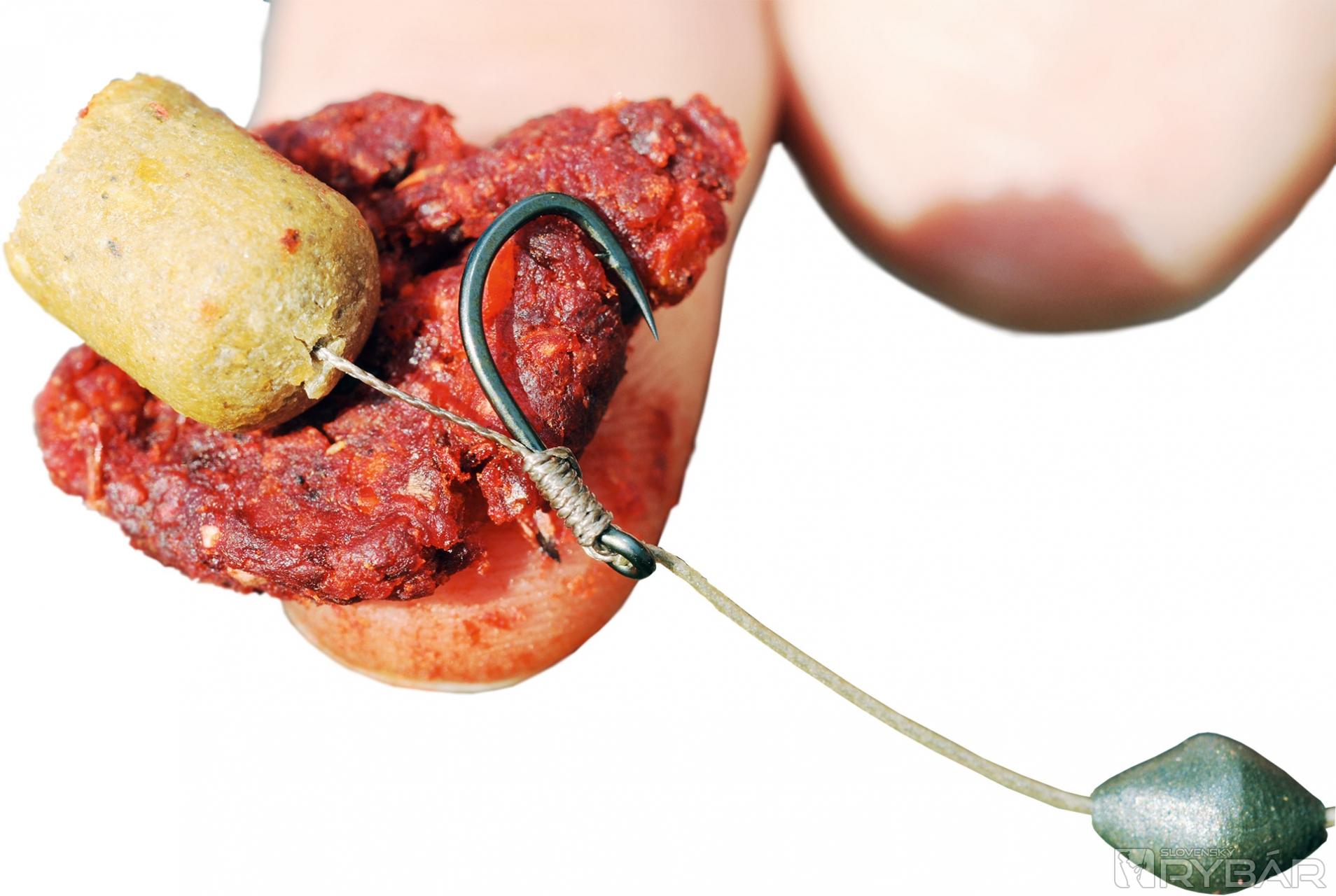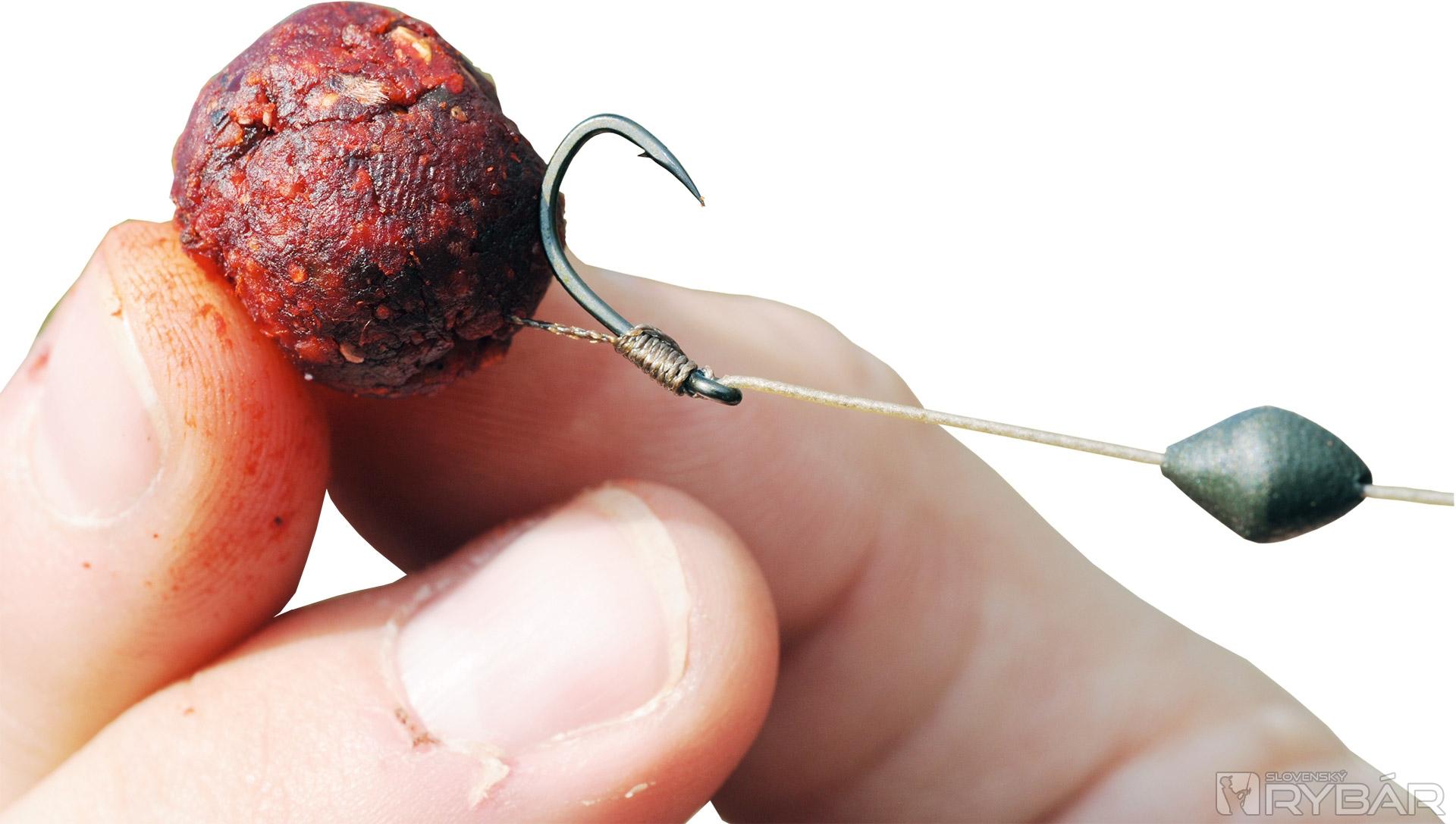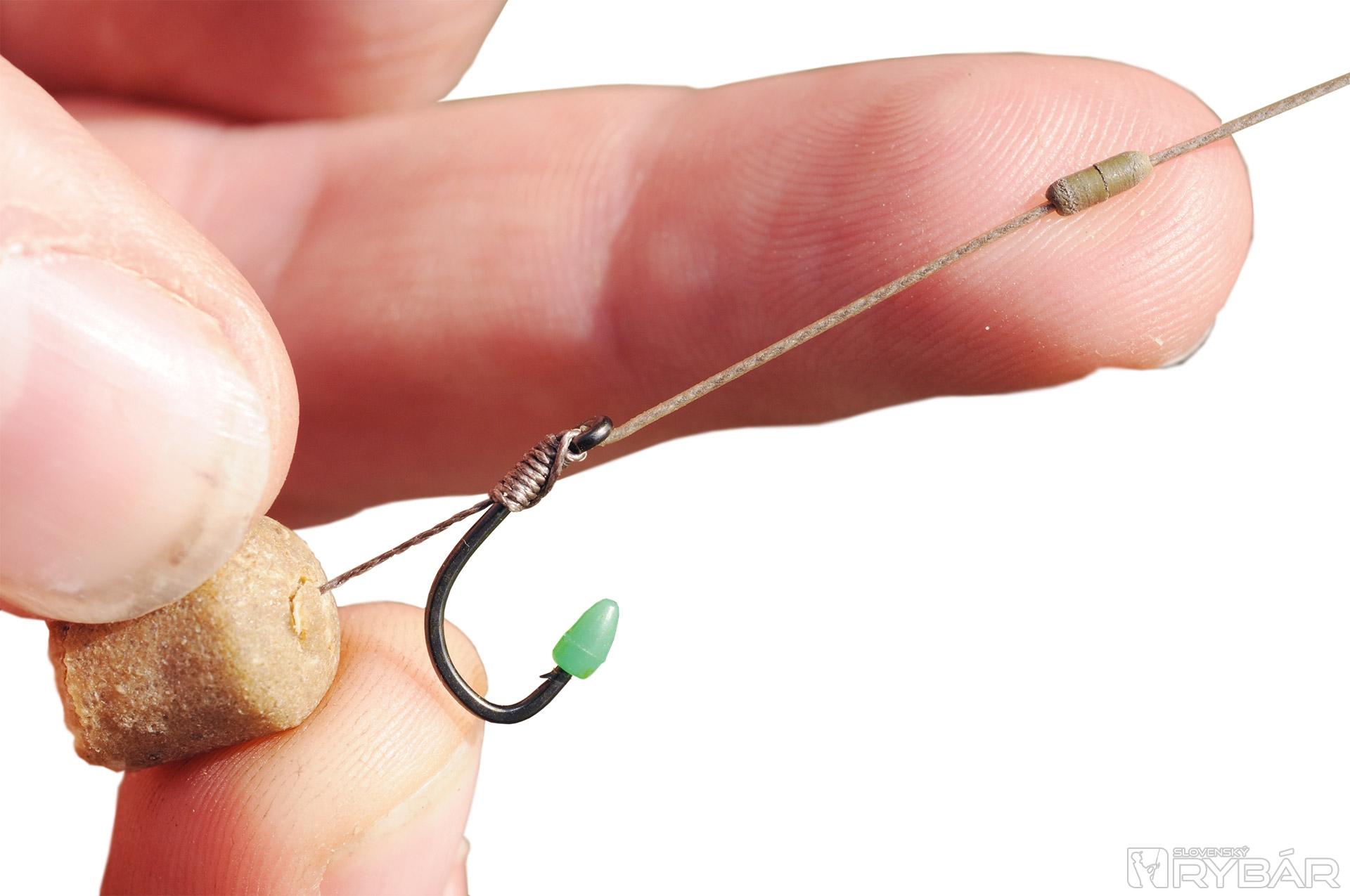 Dodatočnú záťaž umiestňuje približne štyri a pol centimetra od háčika. „Robím to tak preto, aby sa háčik rýchlejšie otočil a usadil v tlamke kapra.“ Potom dodáva: „Je to niečo, čo robím dosť dlho.“ Taktiež neodstraňuje povrch z nadväzcovej šnúry až k očku háčika, tak, ako to robí väčšina rybárov. Pýtam sa ho prečo.