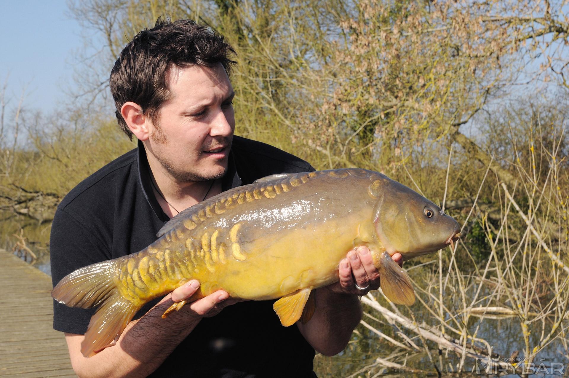 Po ďalších hrozných chvíľach bez záberu sa cez obed dostavil záber. Garth zasekáva a kapor „sedí” na vlasci. Táto ryba ho poriadne vytrápila, keď zopárkrát zamierila pod drevenú plošinu, na ktorej sedíme. Garthova silnejšia zostava sa oplatila a rybu sa nám darí čoskoro vyloviť. Rybu ukladáme na dosky, aby sme ju zvečnili na zopár obrázkoch. Nervózne sa zmieta a to fotenie veľmi neuľahčuje. Po tejto procedúre ho vážime, má niečo cez 6,5 kg. Je o trochu väčší než prvá ryba dňa. Typická clattercotská veľkosť.
