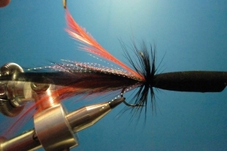 Potom si naviažeme za hlavičkou viazaciu niť. Najprv naviažeme po oboch stranách jeden pár mäkkých kosierikov z kohúta; môžeme pri čiernej hlavičke skombinovať napríklad čierny a červený kosierik. Medzi pierka naviažeme snopček lesklých lametiek, tie môžu byť čierne, medené, perleťové alebo klasický krútený Crystal Flash. Nakoniec si vyberieme zo skalpu jeden alebo dva veľké kosieriky, ktoré majú dlhé lúče.