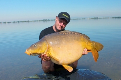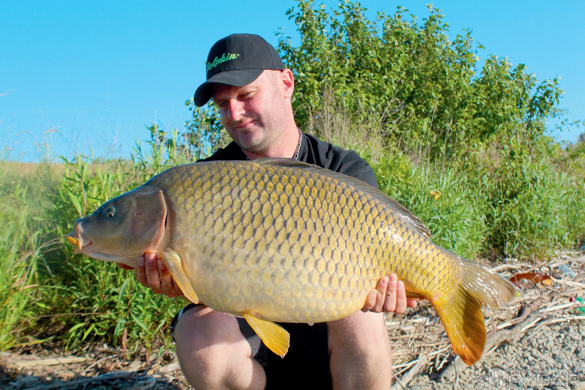 Ryba sa drží pri dne a stále ťahá a ťahá. Dlhé a prudké výpady. Hneď som vedel, že ide o lepšiu rybu. Asi po desaťminútovom boji sa prvýkrát ukázal môj protivník. Vidím, že je to kapor veľký, ale nízkej formy. Podobral som ho teda a šup s ním na breh. Krásny šupináč bojovník, ktorý meria skoro meter. Odhadujem mu okolo 12-13 kg. Kapra sme odfotili a ihneď putuje naspäť do vody medzi svojich. Bol posledným záberom toho dňa.