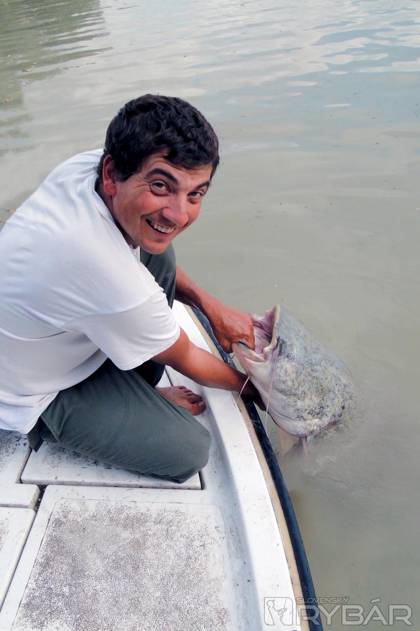 S pritvrdením po mojej slovnej hre prepína tiež na silový súboj. Od tohto momentu má ryba chvost skoro stále na hladine, náčinie však drží pokope. Nie je to žiadna hračka, ale Anti sa naozaj snaží, dokazuje to aj jeho červená tvár. Dostávame sa však k bodu, keď sumec priľahne na hladinu a už nemá síl na ďalší boj. Natiahnem ho do člna a po meraní zisťujeme, že za krátke obdobie máme troch kráľov z tejto rieky. Z moje strany cca 200 cm sumca a Anti so včerajšou rybou 247 cm a dnes cca 220 cm. Po vypustení ryby ideme triumf osláviť degustáciou vínnych produktov, lebo život je krásny a užiť si ho treba vedieť.