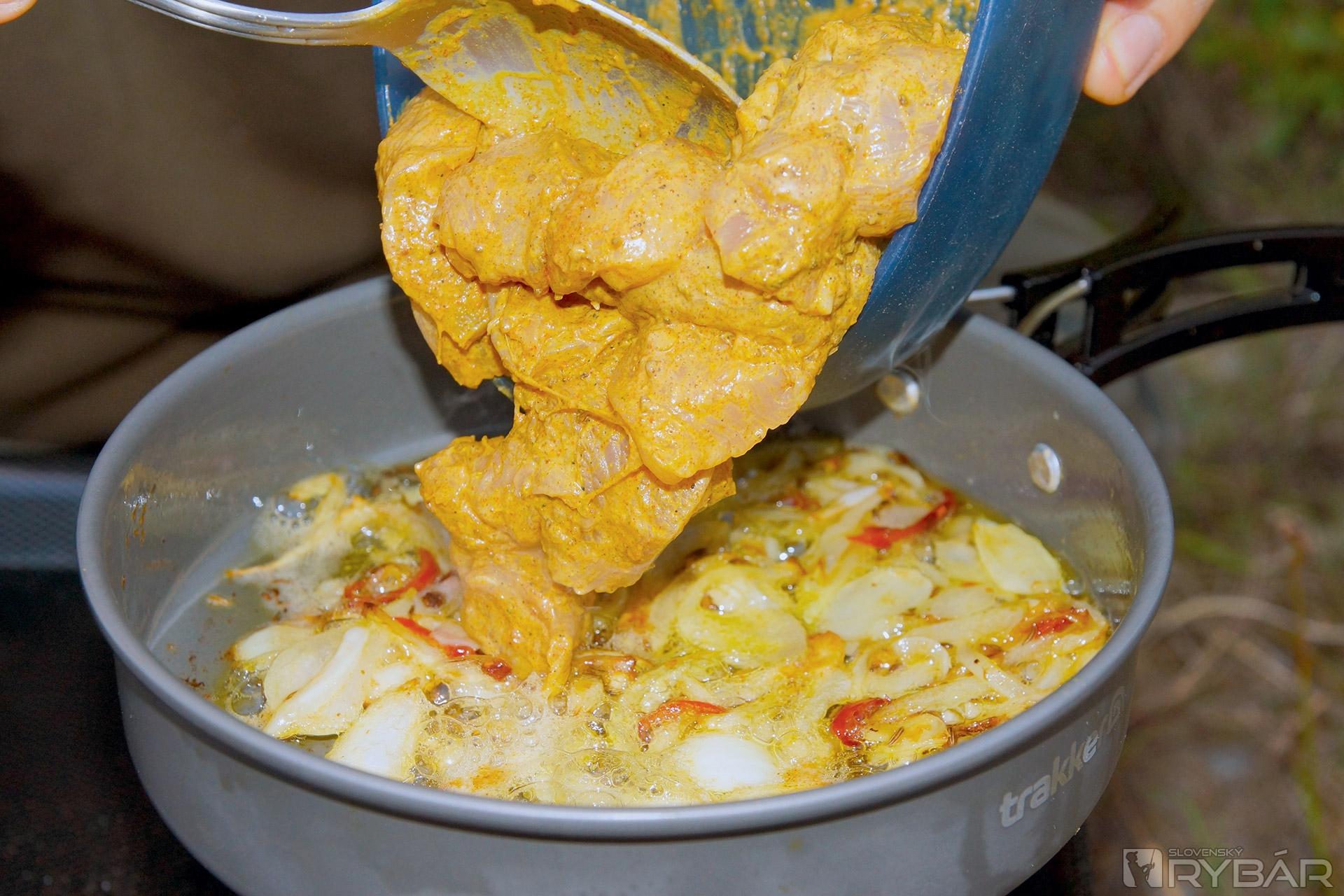Ak nemáte čas vopred si predpripraviť marinované kuracie kúsky už doma, tak jednoducho pri vode, nakrájajte kuracie prsia na malé kúsky a ponorte ich do marinády, ktorú si pripravíte zo sladkej smotany, do ktorej pridáte kari korenie, mletú rascu, štipľavú papriku, čierne korenie, mletý zázvor a citrónovú šťavu.