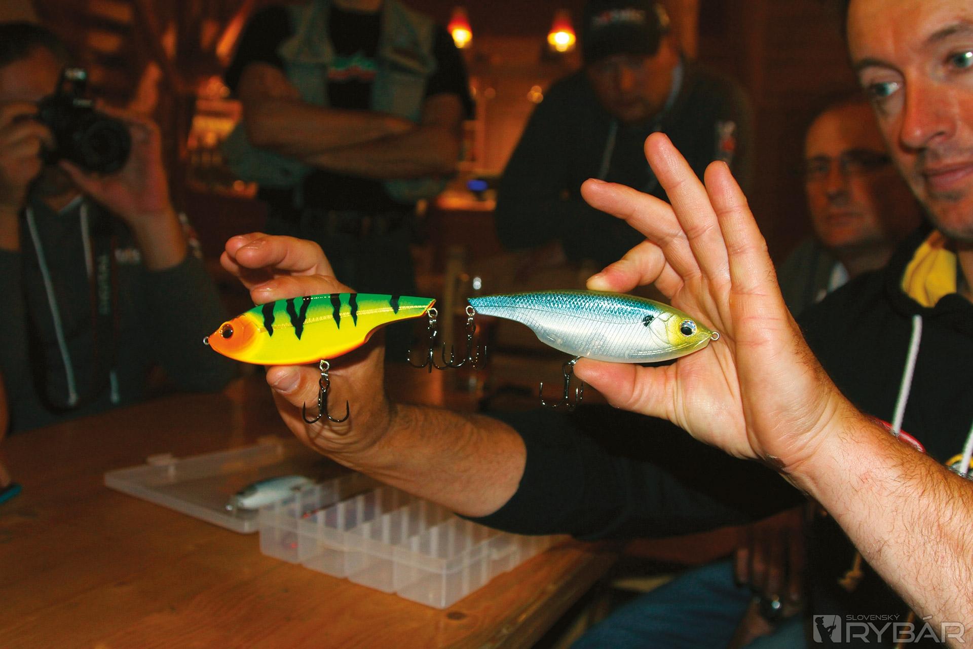 Druhá škatuľa obsahovala voblery Sébile. Neboli to žiadne drobce. Veľké voblery na veľké ryby. Zaujímavé boli hlavne Spin Glider s prídavným rotačným listom na konci nástrahy. Swingtail Minnow je dvojdielny vobler a je výnimočný tým, že aj jeho zadná časť obsahuje guľôčku, ktorá ho vyvažuje, a tak pri nahodení nástrahy zabezpečí, že dopadne do vody zadnou časťou. Takto nehrozí, že sa nástraha zamotá do šnúry. Voblery Cranking Shad patria medzi Sylvainove obľúbené. Rovnako je to obľúbený model Kevina Hernandeza, ktorý minulý rok ulovil viac ako 100 šťúk nad 100 cm. Článok ste si mohli prečítať v májovom vydaní Slovenského RYBÁRA. Kevin nám potom porozprával aj to, aké montáže používa pri love veľkých šťúk a ukázal niekoľko spôsobov nastraženia.