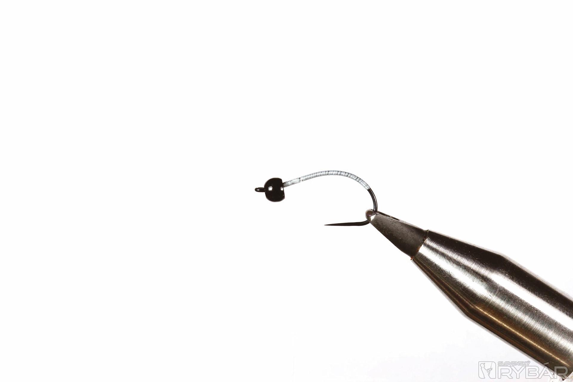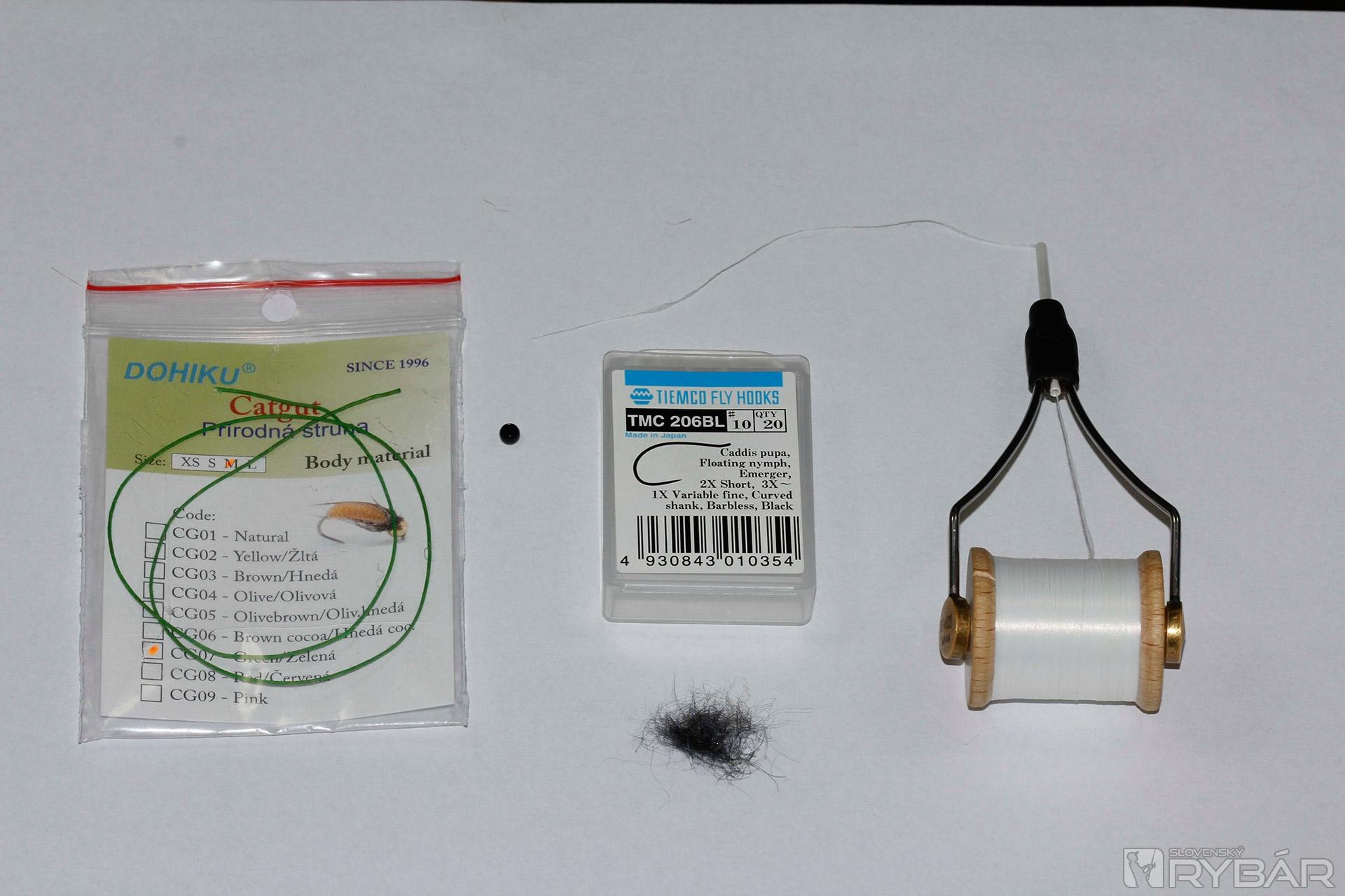 Pupový, alebo krivákový háčik (napr. TMC206), biela viazacia niť, zelený catgut, čierna volfrámová guľôčka, kúsok čierneho dabingu.